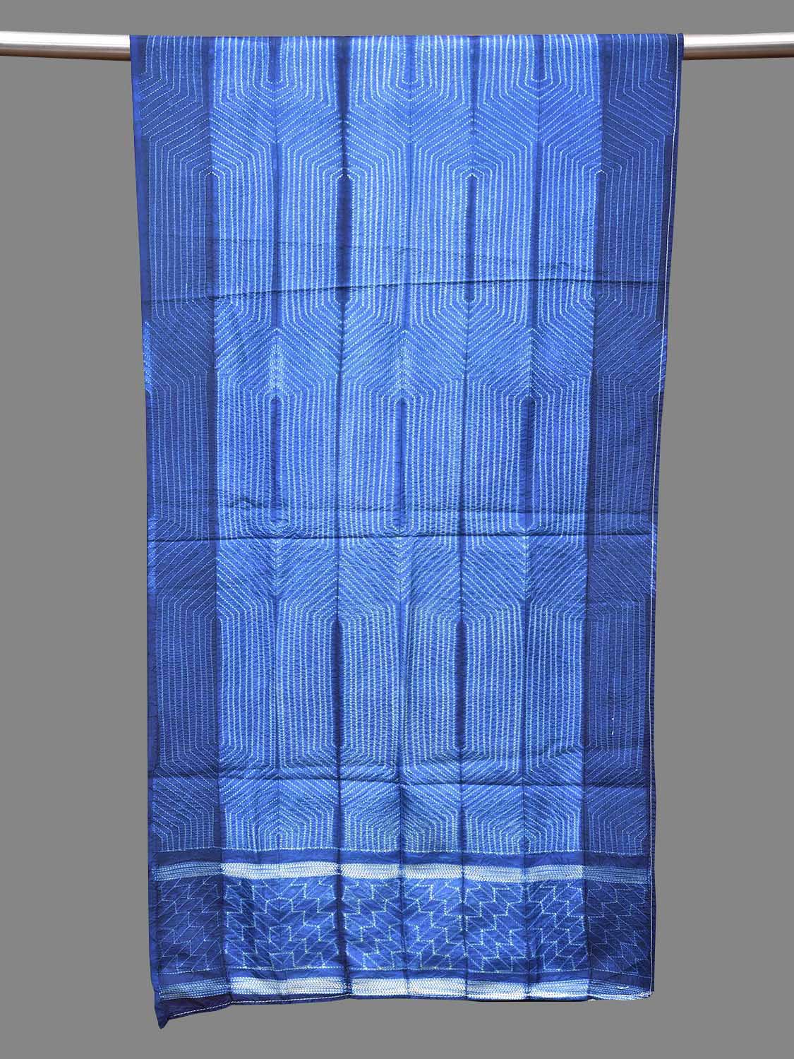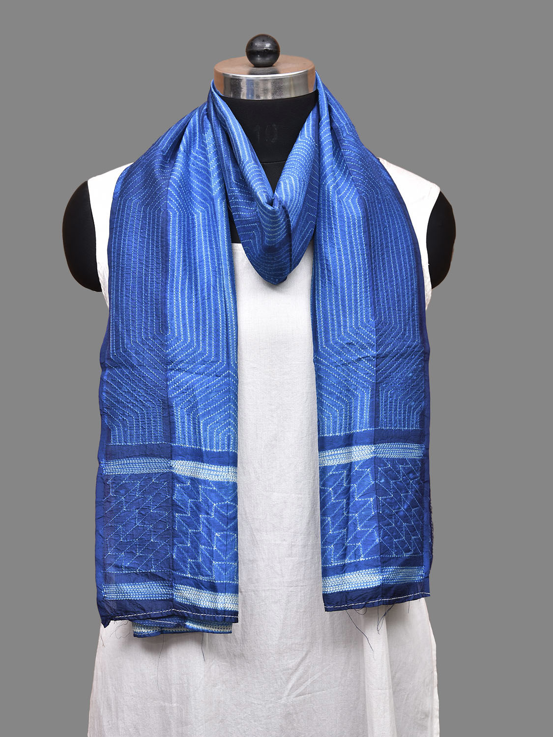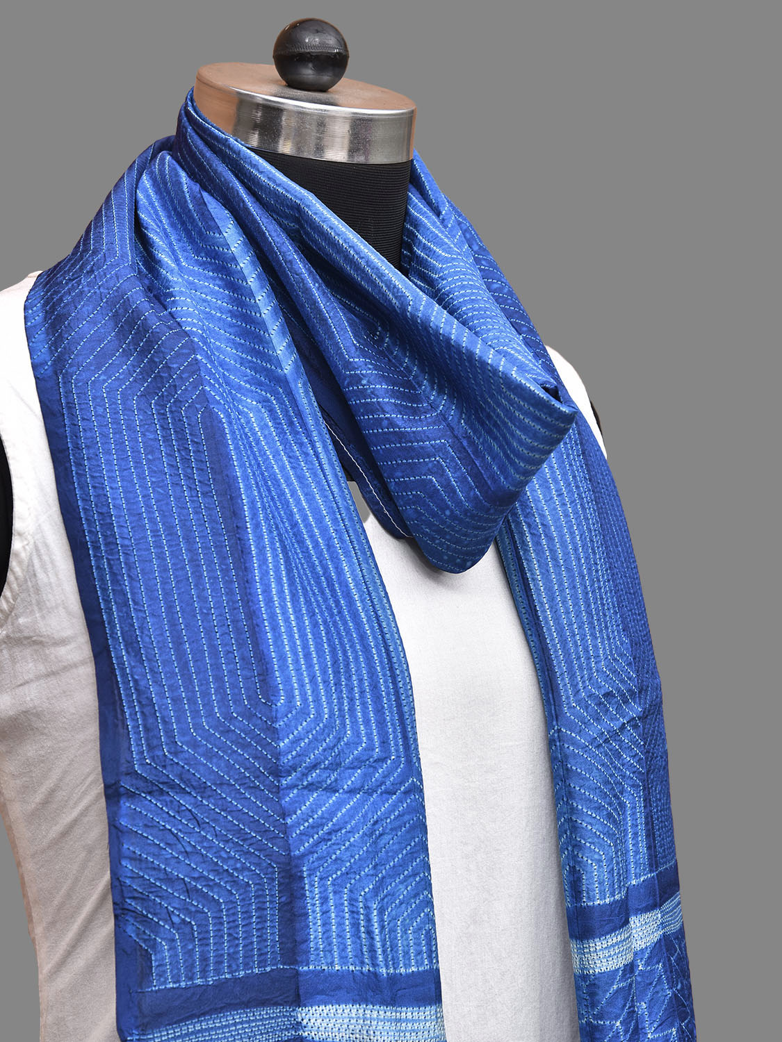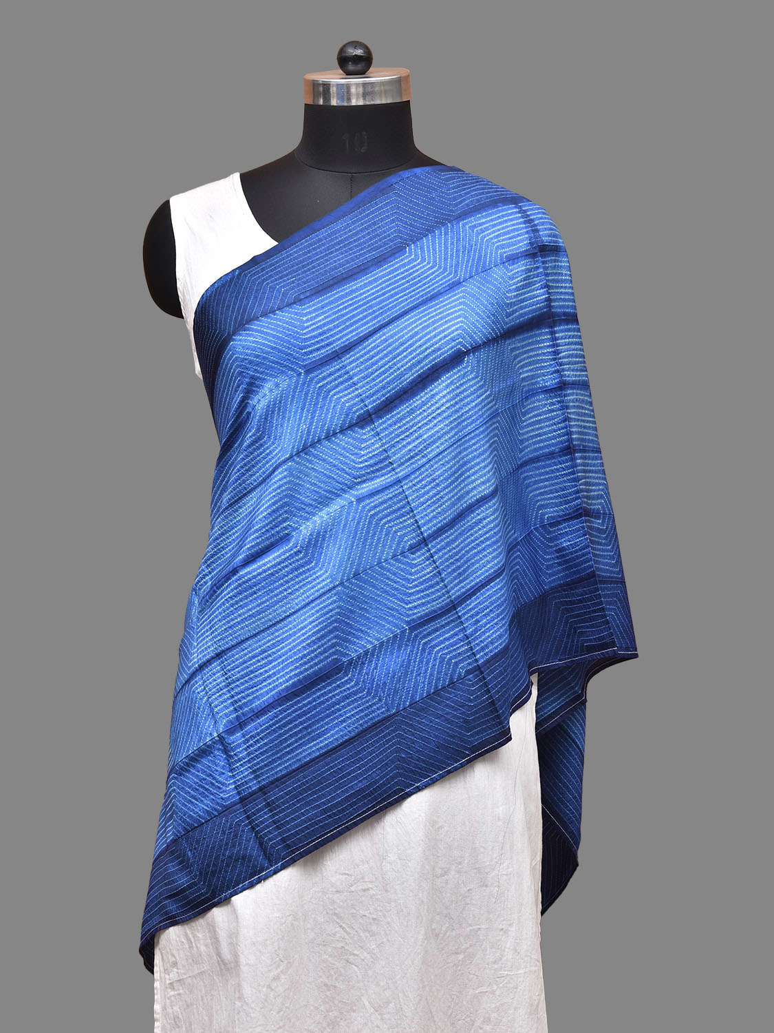 Blue Shibori Sico Stole with Hexogonal Design. Shibori is Japanese a Technique of tie and dye, and resist some parts by clamping or stitching the fabric. The result produced are unique geometric patterns & any other eloborate design. For fabric care we advise dry clean.