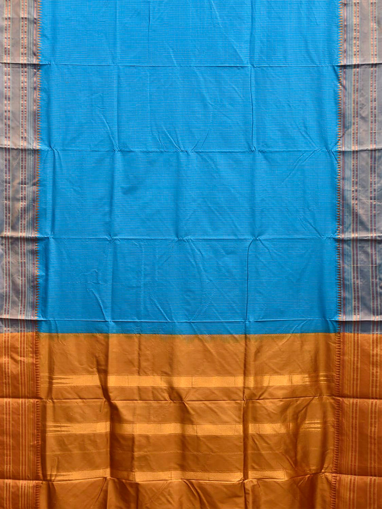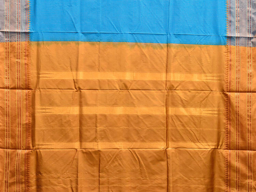 Blue and Mustard Narayanpet Silk Saree with Checks and Contrast Pallu Design No Blouse. This saree has no blouse.