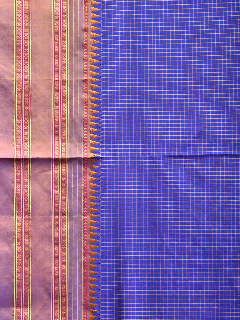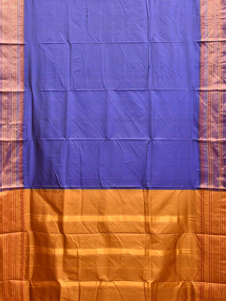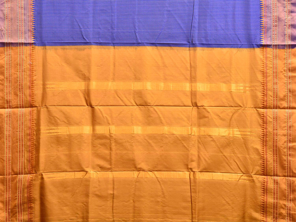 Dark Blue and Mustard Narayanpet Silk Saree with Checks and Contrast Pallu Design No Blouse. This saree has no blouse.