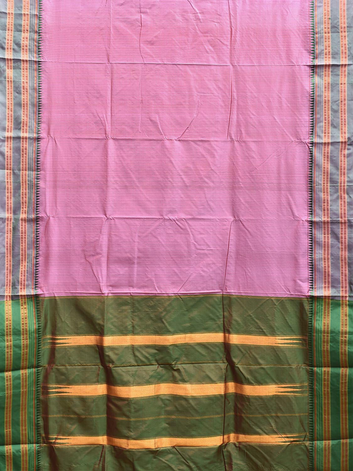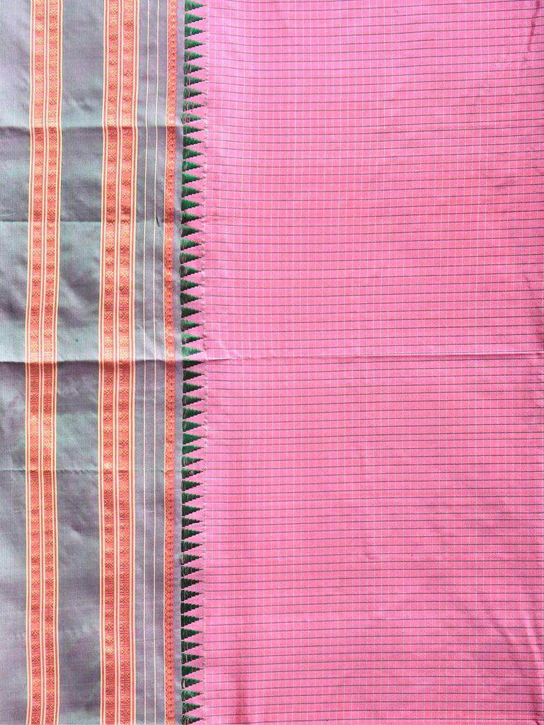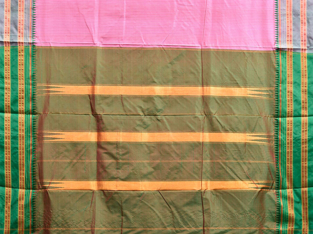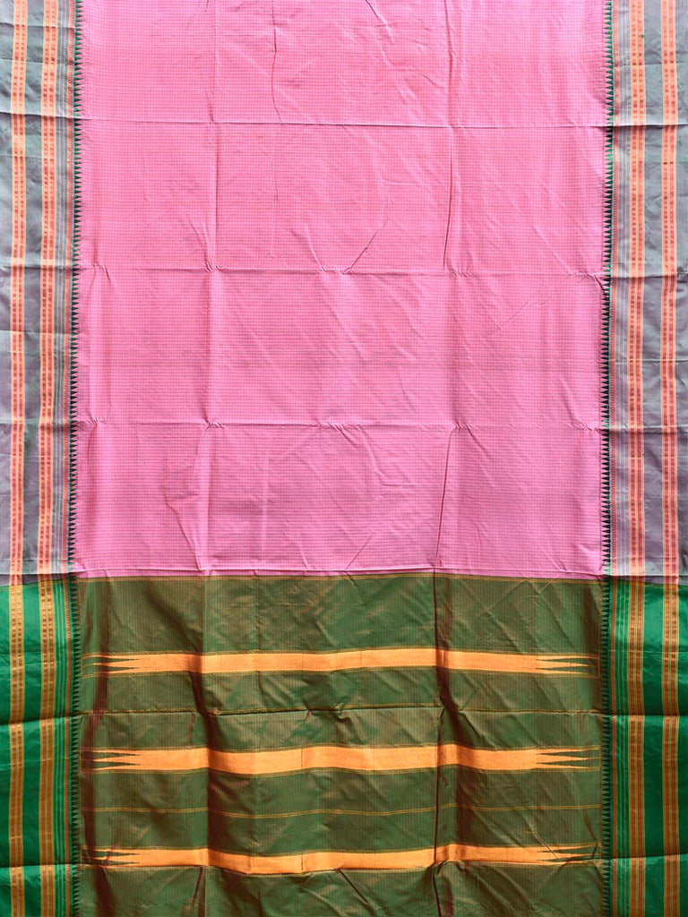 Light Pink and Green Narayanpet Silk Saree with Checks and Contrast Pallu Design No Blouse. This saree has no blouse.