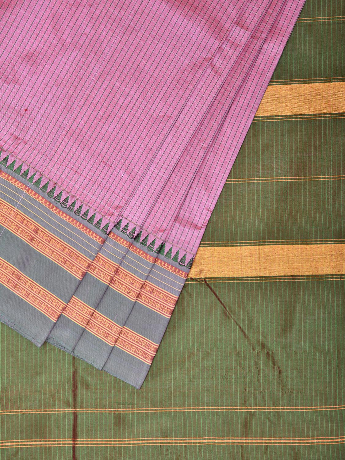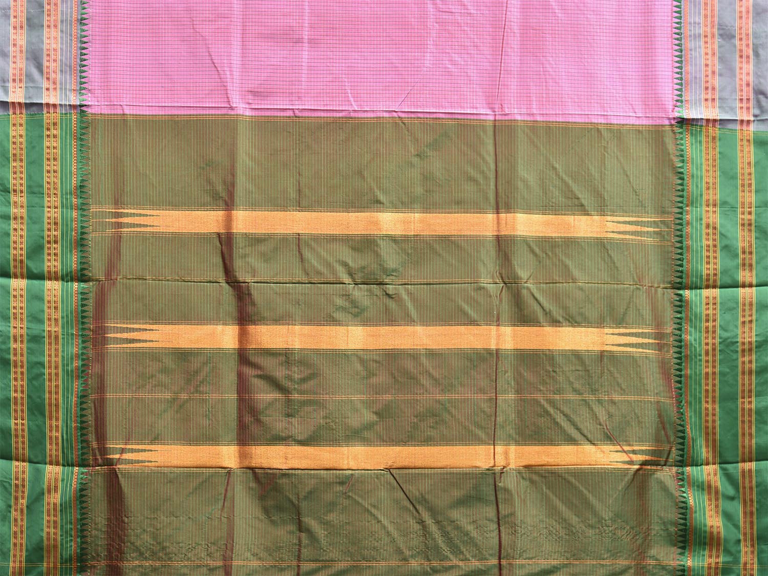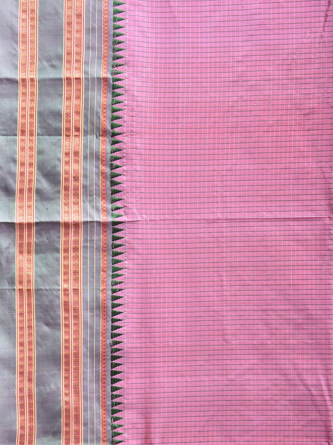 Light Pink and Green Narayanpet Silk Saree with Checks and Contrast Pallu Design No Blouse. This saree has no blouse.