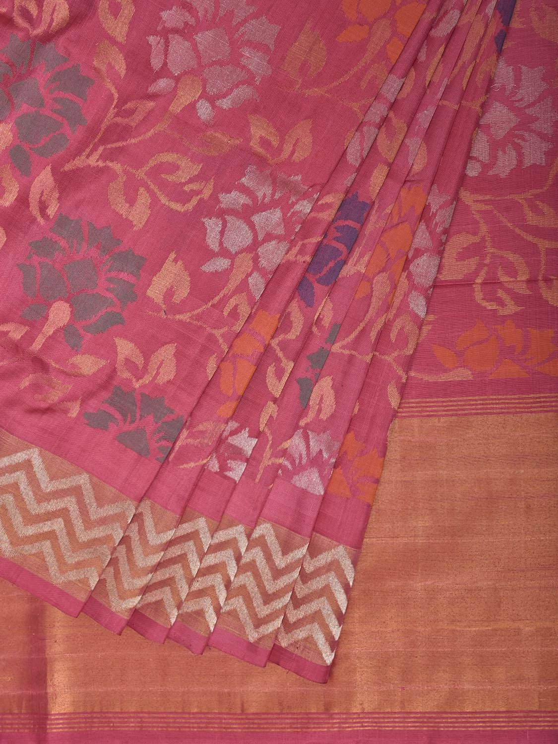 Light Pink Uppada Silk Handloom Saree with All Over Floral and Zig-Zag Border Design. Uppada sarees are known for light weight sarees with jamdani weaving technique. With so many traditional designs it is considered for the very special occasion wear. We advice dry clean for fabric care.