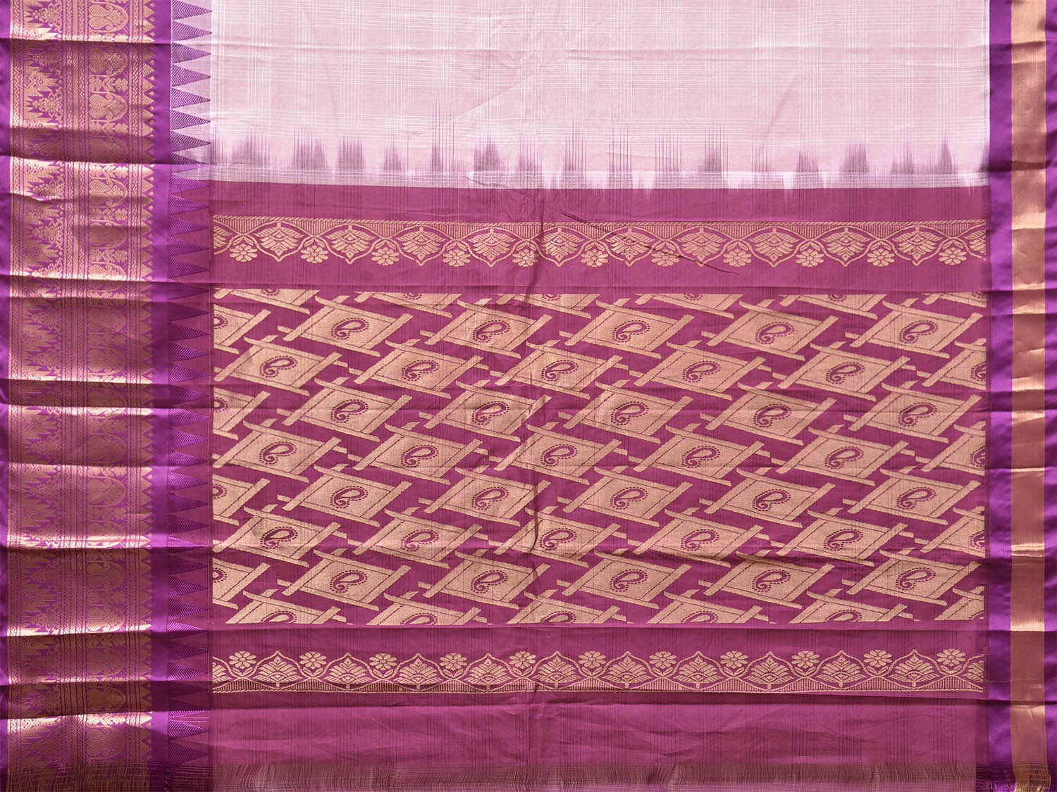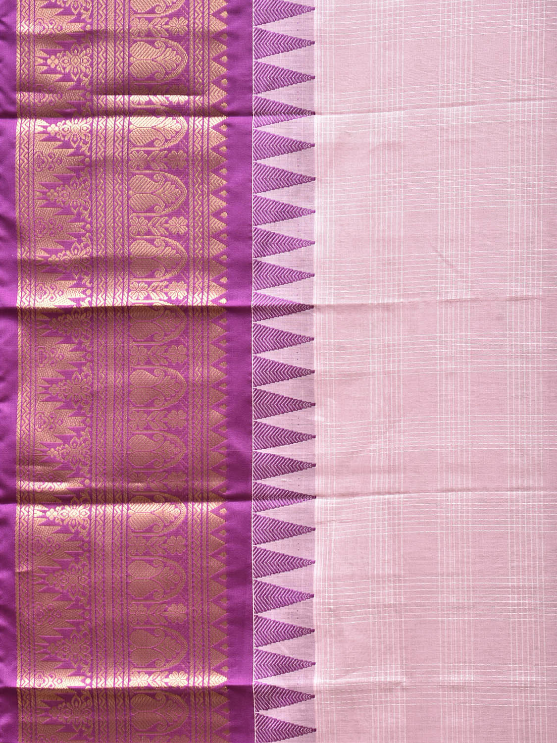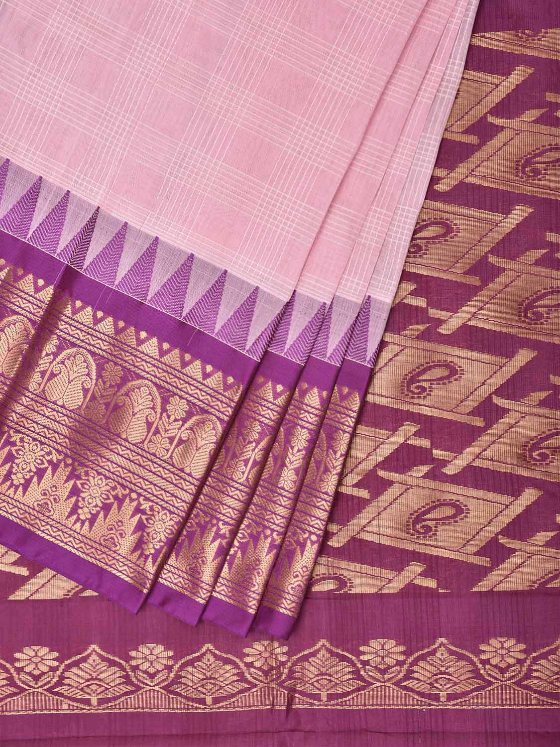 Baby Pink and Pink Gadwal Cotton Viscose Saree with Checks and Pallu-Border Design No Blouse. Gadwal Sarees are known for their traditional design of border and pallu made of silk and body being either cotton or silk. They are known as Sico sarees for border and pallu being silk and body being cotton. We advice dry clean for fabric care. This saree has no blouse.