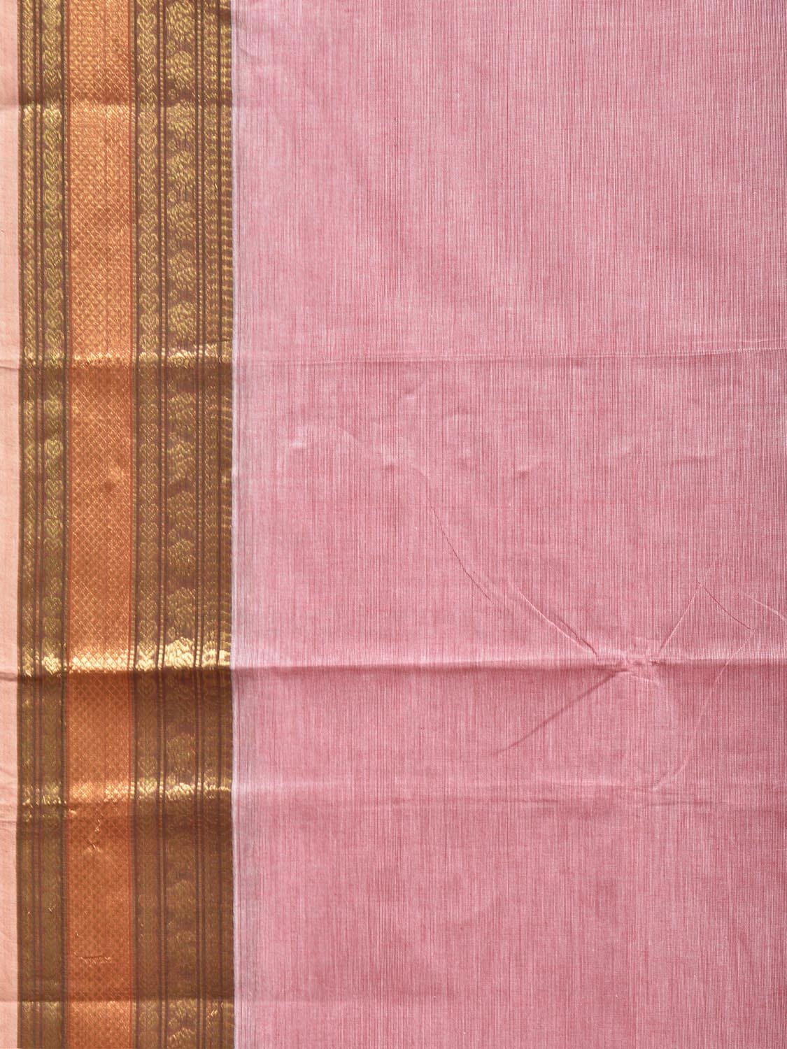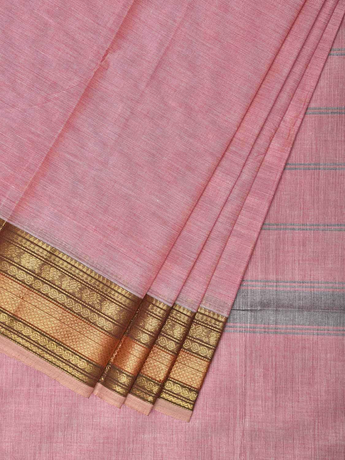 Baby Pink Kanchipuram Cotton Plain Saree with Strips Pallu Design. Traditional Simple South Indian Attire Saree for any Casual Occasions. As it’s a cotton saree we advice gentle handwash separately for fabric care.