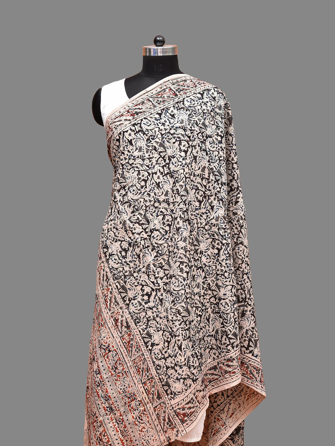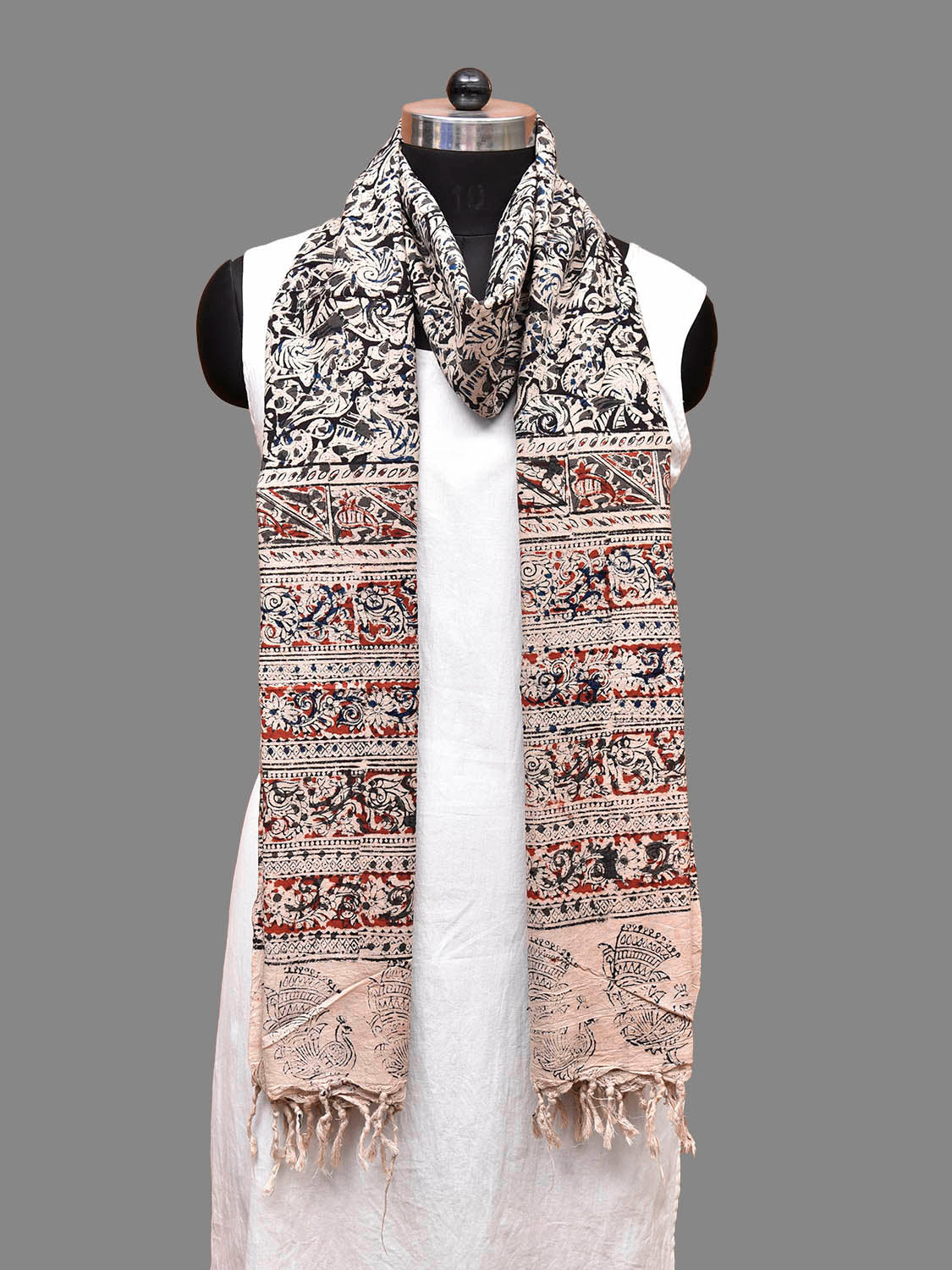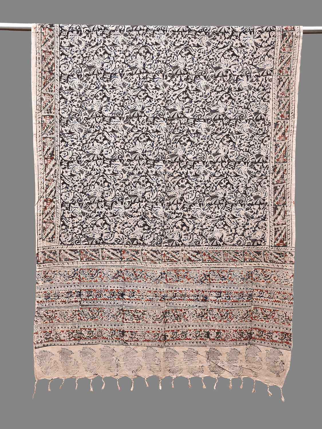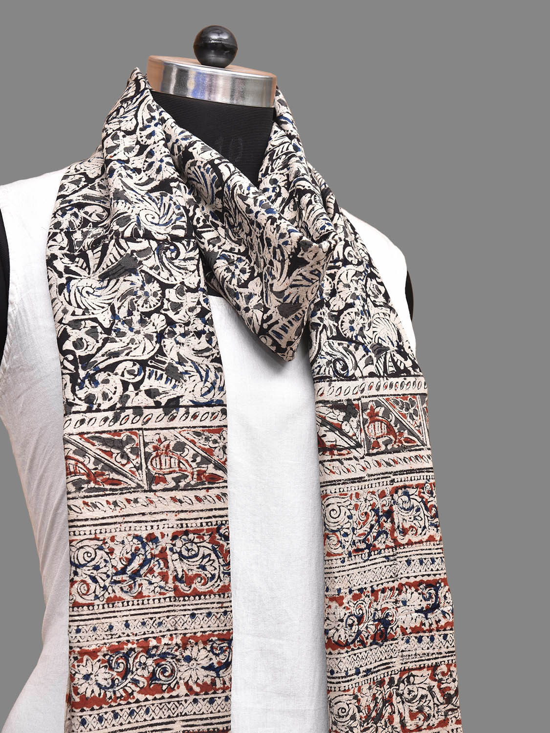 Black and Cream Kalamkari Natural Dye Block Print Cotton Dupatta with Floral Design ds4047