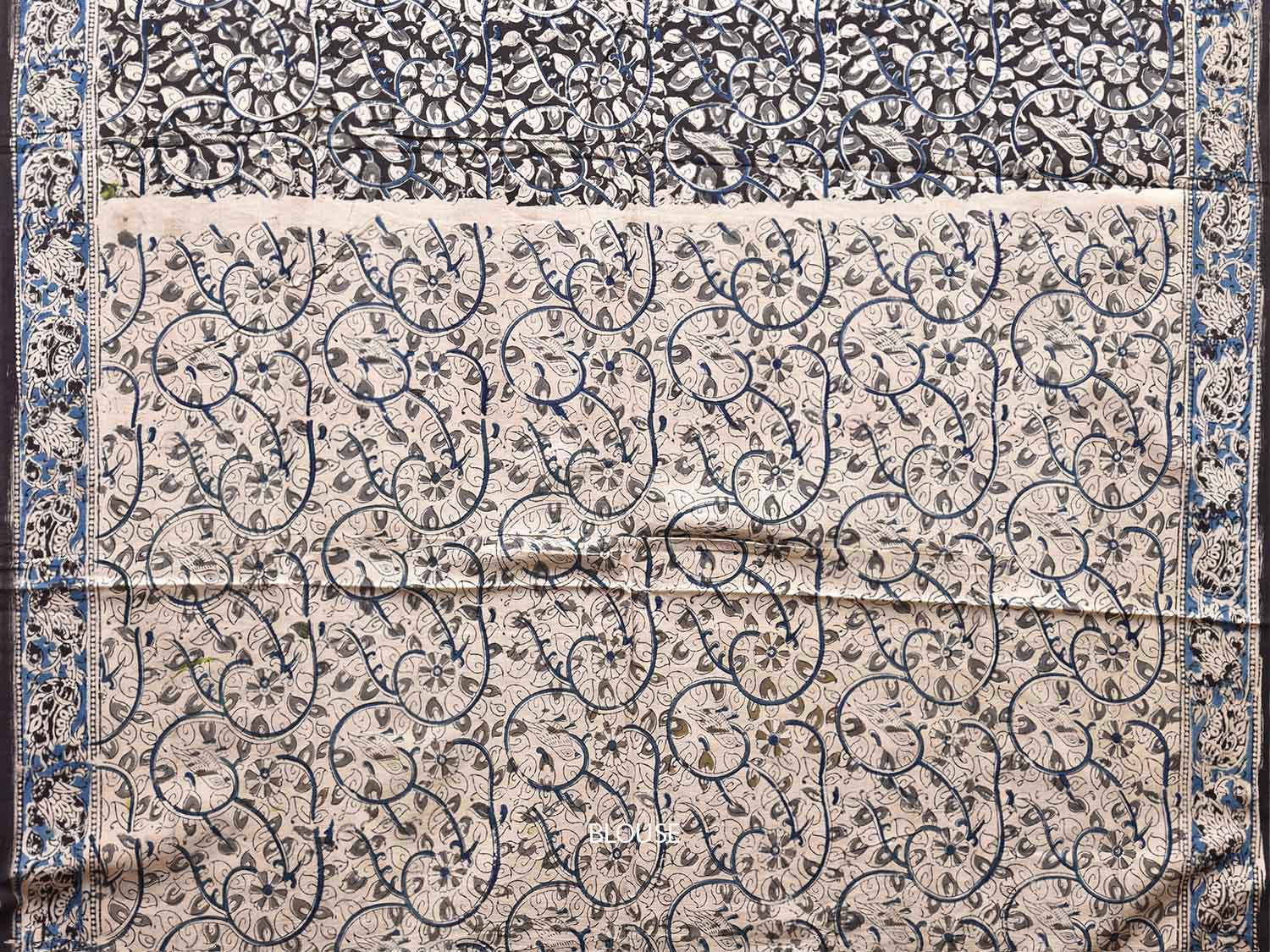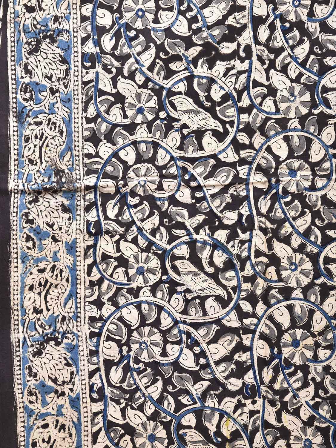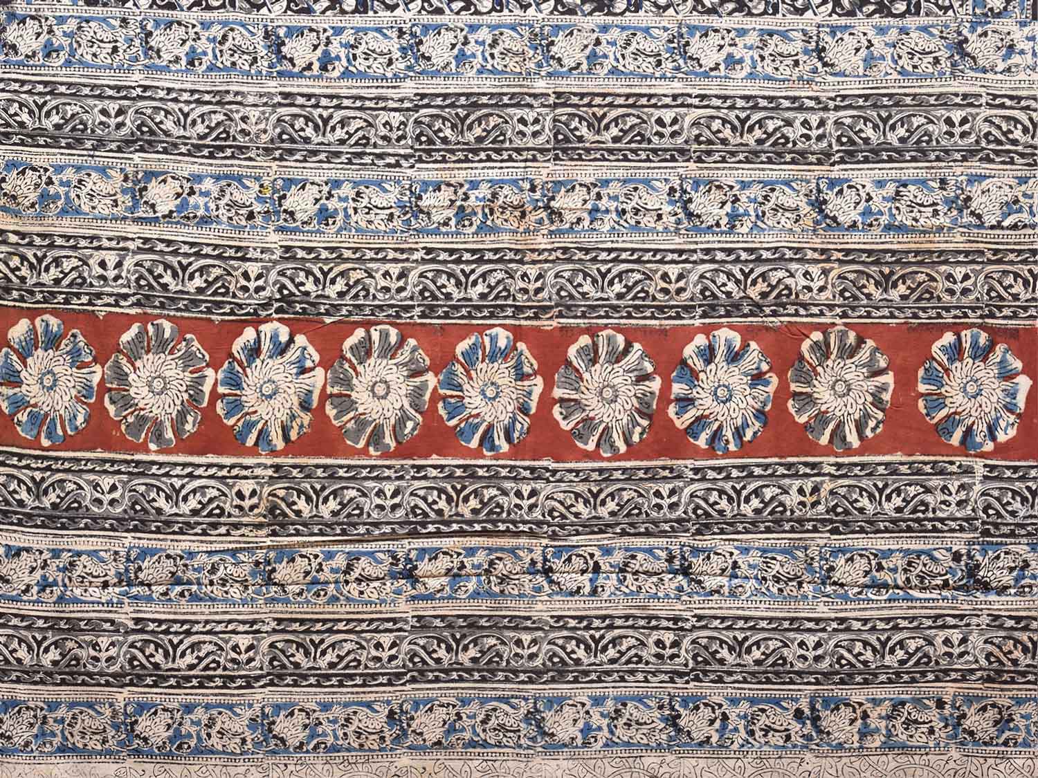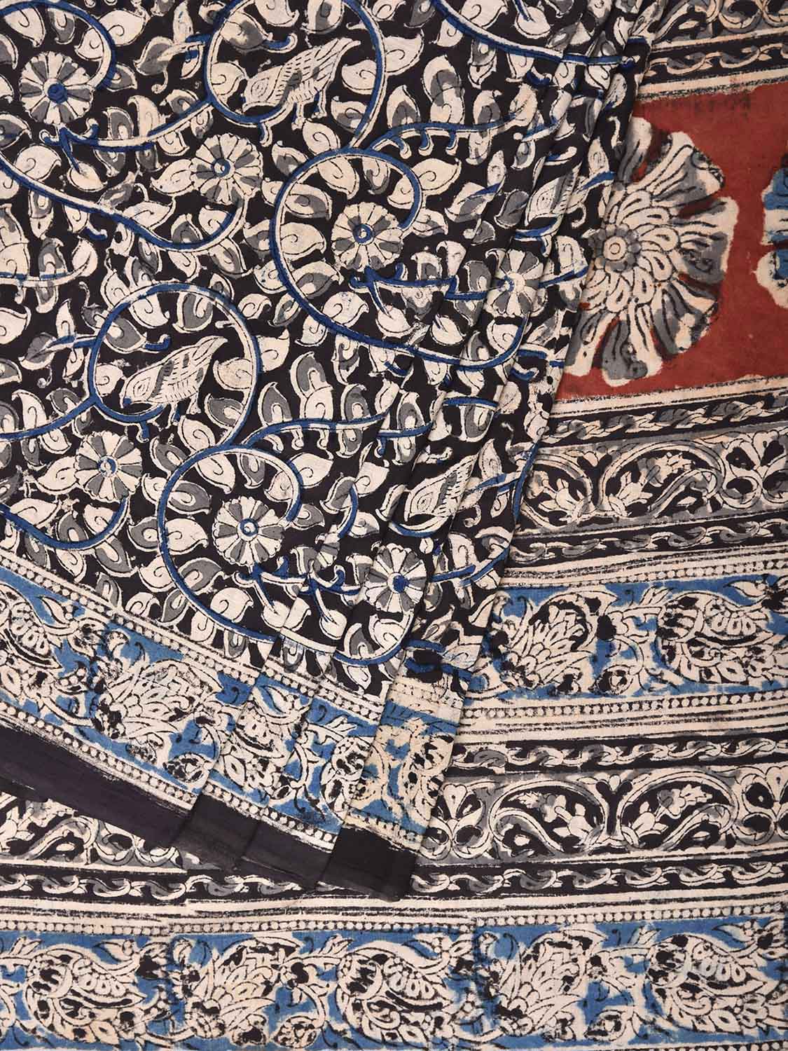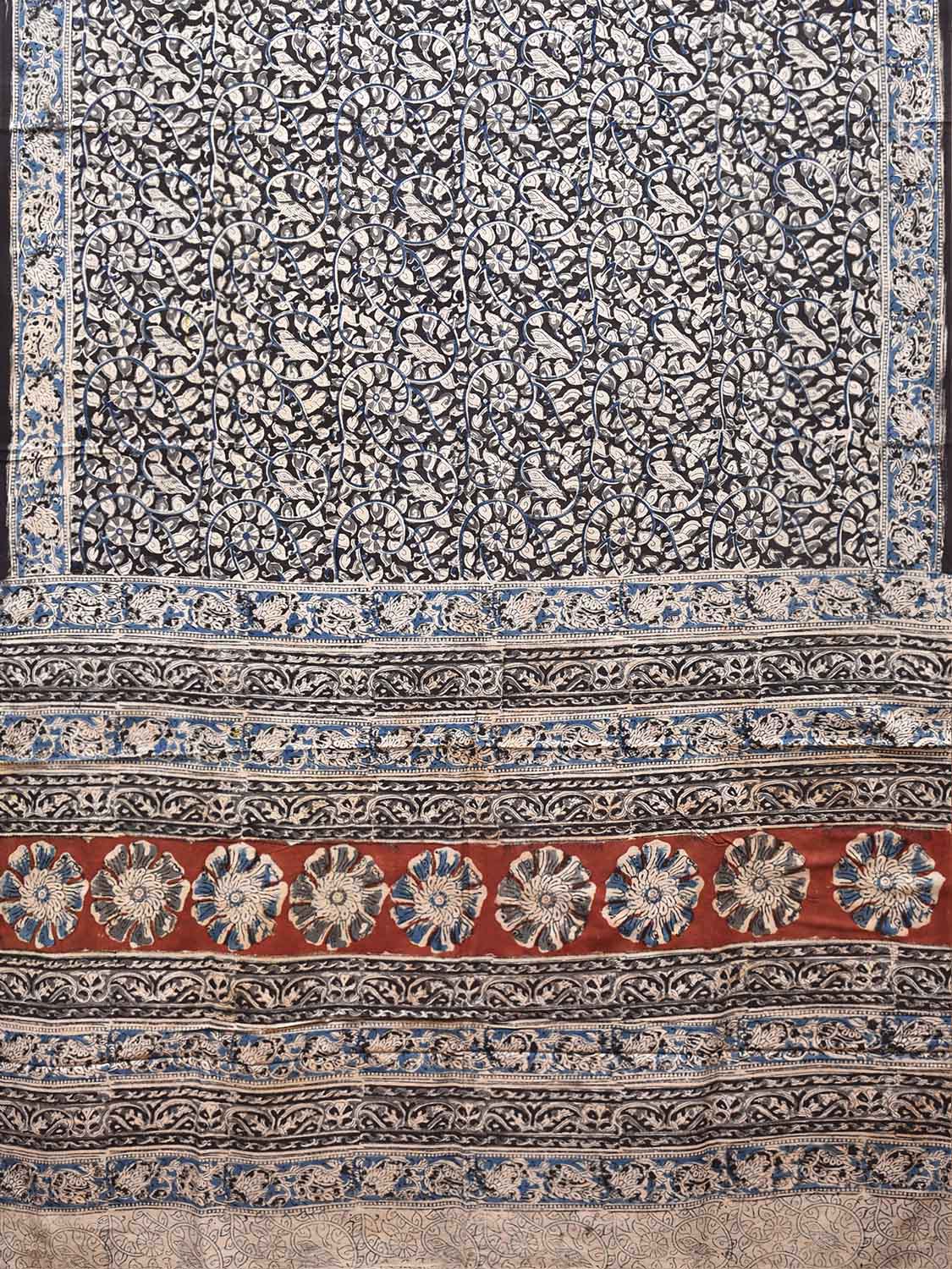 Black and Red Kalamkari Block Print Cotton Saree with All Over Leaves and Floral Pallu Design. This is block print kalamkari done using natural dyes. As they are natural colors they bleed with initial washes, so we suggest Dry clean.