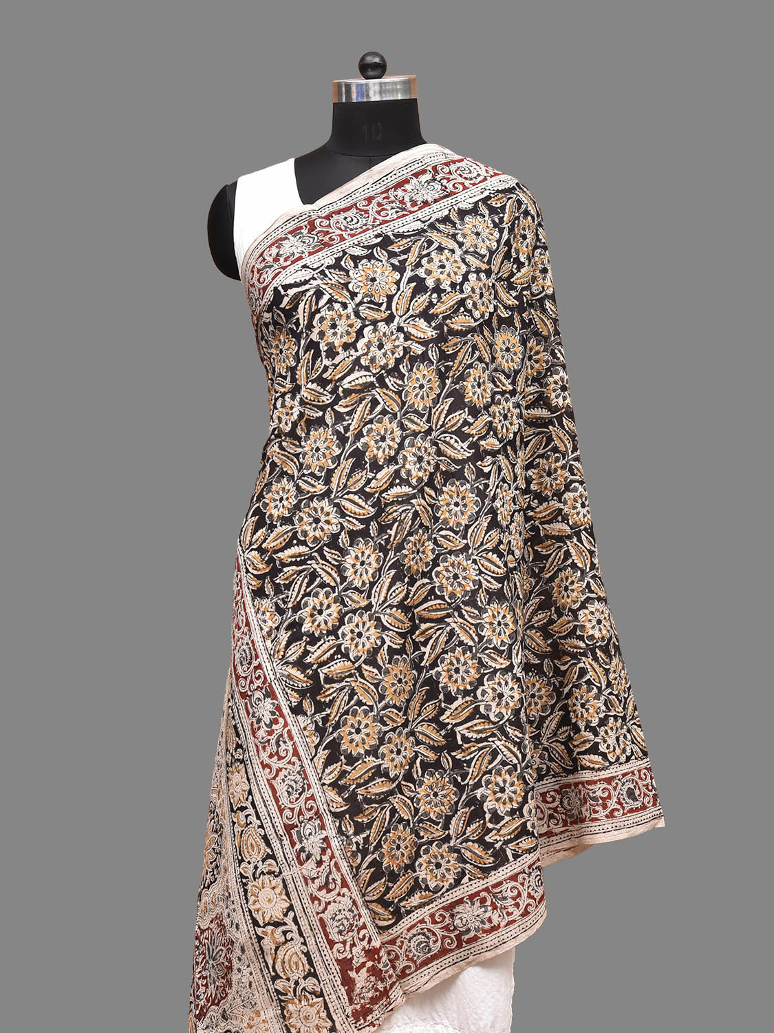 Black and Red Kalamkari Natural Dye Block Print Cotton Dupatta with Floral Design. This block printed kalamkari is done using natural dyes. As they are natural colors they bleed with initial washes, so we suggest Dry clean or gentle handwash separately.