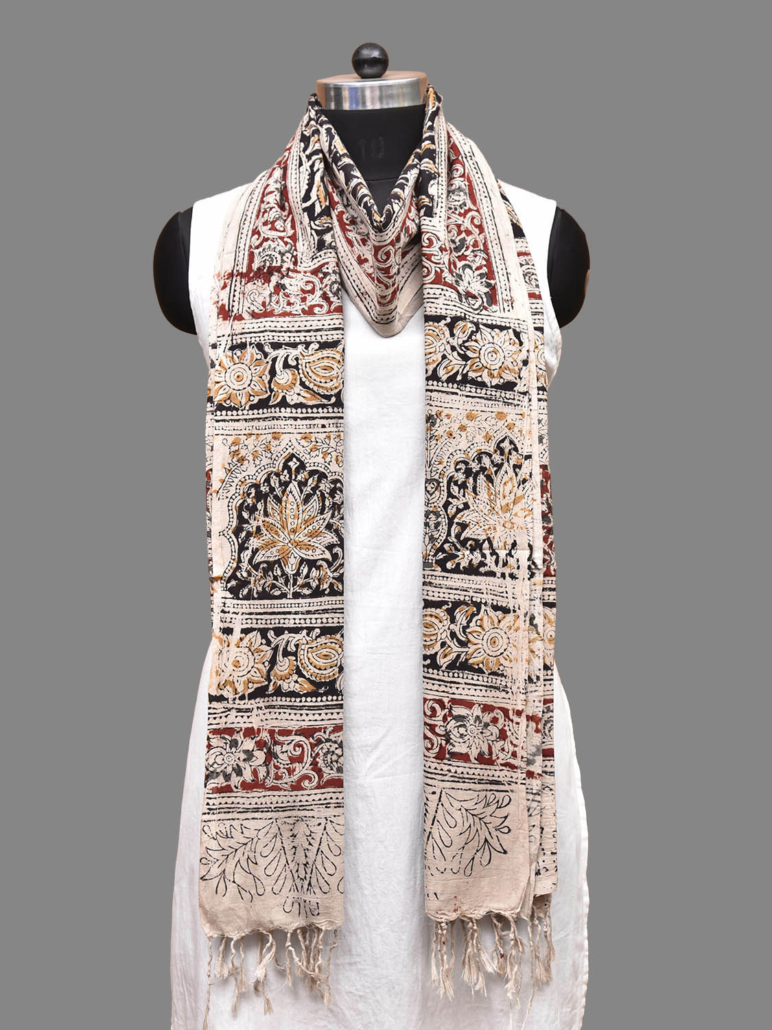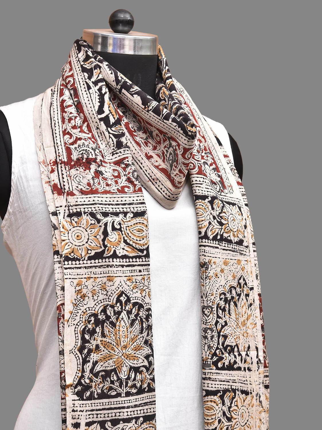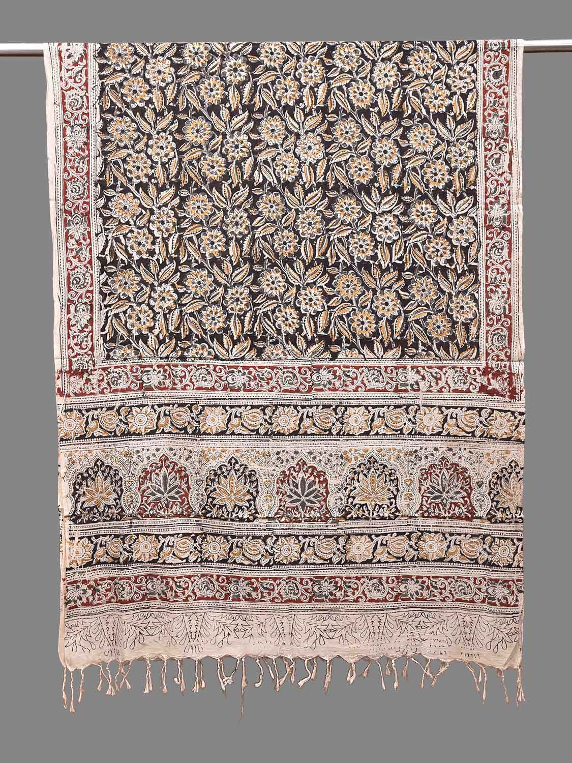 Black and Red Kalamkari Natural Dye Block Print Cotton Dupatta with Floral Design ds4044