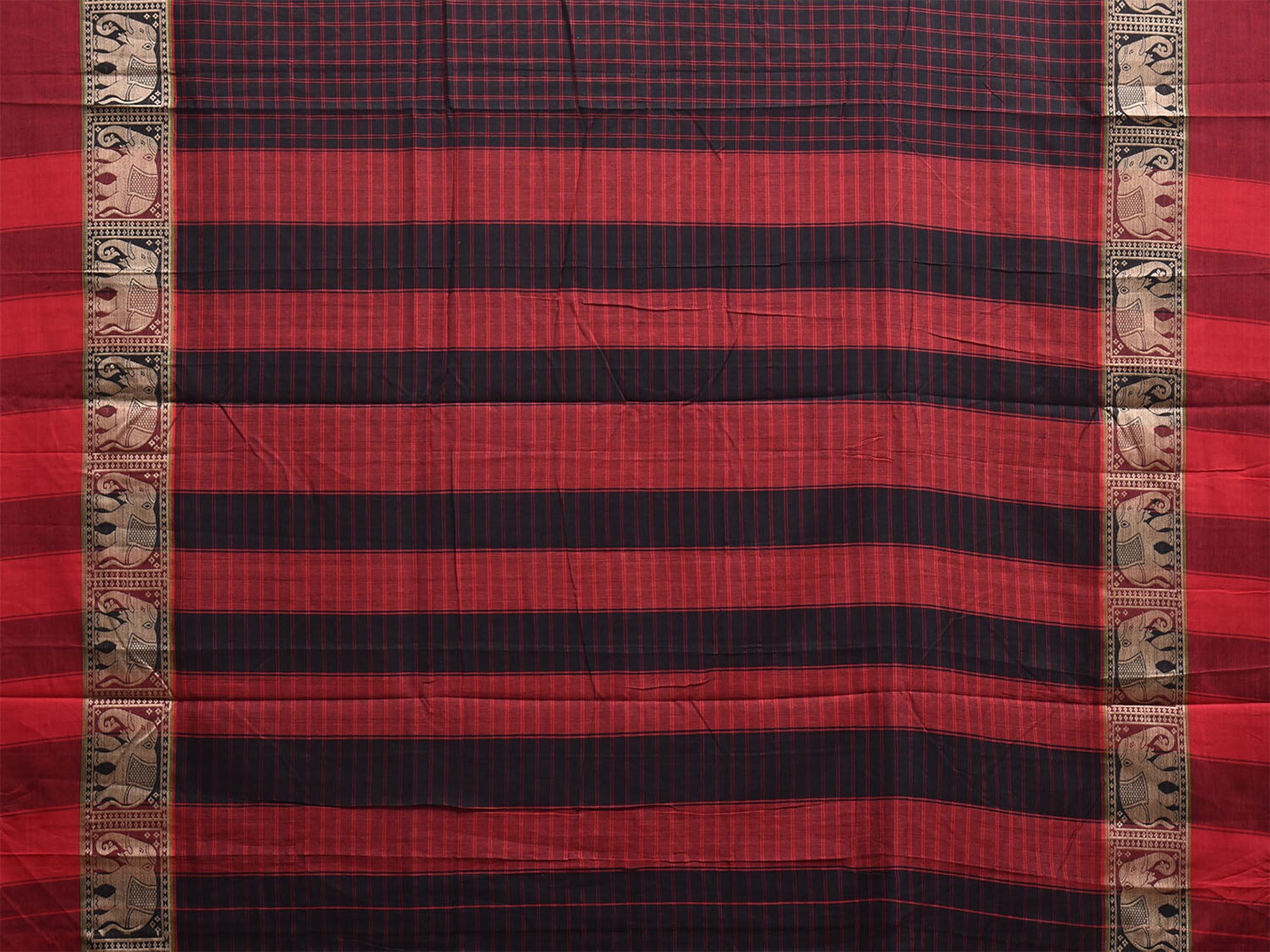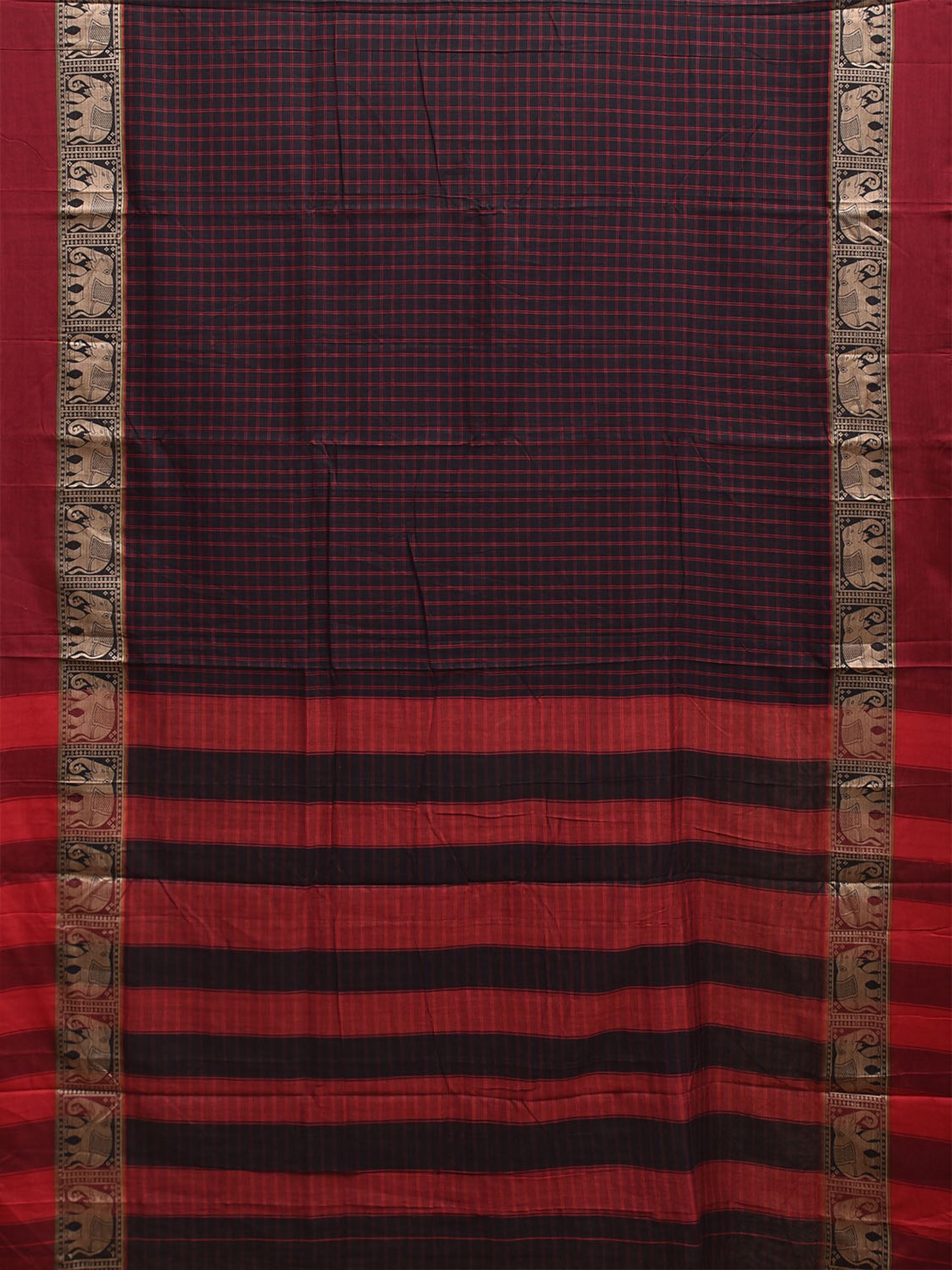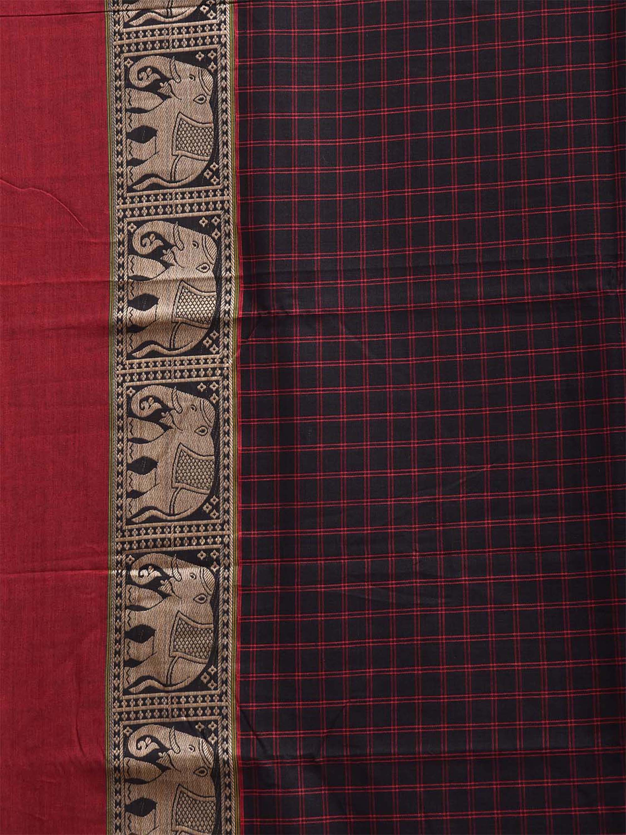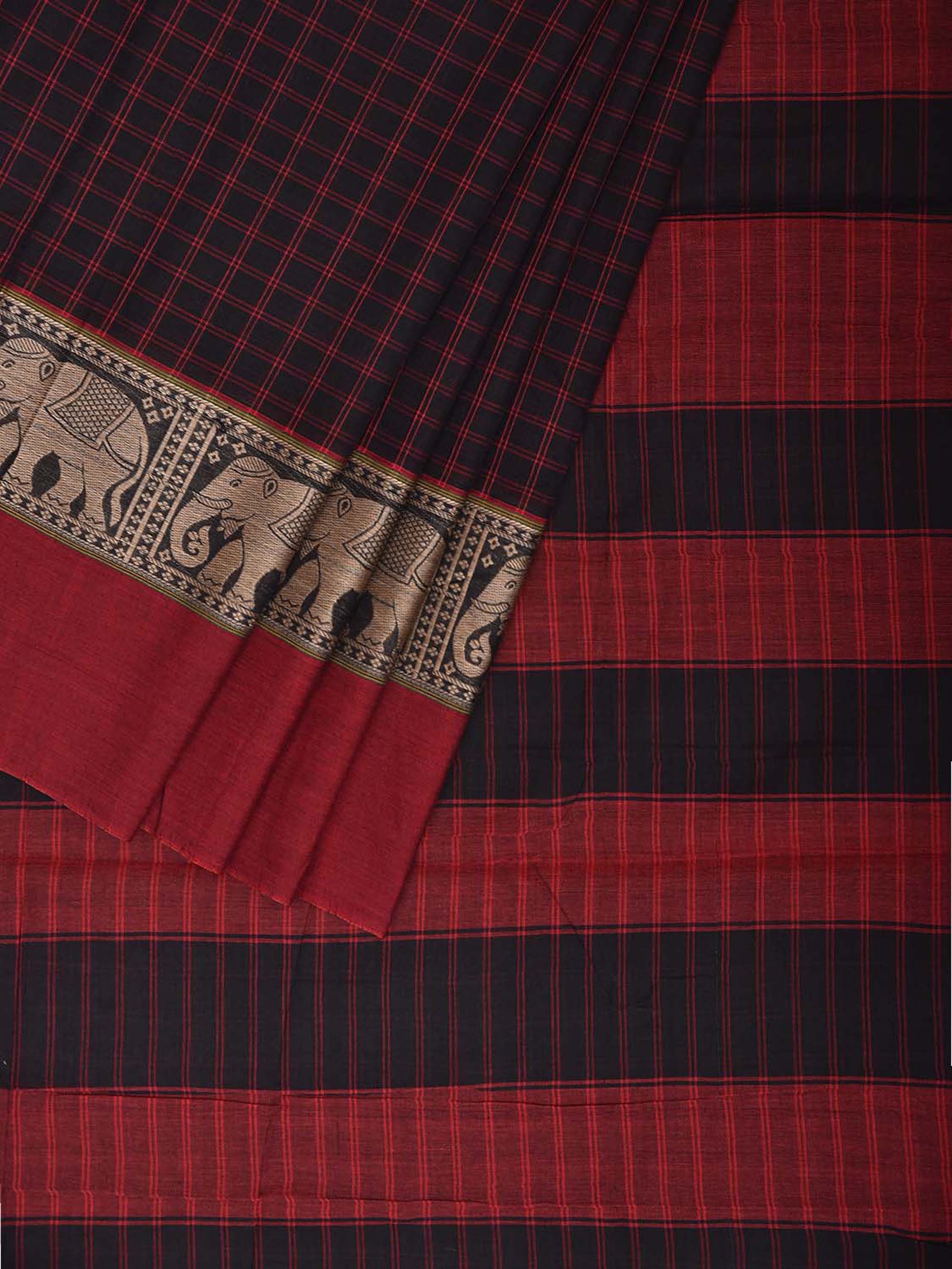Black and Red Narayanpet Cotton Saree with Checks and Elephant Border Design No Blouse. This saree has no blouse.