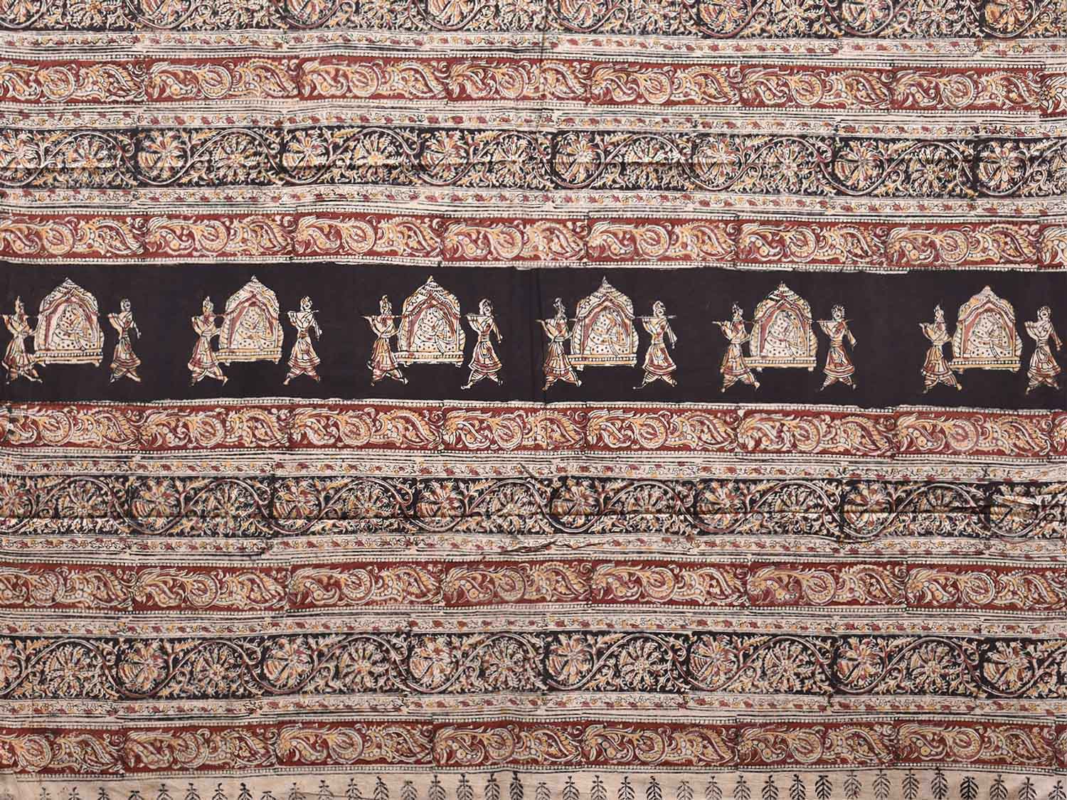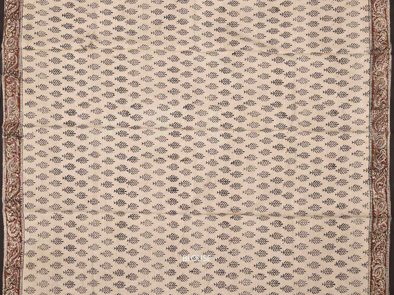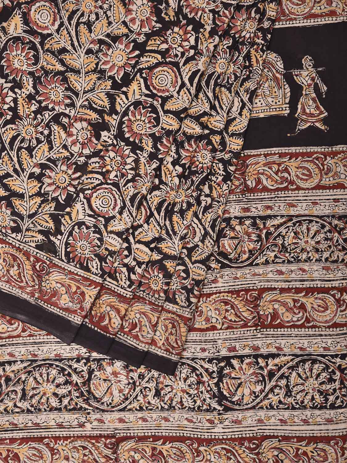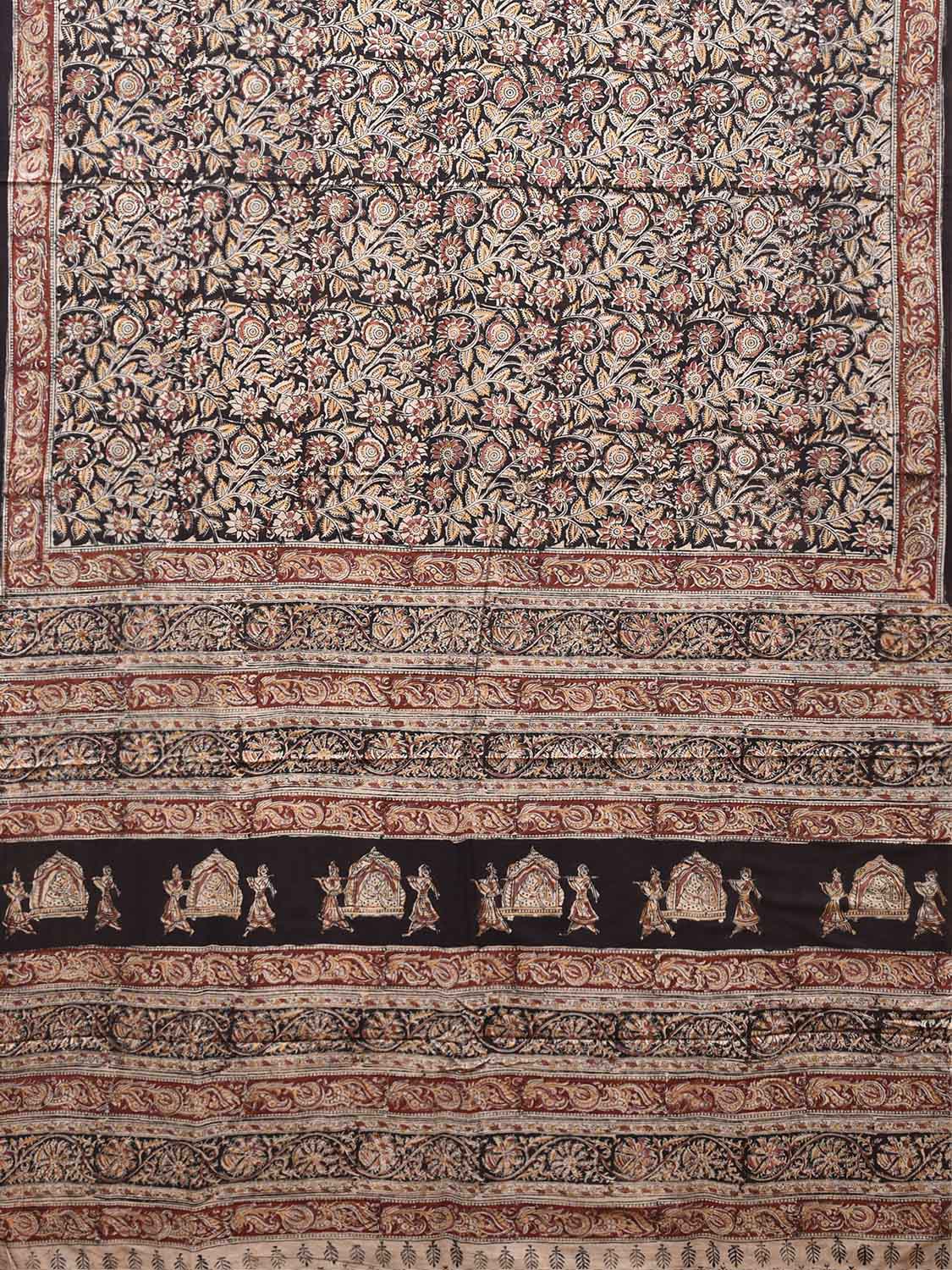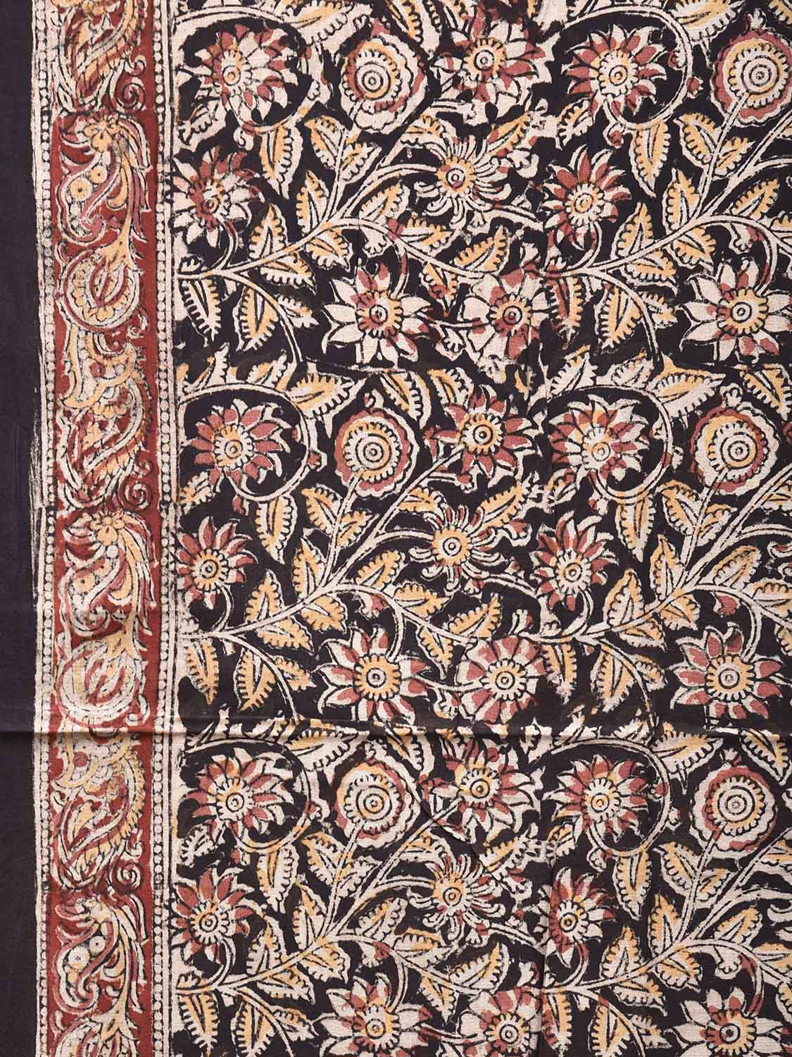 Black Kalamkari Block Print Cotton Saree with All Over Floral and Pallu Design. This is block print kalamkari done using natural dyes. As they are natural colors they bleed with initial washes, so we suggest Dry clean.