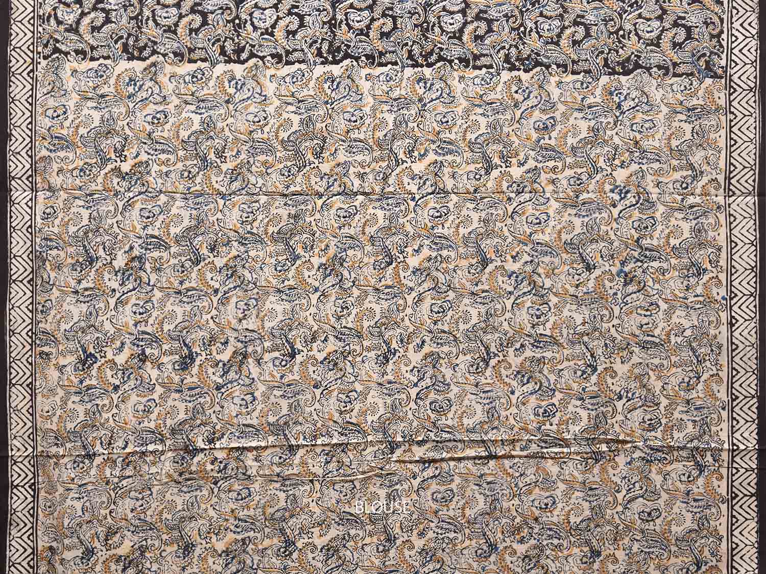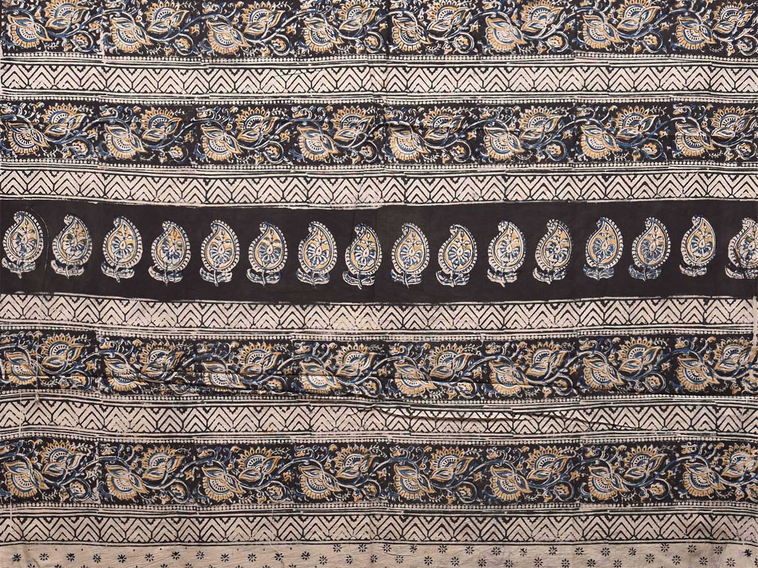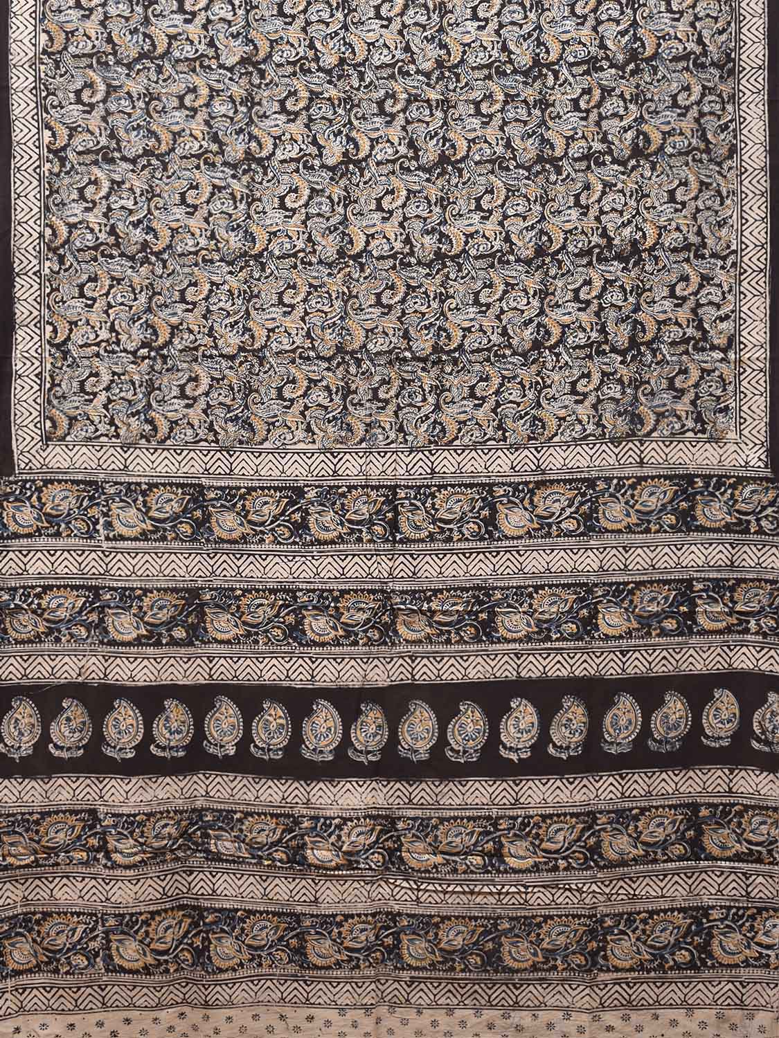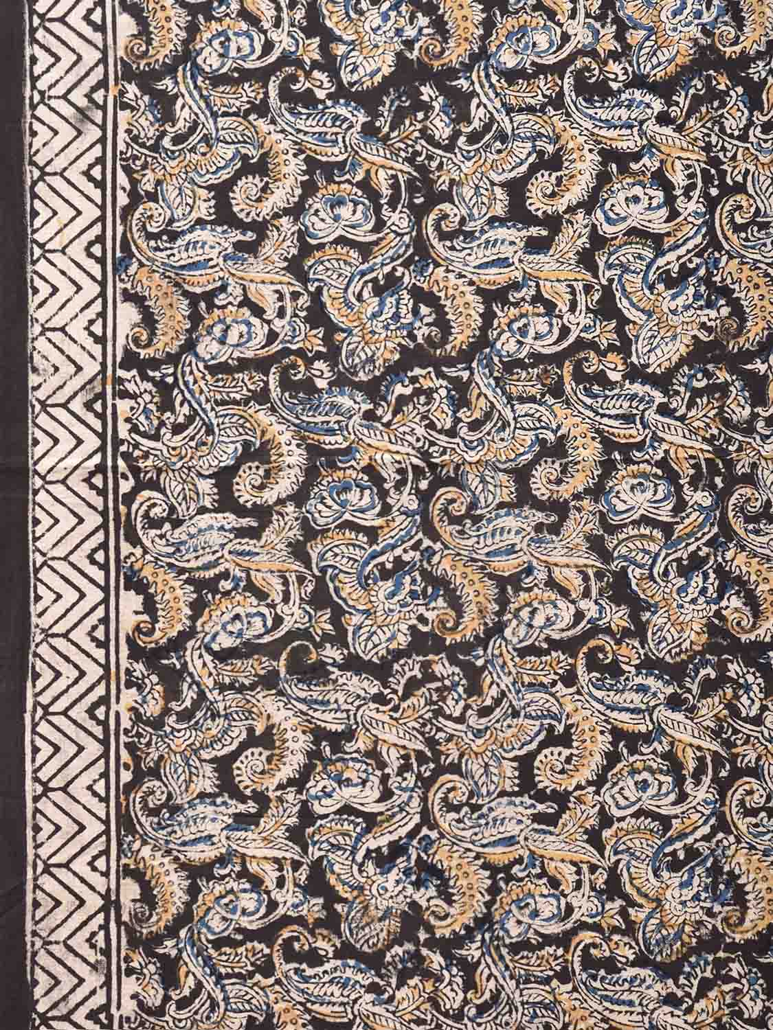 Black Kalamkari Block Print Cotton Saree with All Over Leaves and Floral Pallu Design. This is block print kalamkari done using natural dyes. As they are natural colors they bleed with initial washes, so we suggest Dry clean.