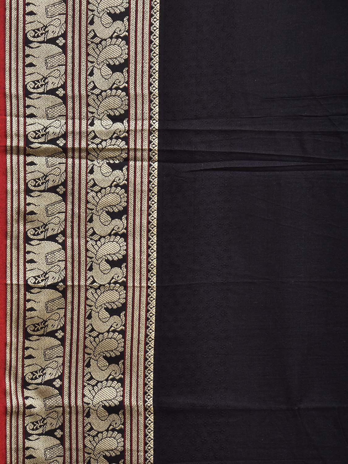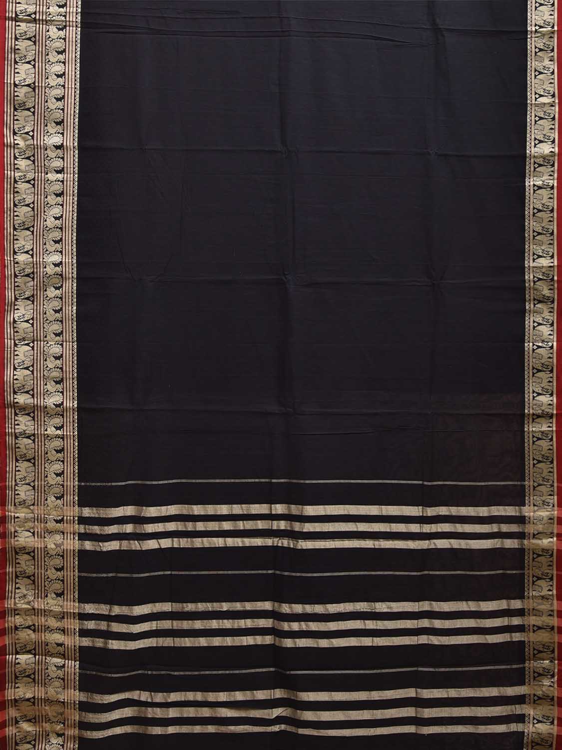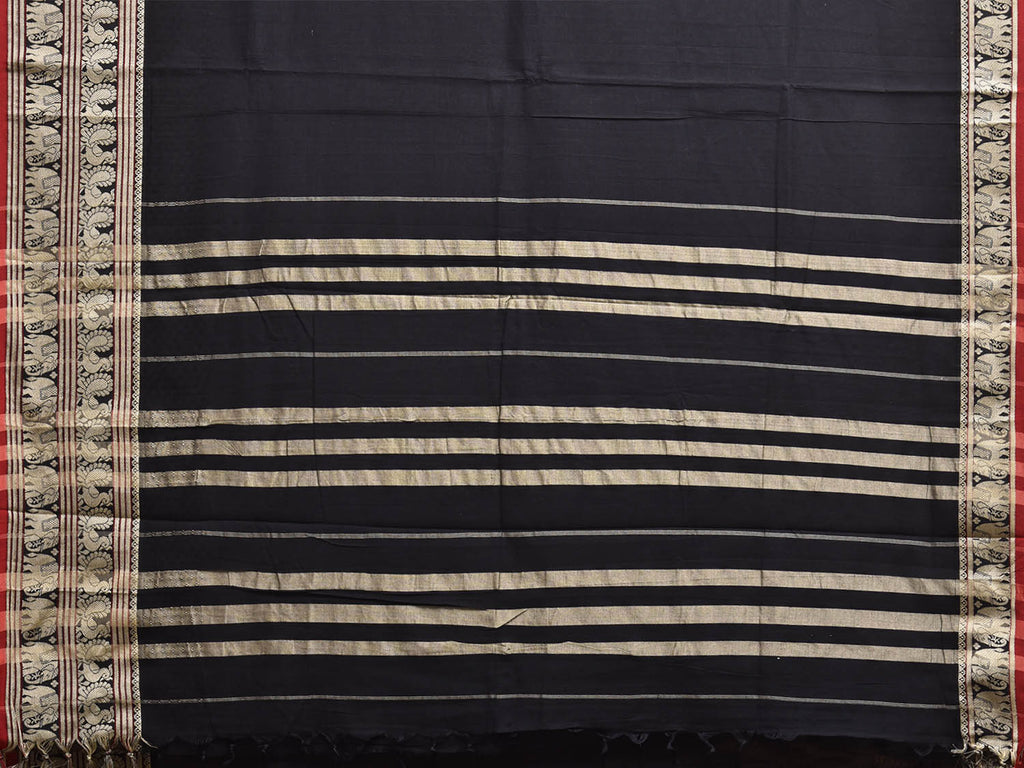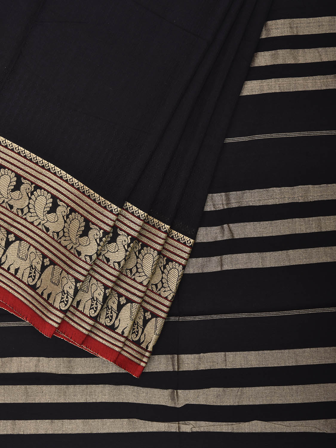 Black Kanchipuram Cotton Plain Saree with Strips Pallu and Border Design No Blouse. Traditional Simple South Indian Attire Saree for any Casual Occasions. As it’s a cotton saree we advice gentle handwash separately for fabric care. This saree has no blouse.