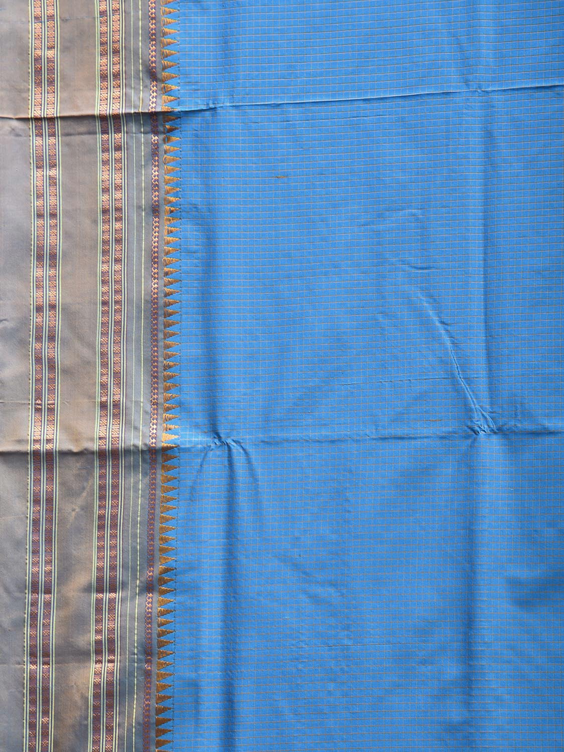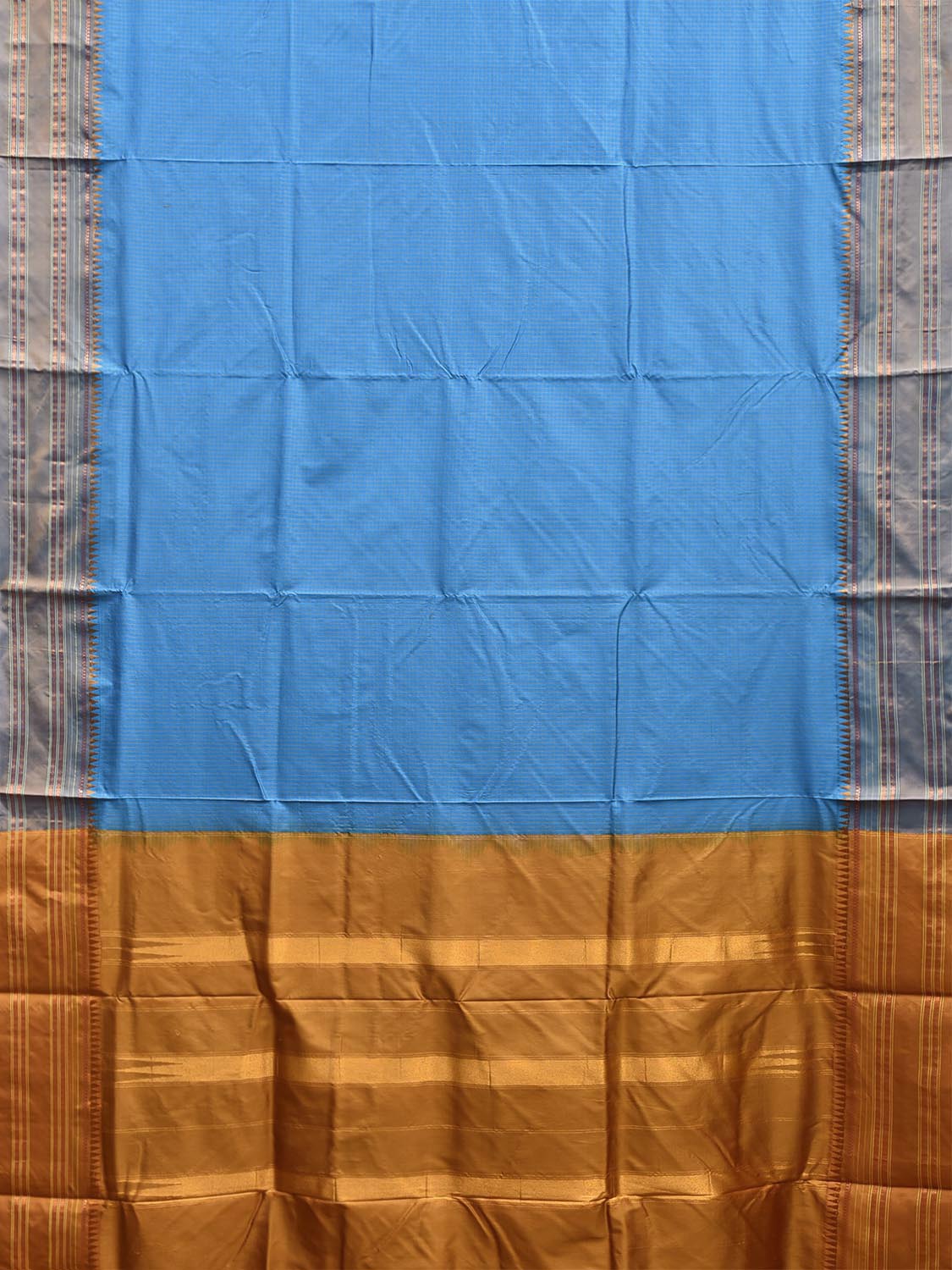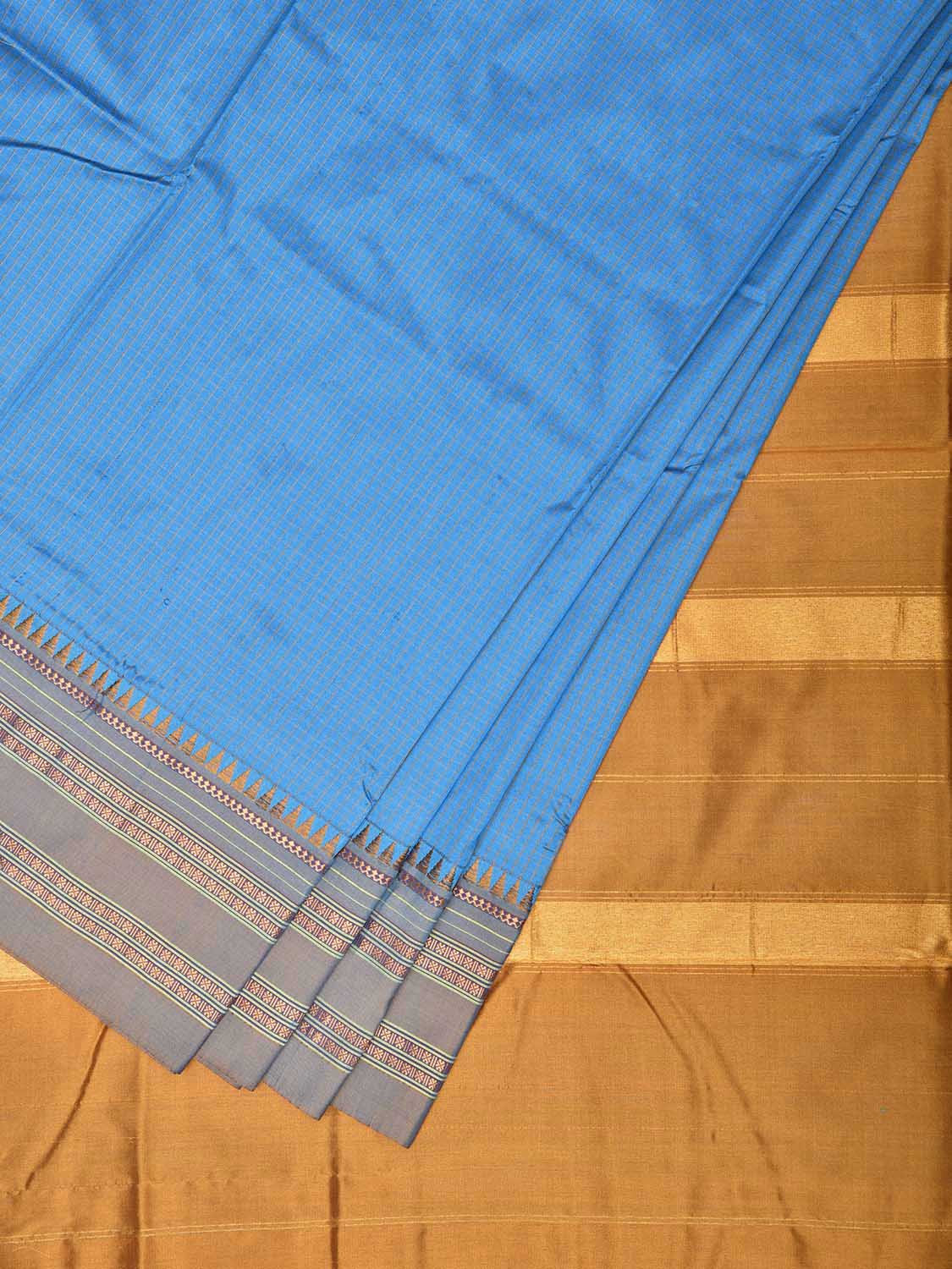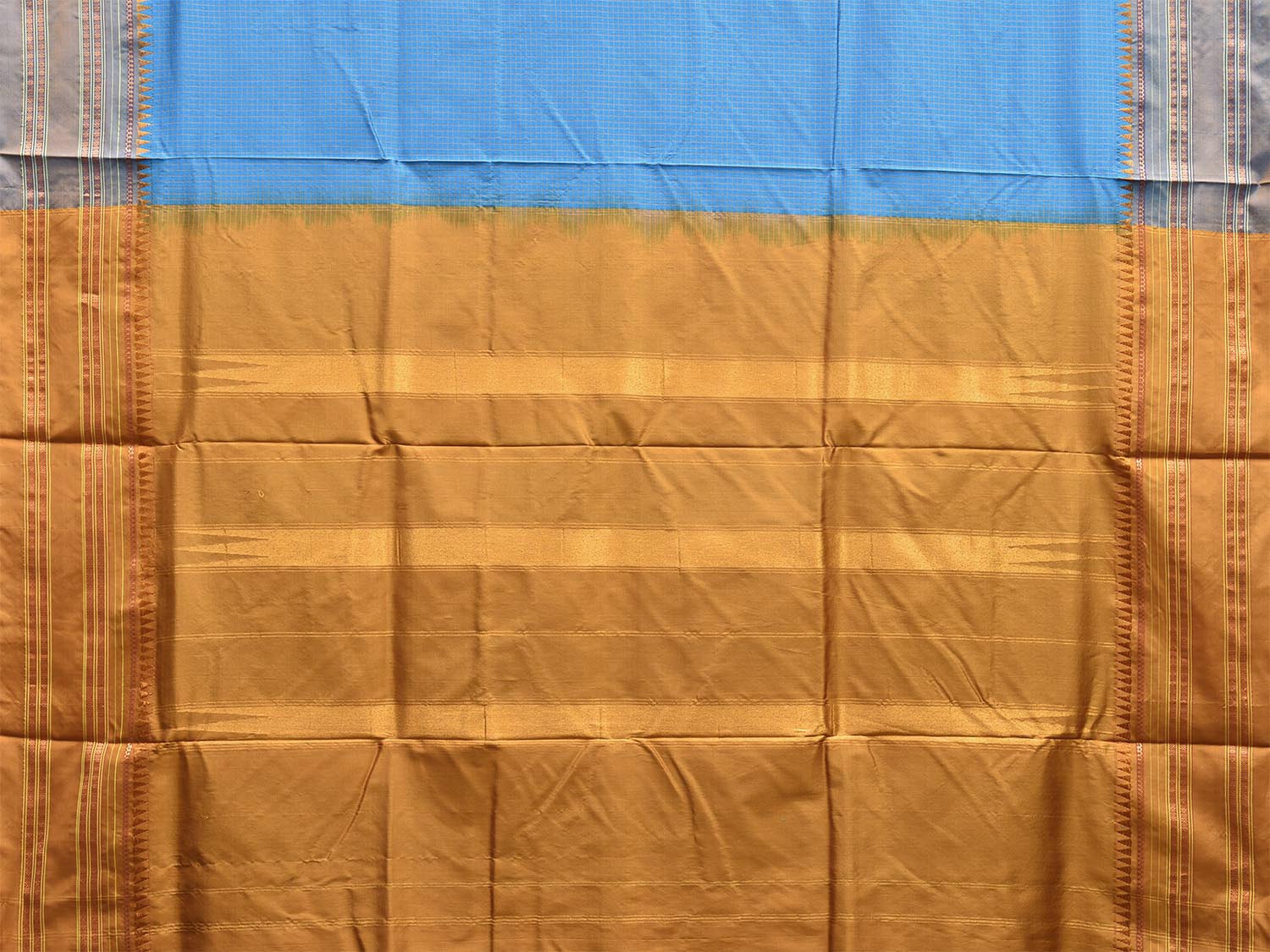 Blue and Mustard Narayanpet Silk Saree with Checks and Contrast Pallu Design No Blouse. This saree has no blouse.