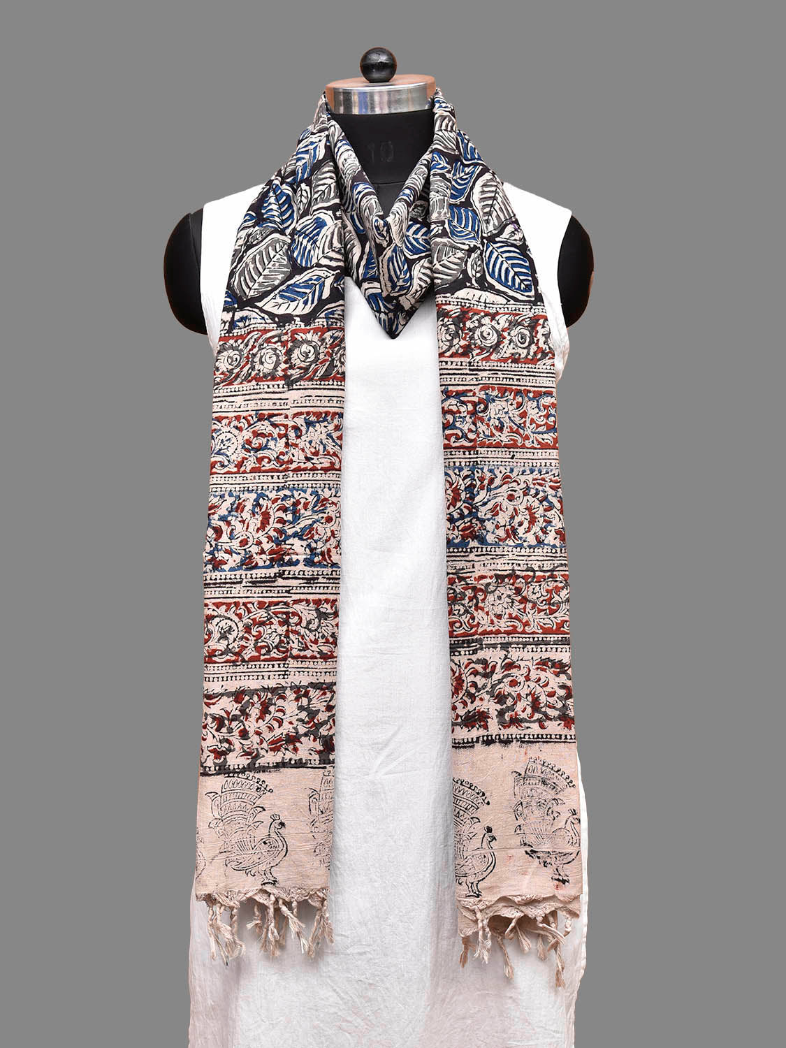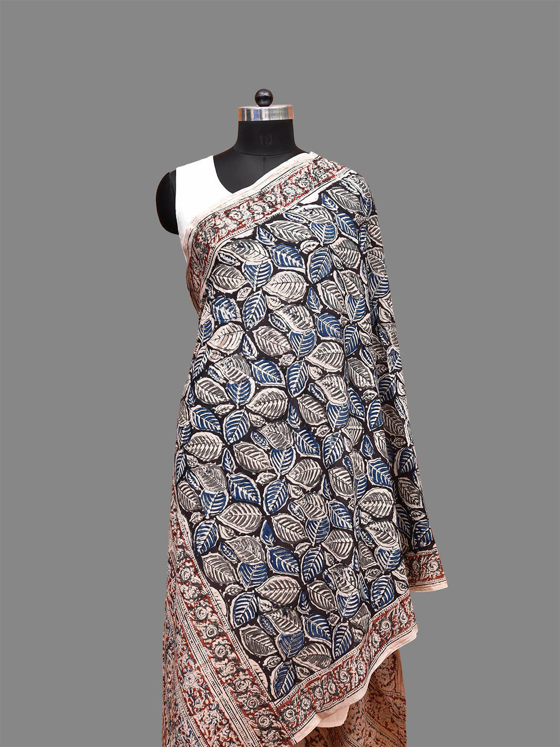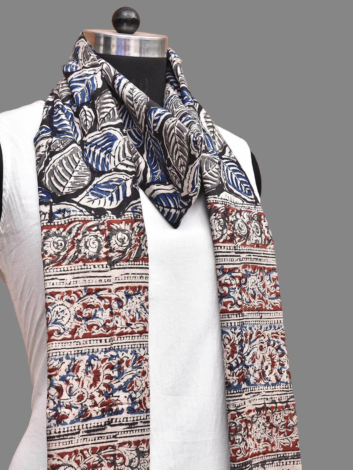 Blue and Red Kalamkari Natural Dye Block Print Cotton Dupatta with Leaves Design. This block printed kalamkari is done using natural dyes. As they are natural colors they bleed with initial washes, so we suggest Dry clean or gentle handwash separately.