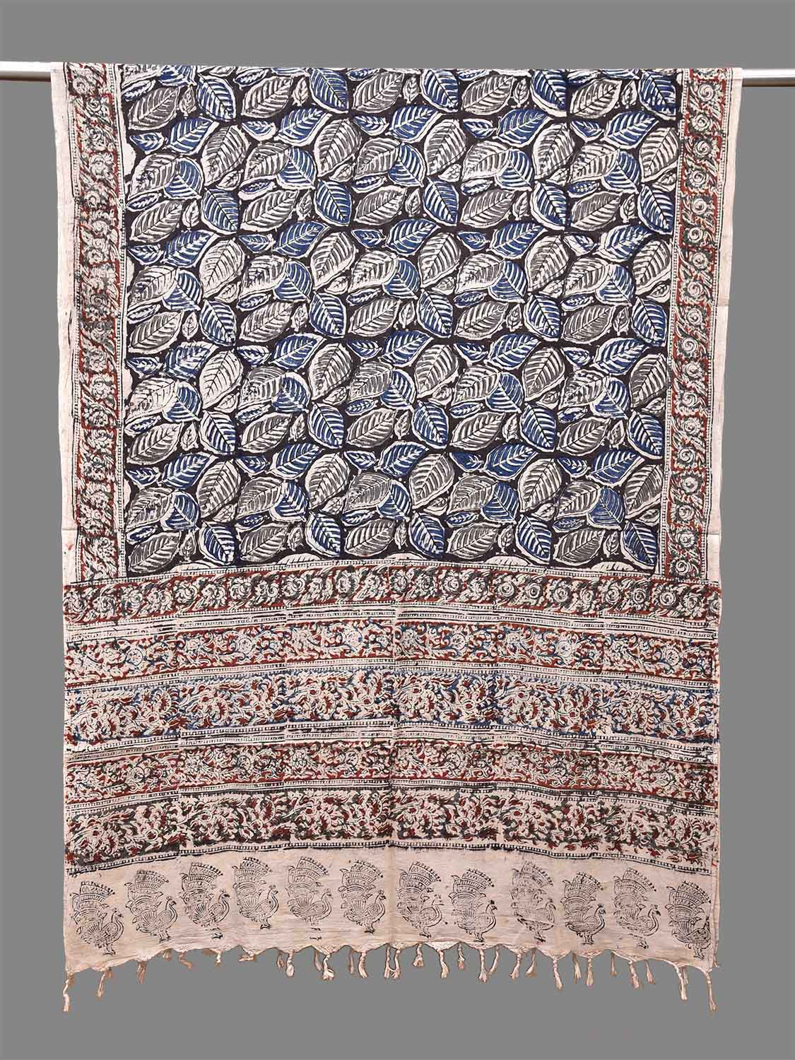 Blue and Red Kalamkari Natural Dye Block Print Cotton Dupatta with Leaves Design ds4045