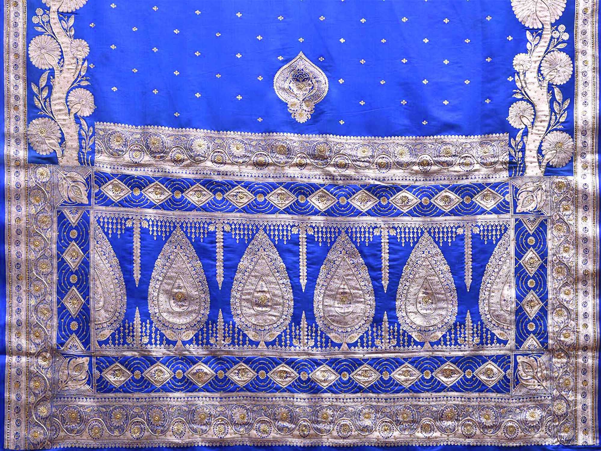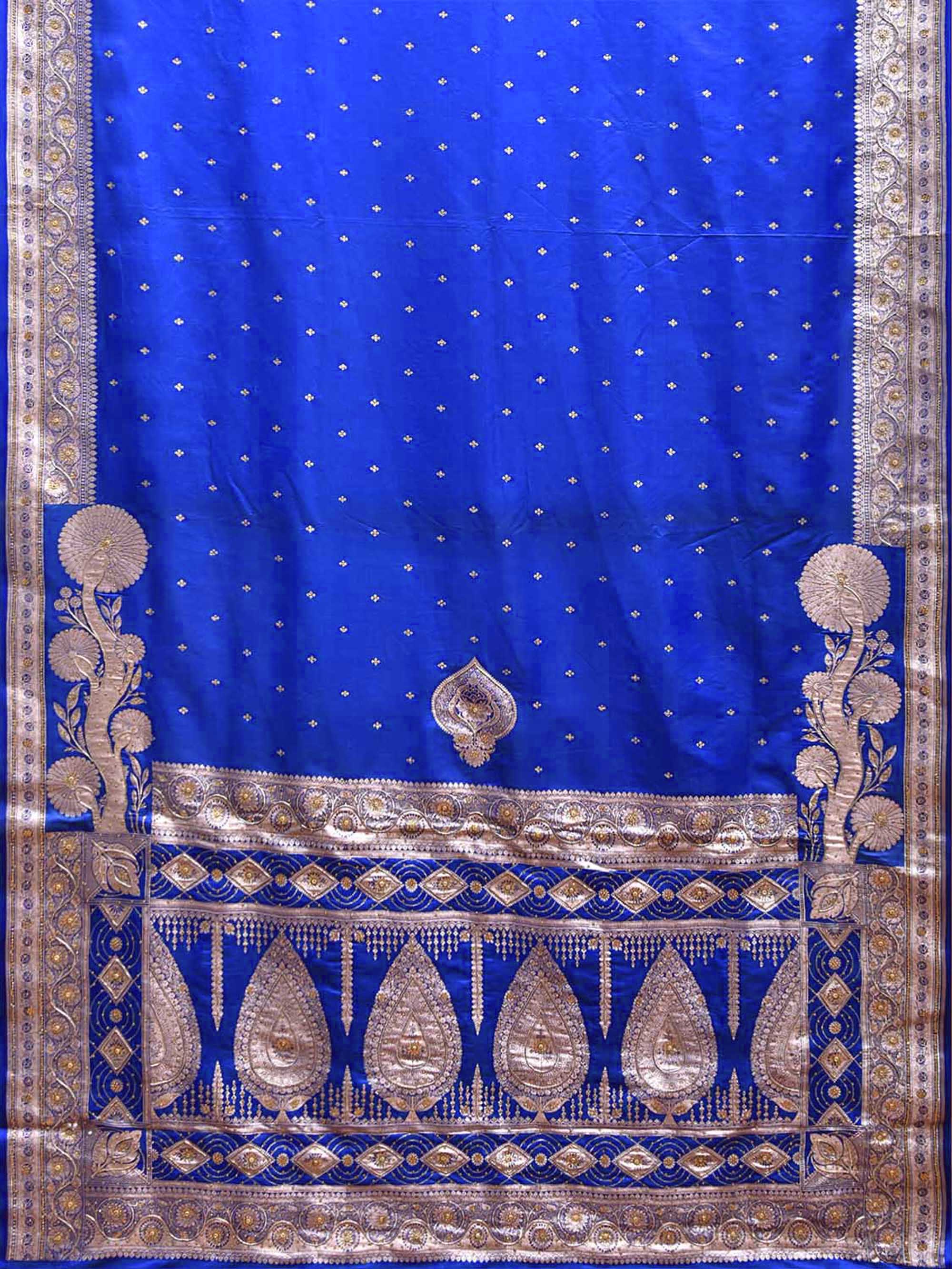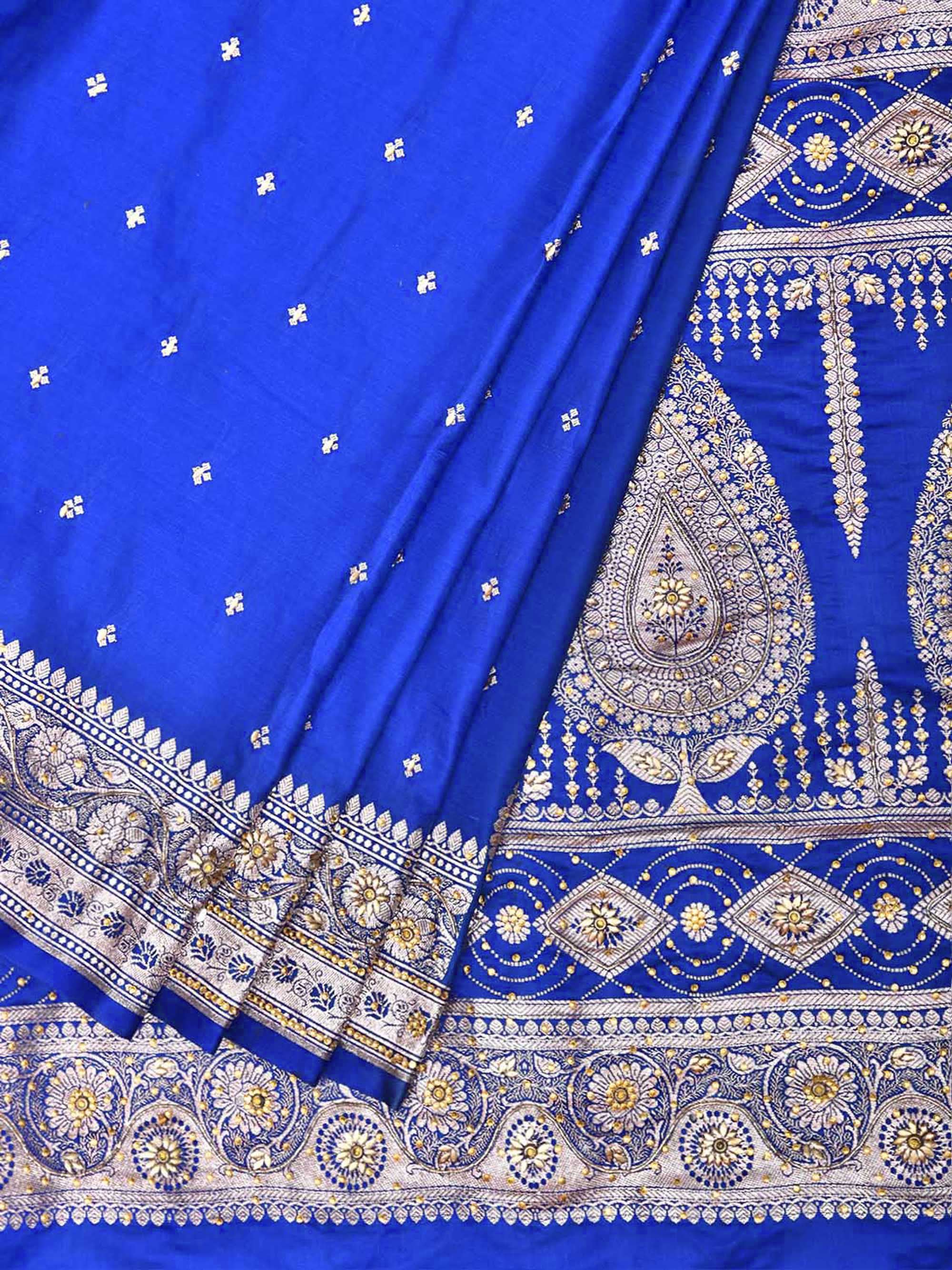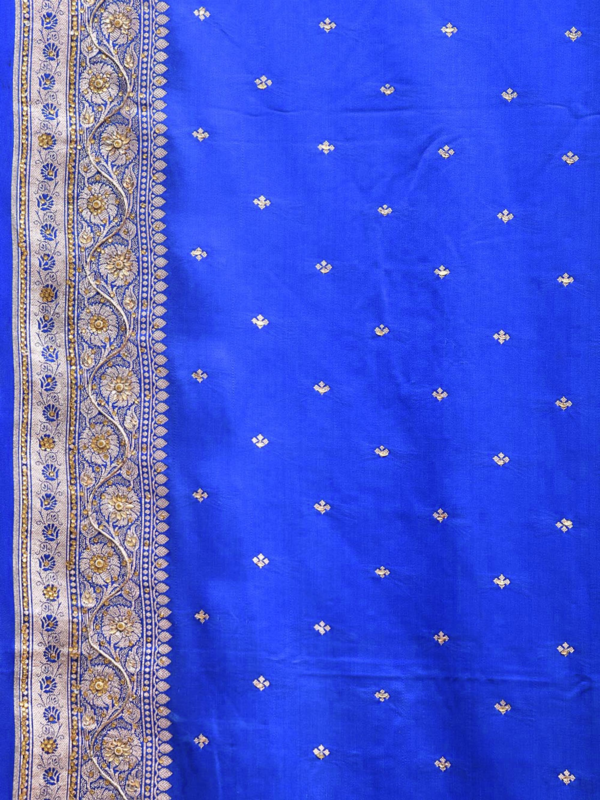 Blue Banaras Katan Saree with Border and Pallu Design. Banaras Sarees are considered one of finest sarees with gold or silver zari work, and colorful design makes it the saree for various occassions. For fabric care we advise dry clean.