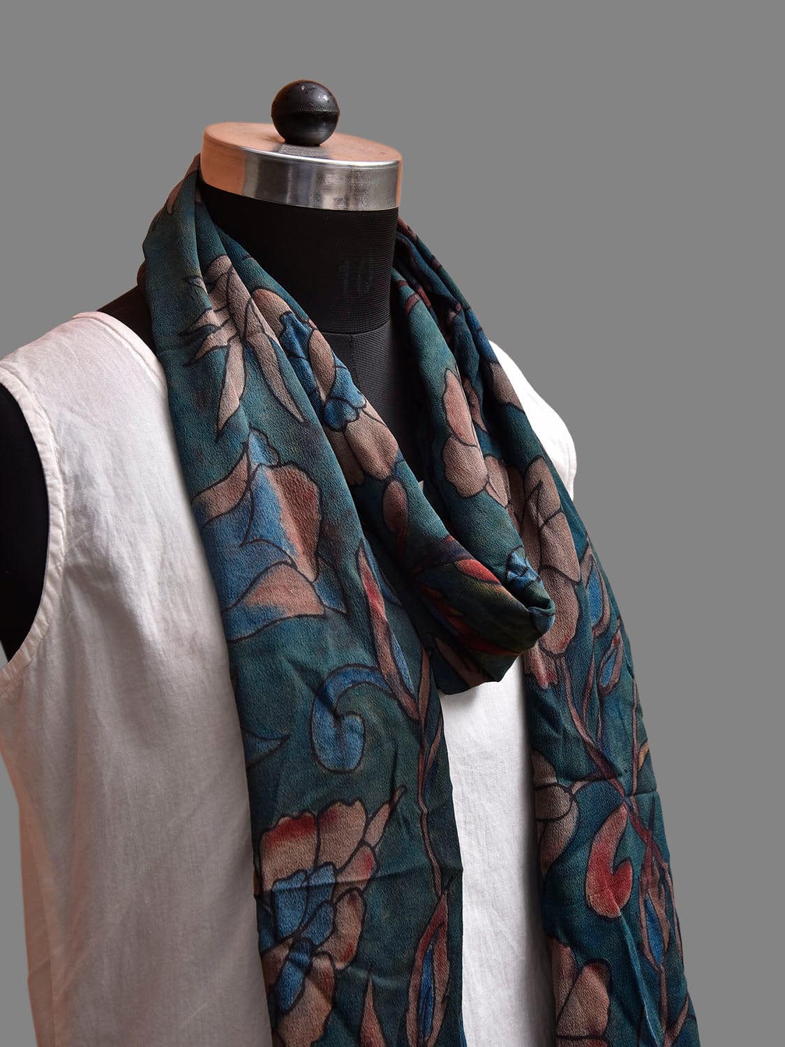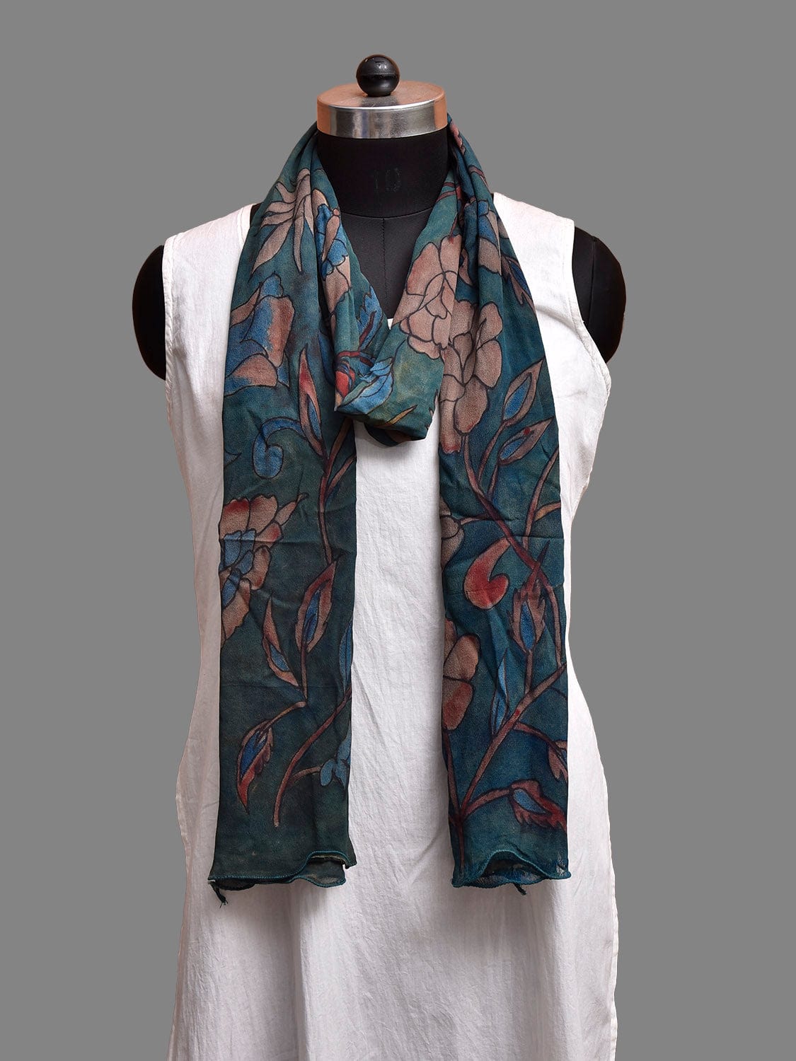 Blue Kalamkari Hand Painted Crepe Stole with Floral Design. This hand painted kalamkari is done using natural dyes. As they are natural colors they bleed with initial washes, so we suggest Dry clean.