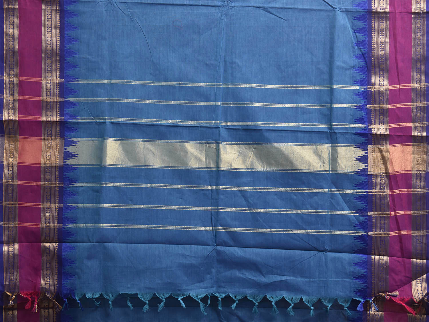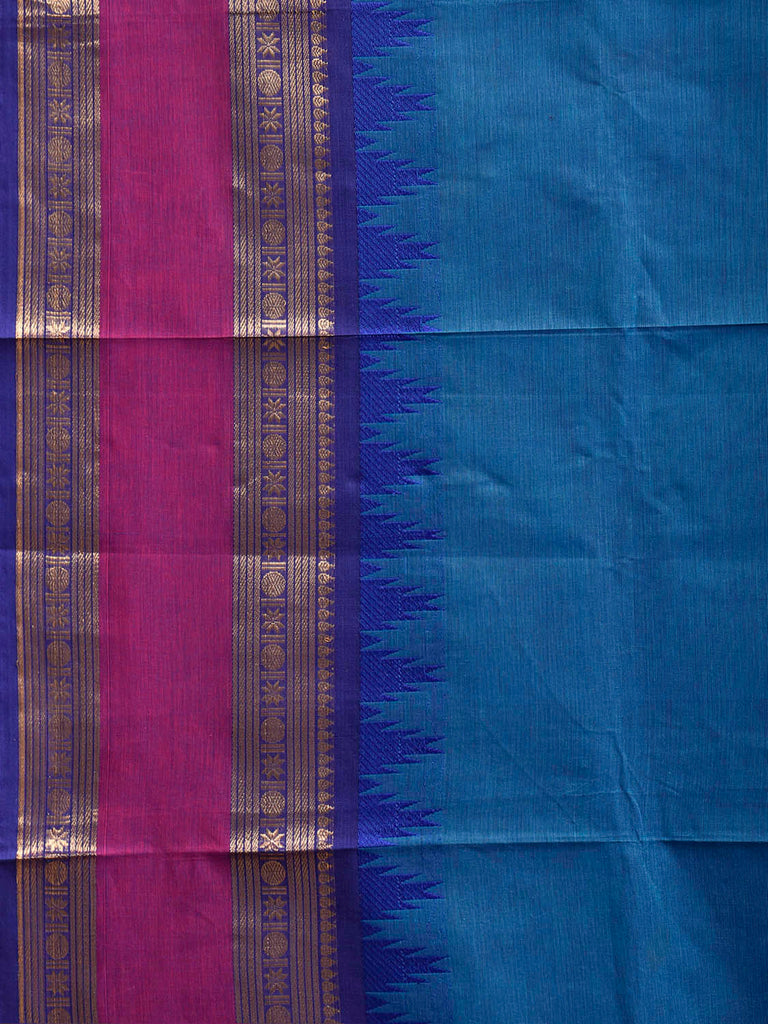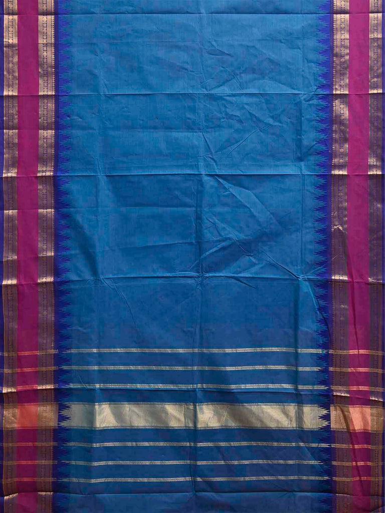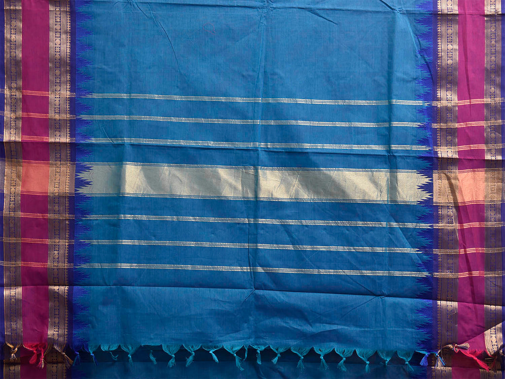 Blue Kanchipuram Cotton Plain Saree with Big Temple Border Design. Traditional Simple South Indian Attire Saree for any Casual Occasions. As it’s a cotton saree we advice gentle handwash separately for fabric care. This saree has no blouse.