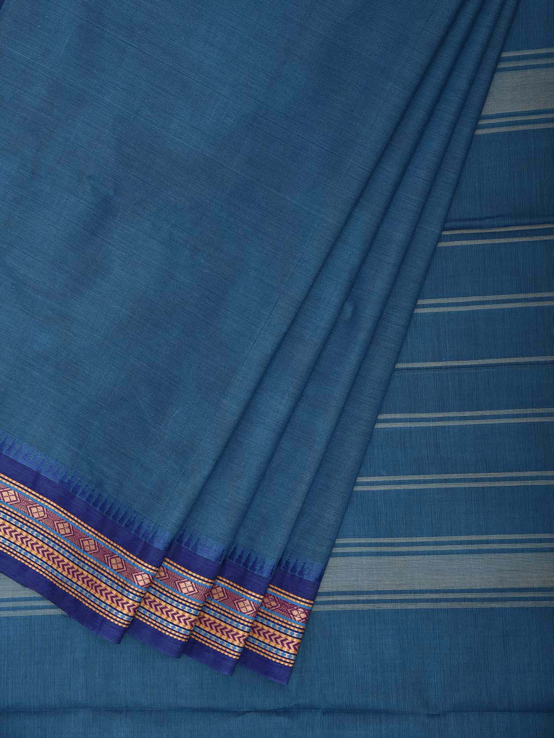 Blue Kanchipuram Cotton Plain Saree with Border and Strips Pallu Design k1069