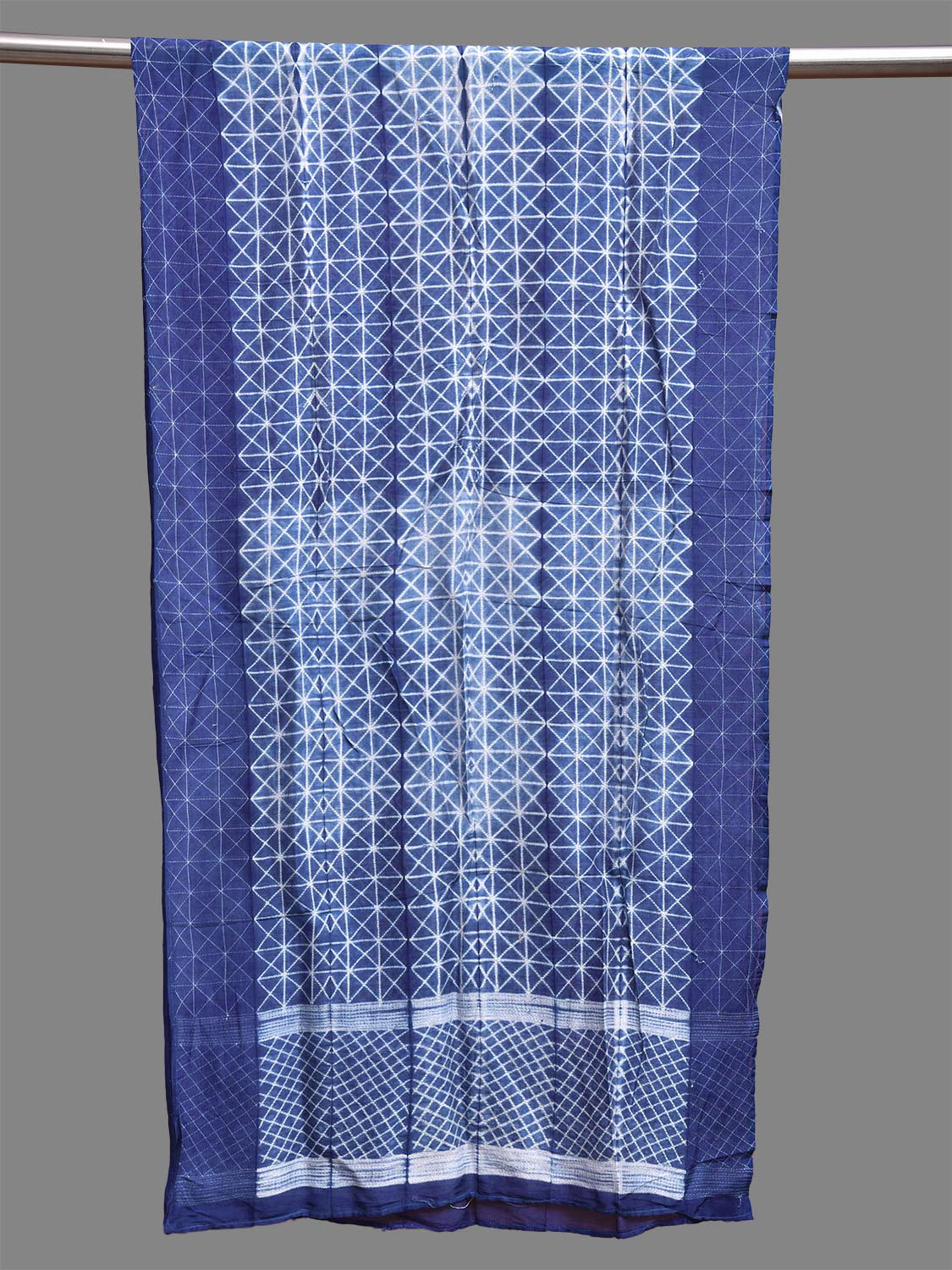 Blue Shibori Cotton Silk Stole with All Over Grill Design. Shibori is Japanese a Technique of tie and dye, and resist some parts by clamping or stitching the fabric. The result produced are unique geometric patterns & any other eloborate design. For fabric care we advise dry clean.