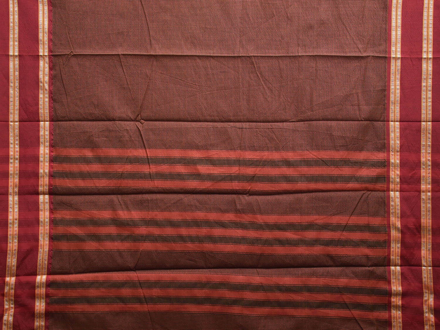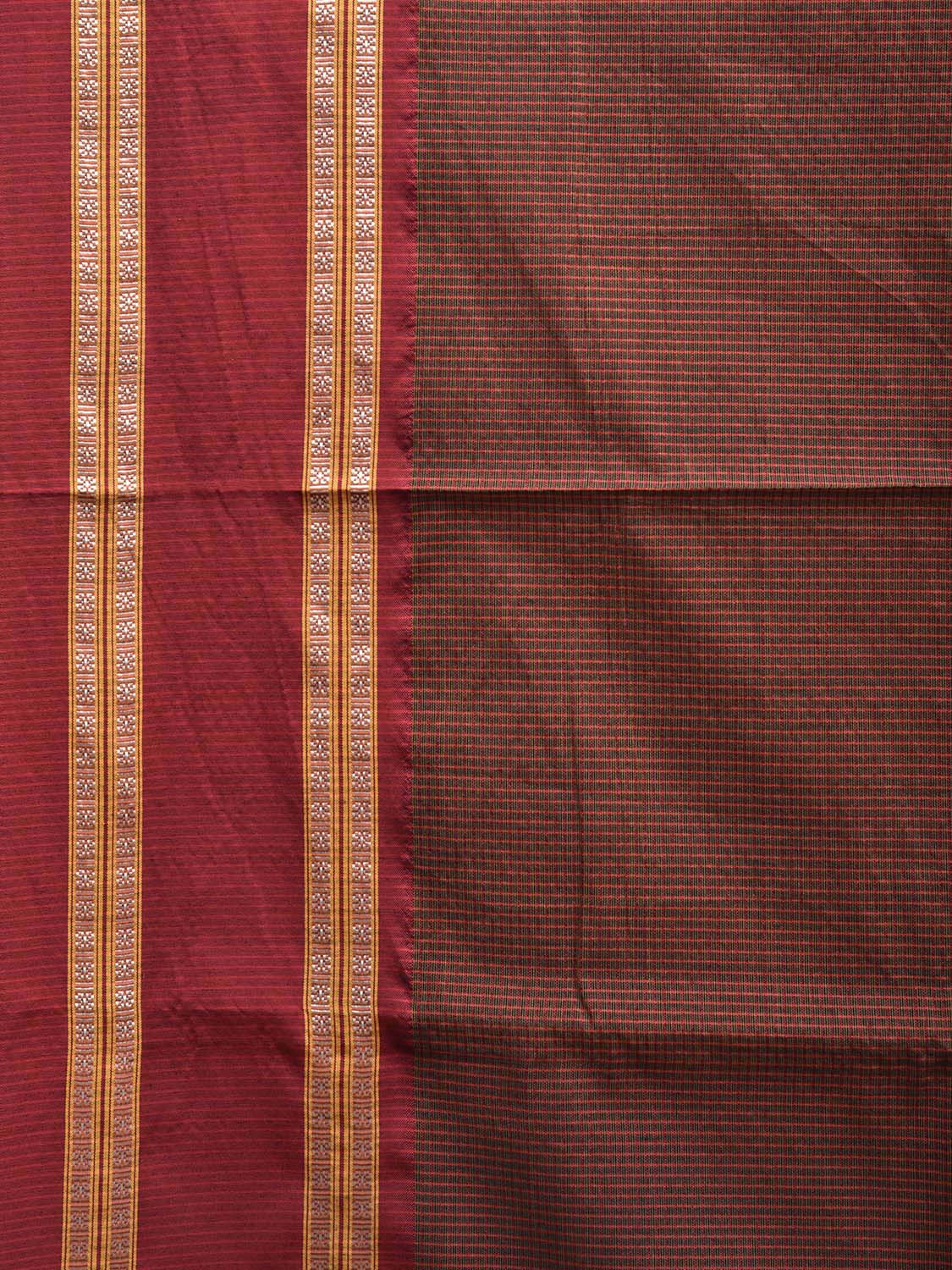 Brown and Maroon Bamboo Cotton Saree with Small Checks and Strips Pallu Design No Blouse. This is a blend of bamboo and cotton fibers, they have characteristics of both bamboo and cotton combined into one fabric. We Advise Gentle Handwash for Fabric Care. This Saree has no Blouse.