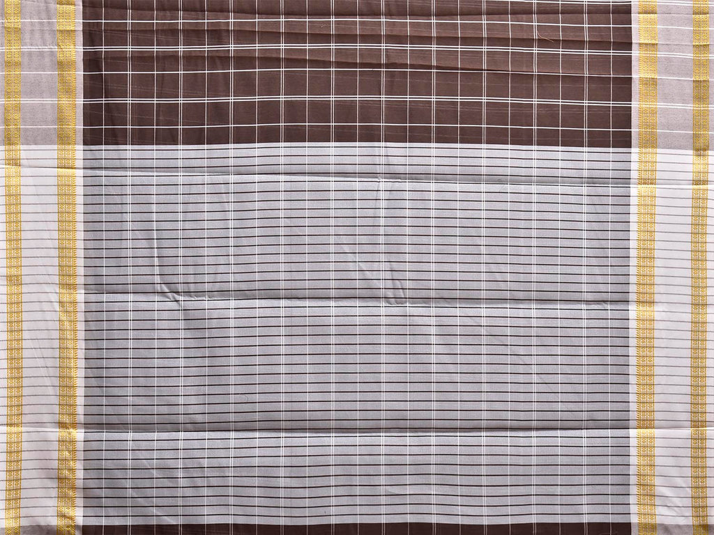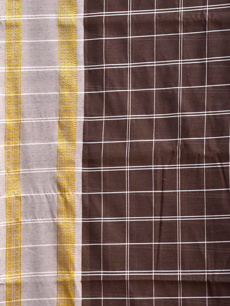 Brown and White Bamboo Cotton Saree with Big Checks Design No Blouse. This is a blend of bamboo and cotton fibers, they have characteristics of both bamboo and cotton combined into one fabric. We Advise Gentle Handwash for Fabric Care. This Saree has no Blouse.
