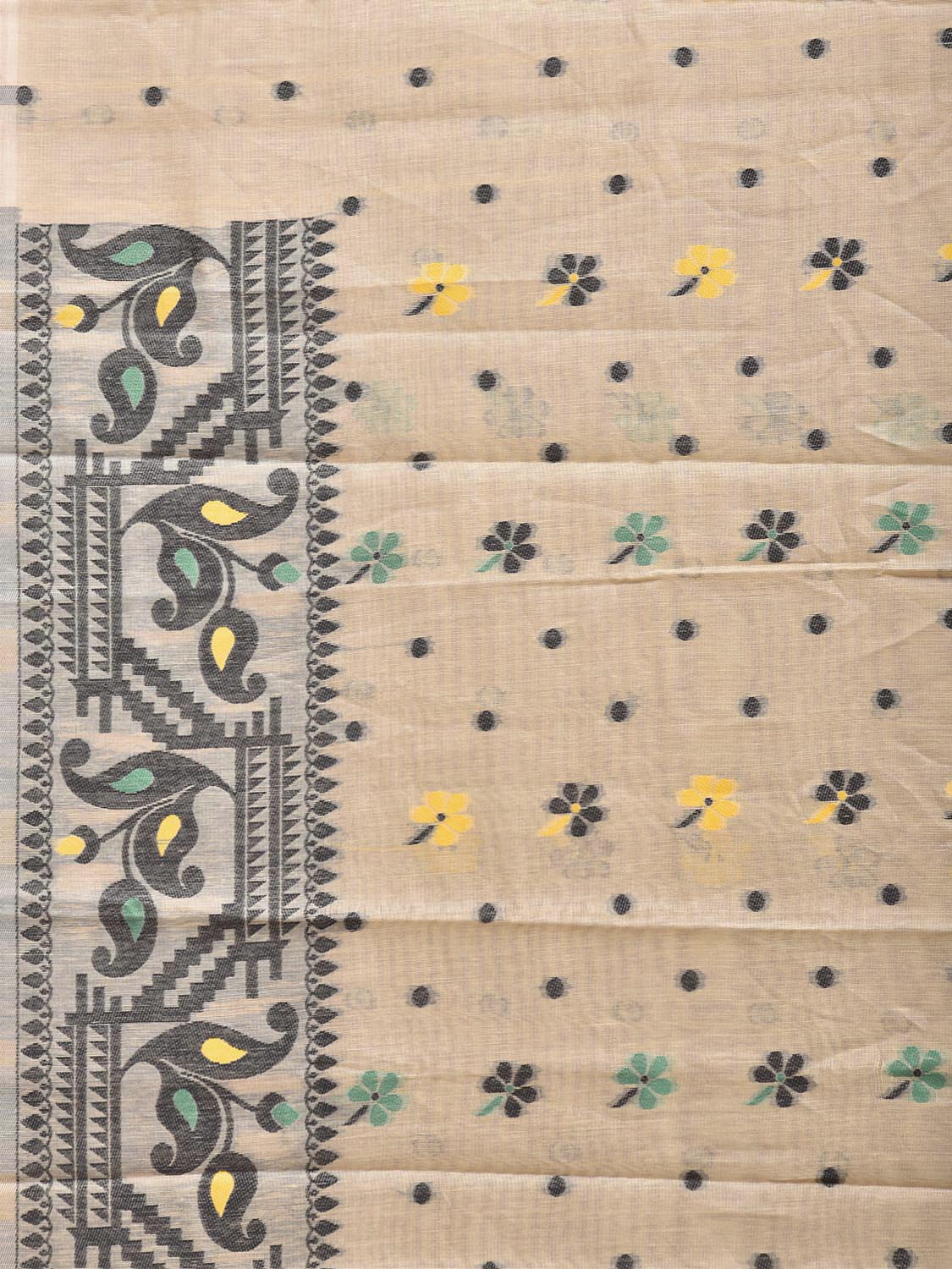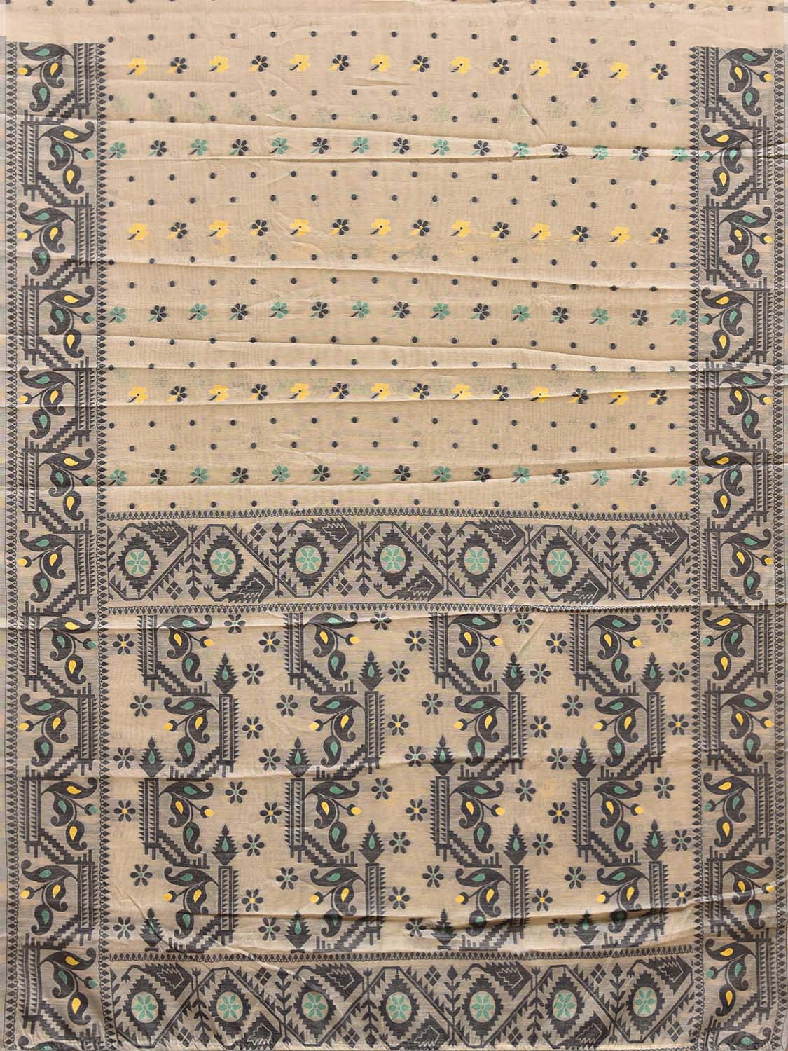 Cream and Black Dhakai Jamdani Cotton Viscose Saree with Pallu and Border Design. These are some of the traditional Dhakai Jamdani designs, these sarees have geometric designs and sometimes floral or combination of both. We advice gentle handwash separately for fabric care.