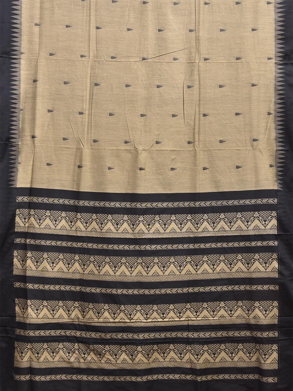 Cream and Black Gadwal Cotton Viscose Saree with Temple Border and Pallu Design. Gadwal Sarees are known for their traditional design of border and pallu made of silk and body being either cotton or silk. They are known as Sico sarees for border and pallu being silk and body being cotton. We advice dry clean for fabric care.