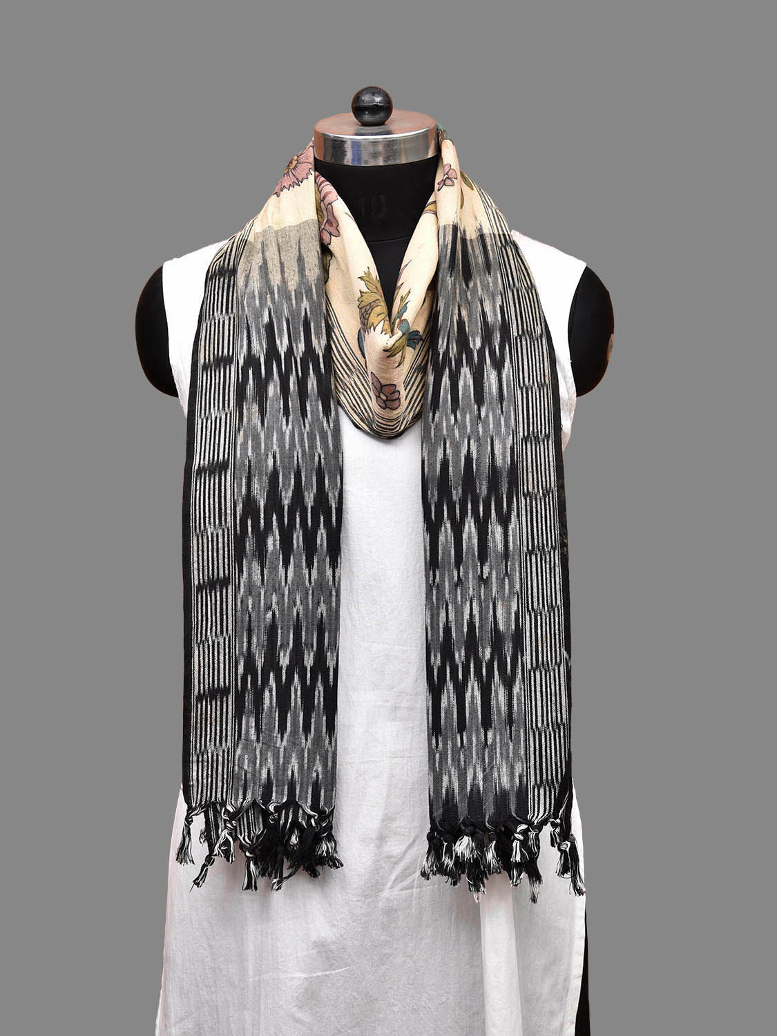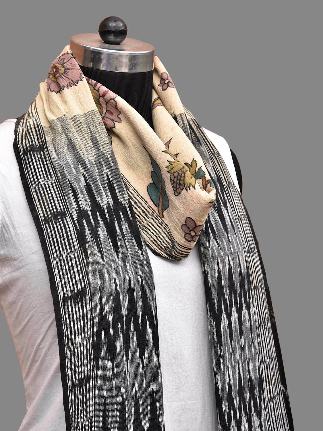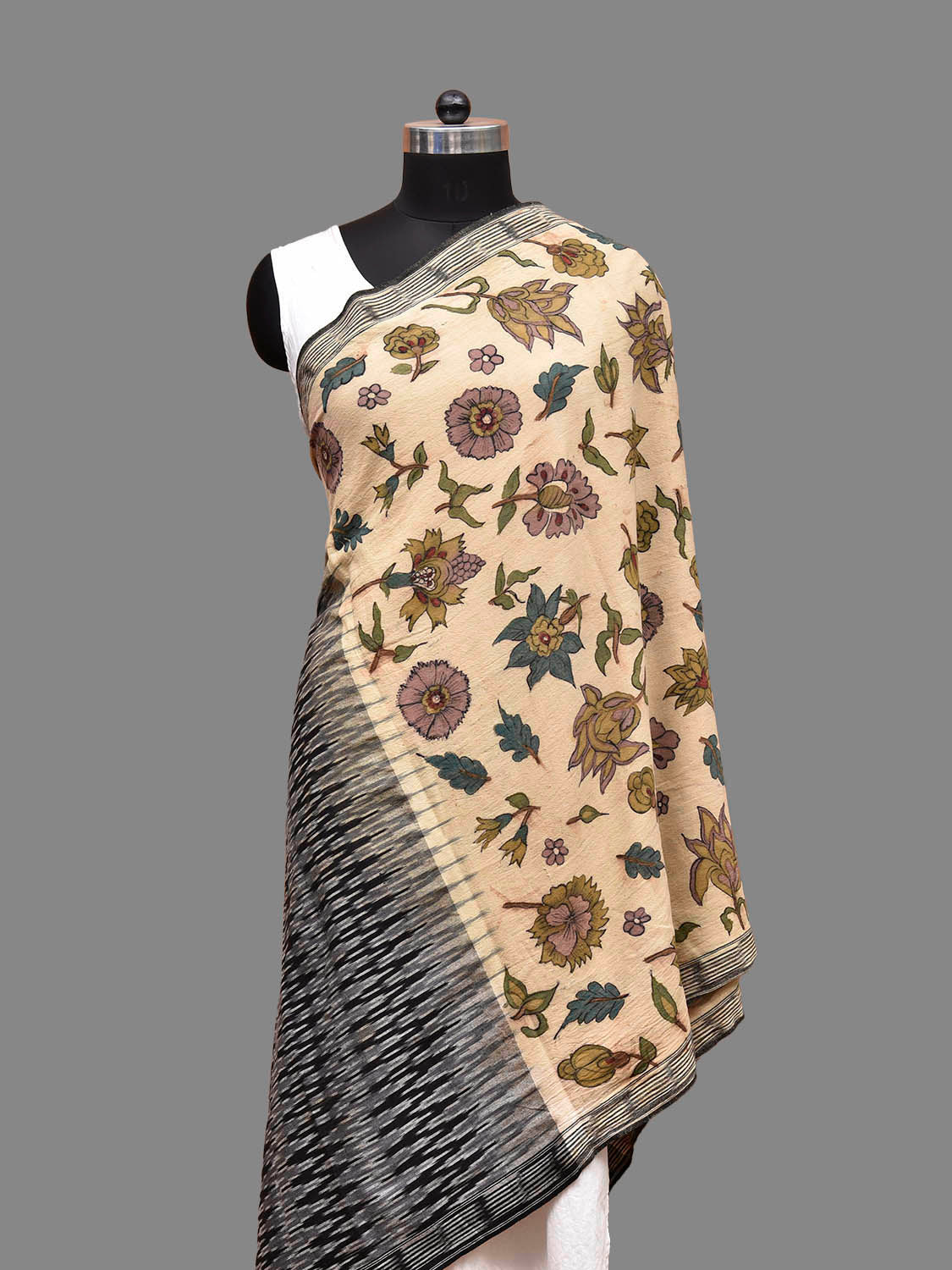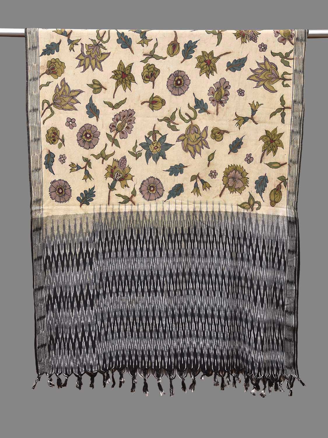 Cream and Black Kalamkari Hand Painted Ikat Cotton Handloom Dupatta with Floral Design. This hand painted kalamkari is done using natural dyes. As they are natural colors they bleed with initial washes, so we suggest Dry clean.