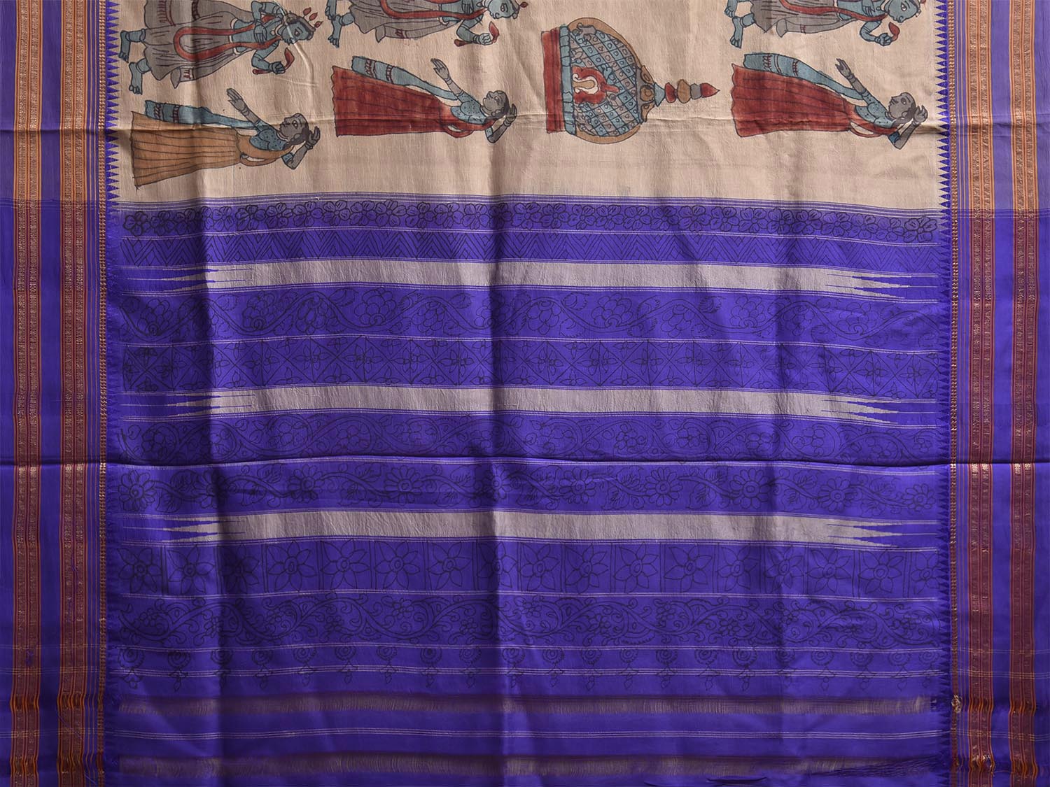 Cream and Dark Blue Kalamkari Hand Painted Narayanpet Pure Silk Saree with All Over Design No Blouse. This hand painted kalamkari is done using natural dyes. As they are natural colors they bleed with initial washes, so we suggest Dry clean. This Saree has No Blouse.