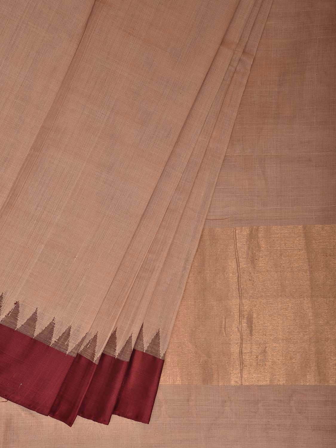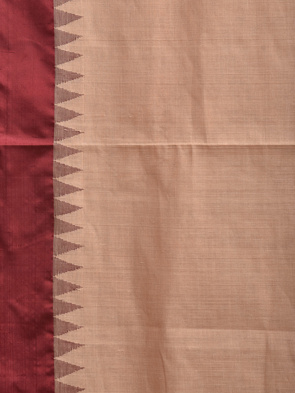 Cream and Maroon Khadi Cotton Handloom Palin Saree with Small Temple Border Design. Khadi saree is primarily woven from cotton and may also include silk, or wool. It is a versatile fabric, cool in summer and warm in winter. For fabric care we advise dry clean.