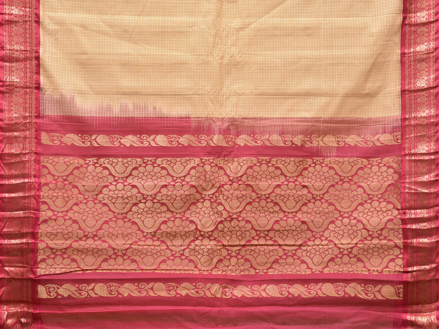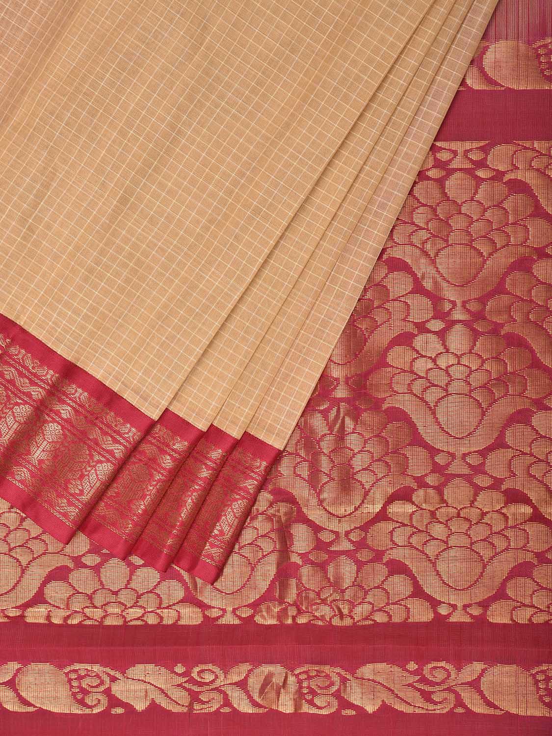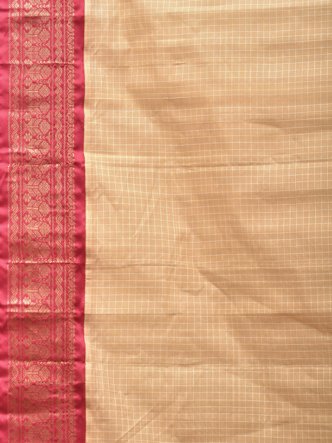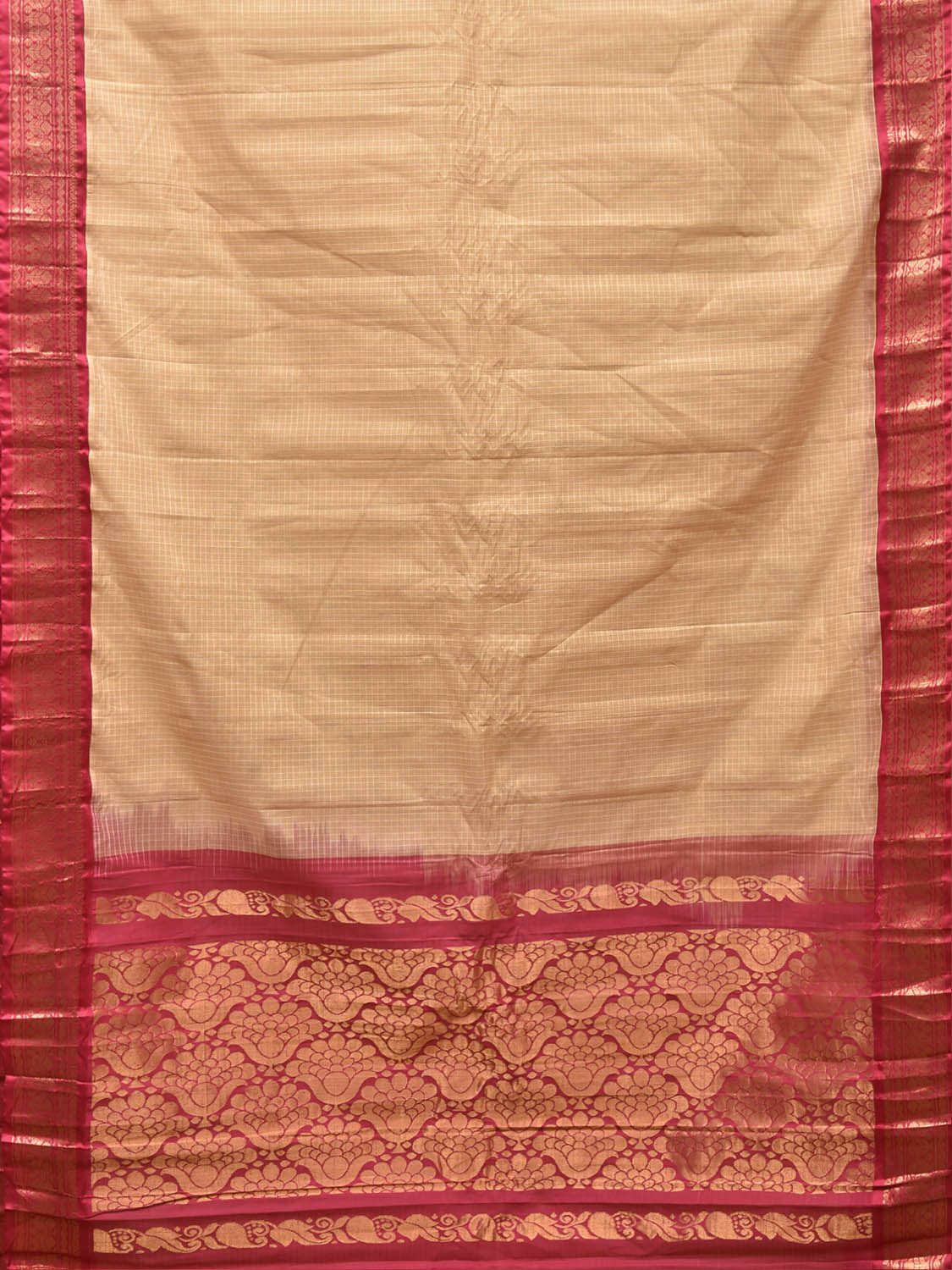 Cream and Red Gadwal Cotton Viscose Saree with Checks and Pallu Design No Blouse. Gadwal Sarees are known for their traditional design of border and pallu made of silk and body being either cotton or silk. They are known as Sico sarees for border and pallu being silk and body being cotton. We advice dry clean for fabric care. This saree has no blouse.