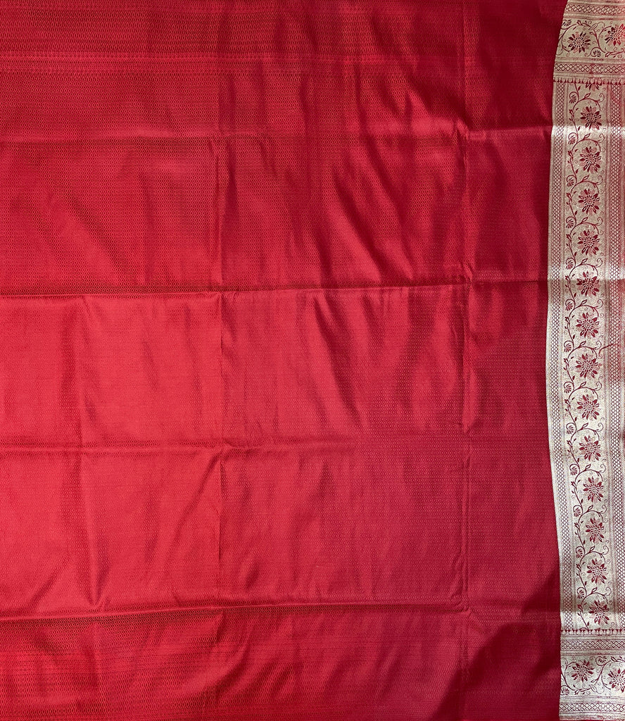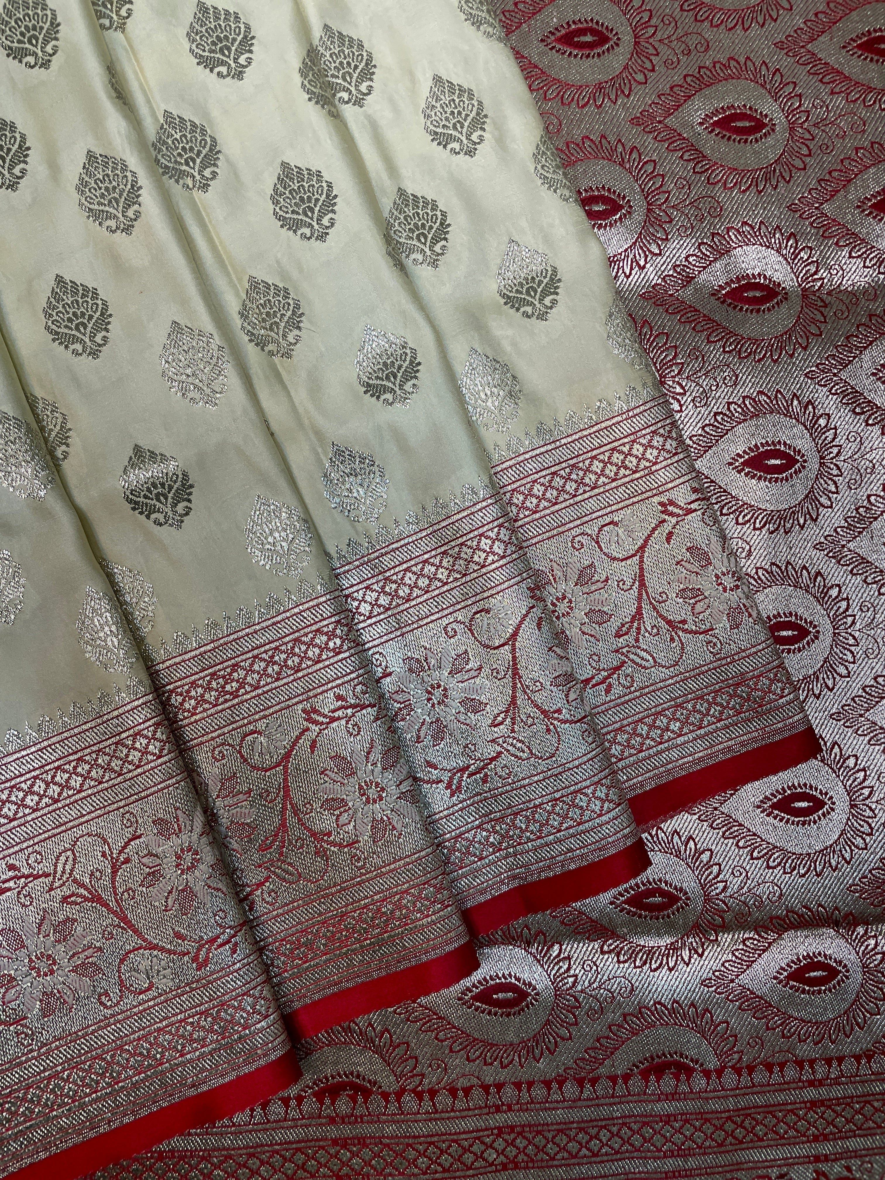 Cream And Red Katan Banarasi Saree with Silver Zari Floral Weaving And Grand Pallu B0614ds