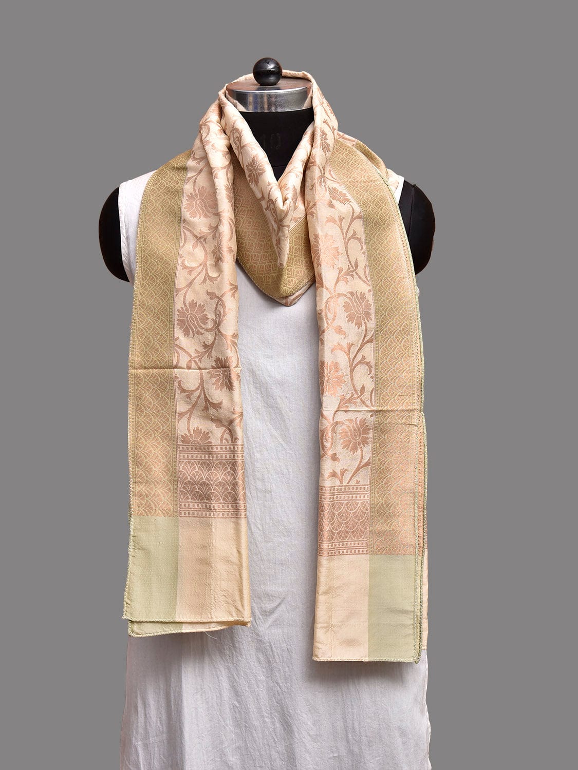 Cream Banaras Katan Silk Stole with Floral Design. We Advise Dry Clean for Fabric Care.
