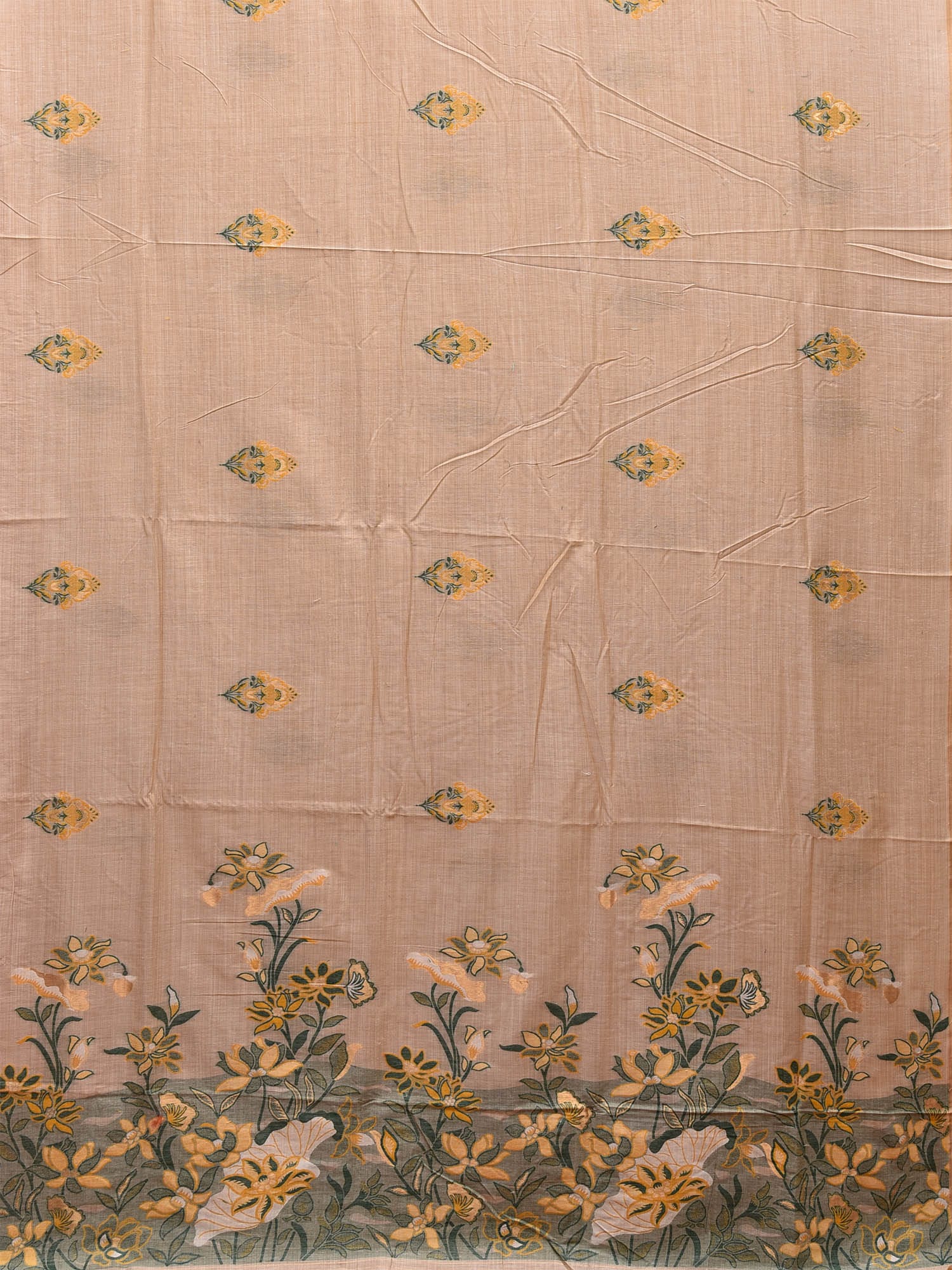 Cream Dhakai Jamdani Cotton Viscose Saree with Body Buta and Floral Pallu Design. These are some of the traditional Dhakai Jamdani designs, these sarees have geometric designs and sometimes floral or combination of both. We advice dry clean for fabric care.