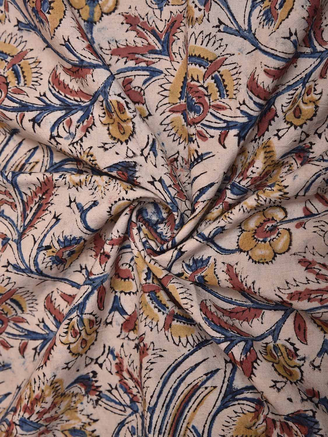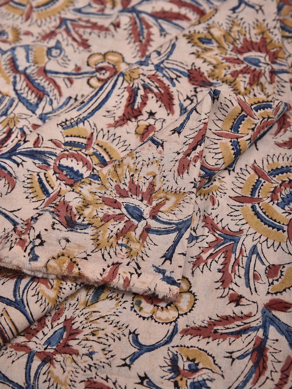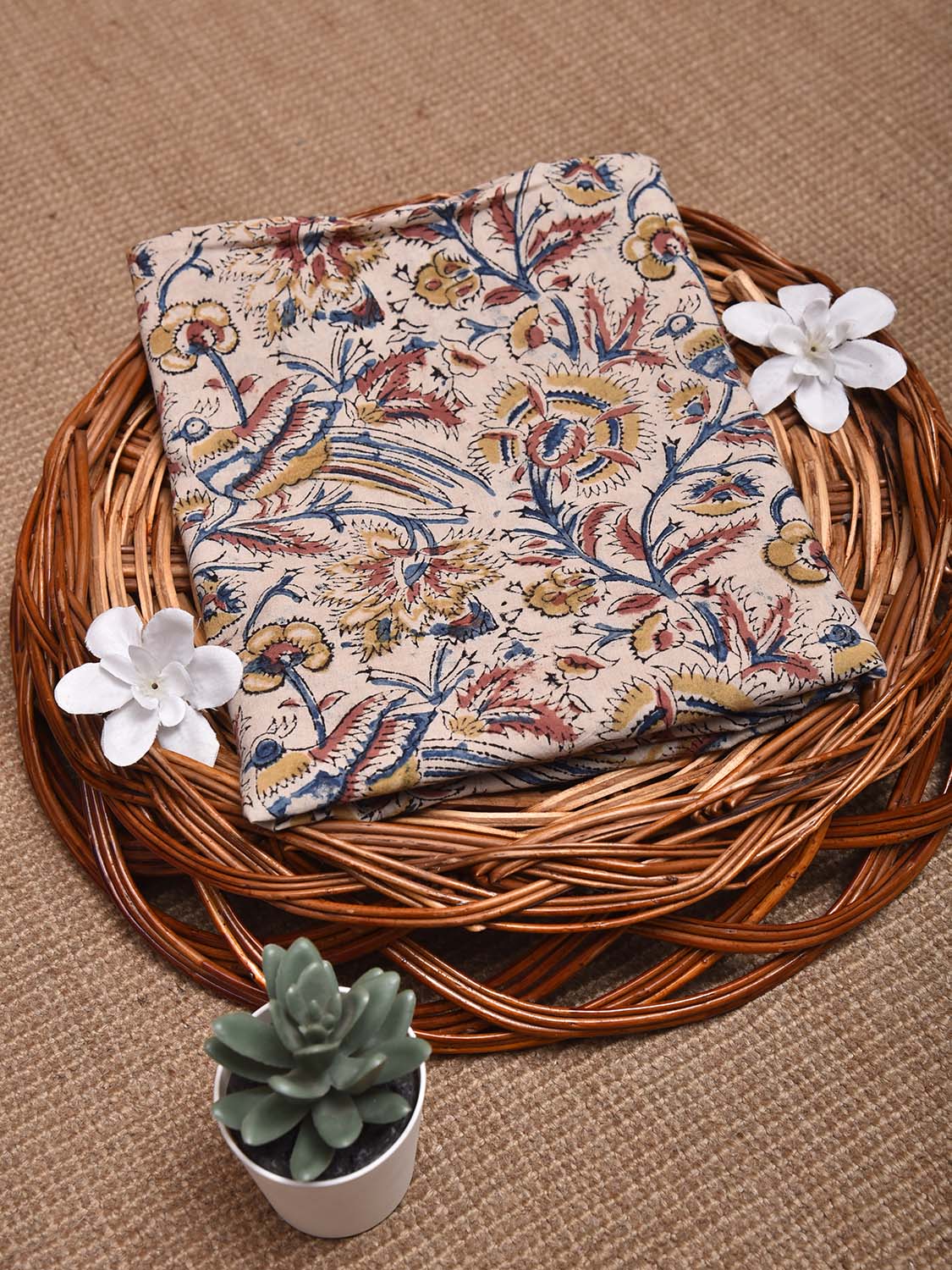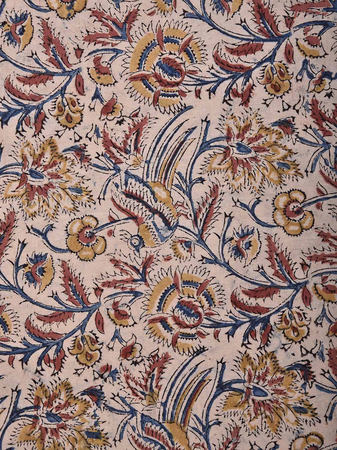 Cream Kalamkari Block Print Cotton Blouse with Flowers and Birds Design 1.2mt Length 35 Inches Width. Beautiful Pattern Blouse Fabric and Easy to Match to Any Suitable Saree. For fabric care we advise gentle handwash separately as they may bleed in the initial wash.