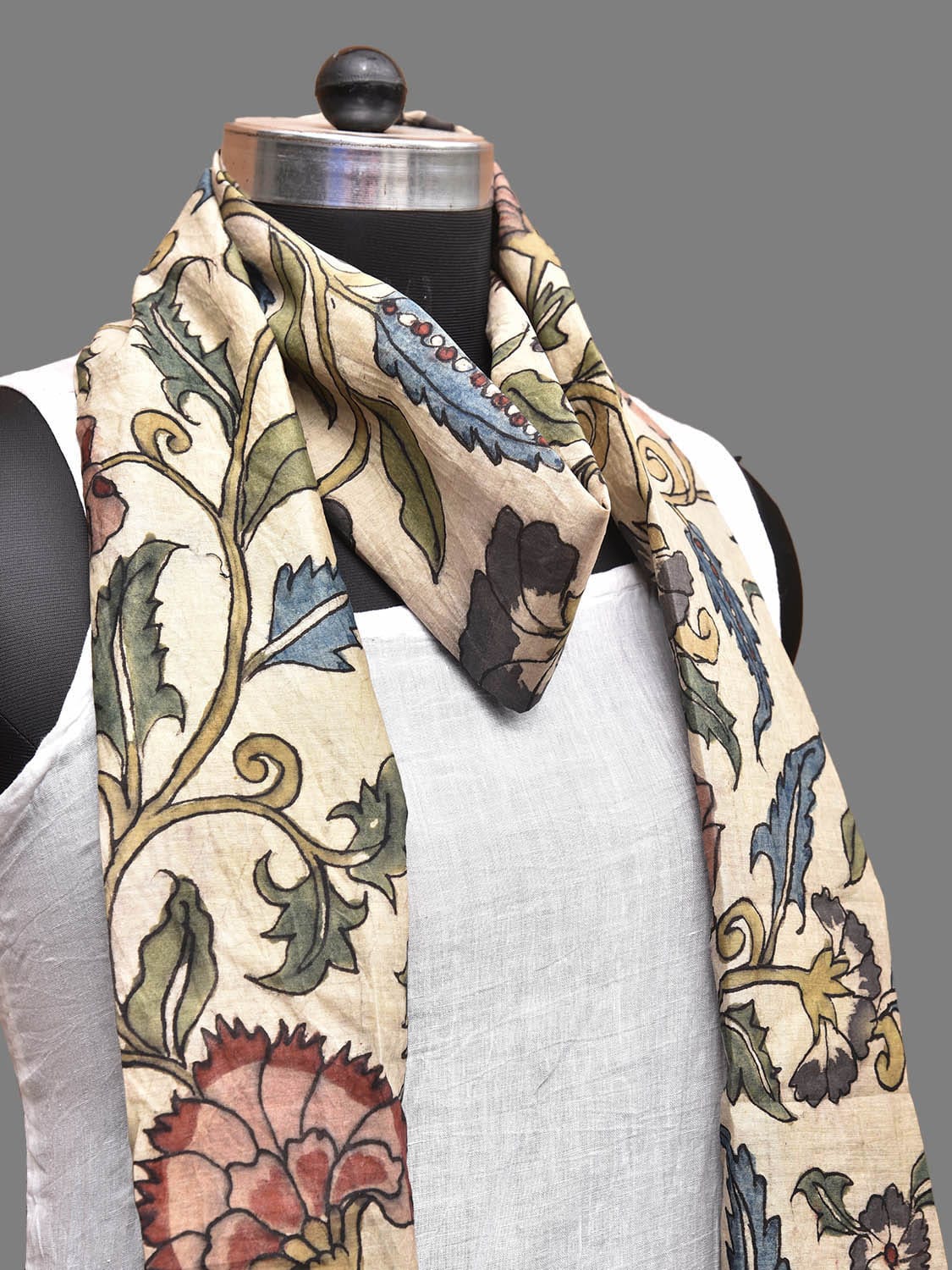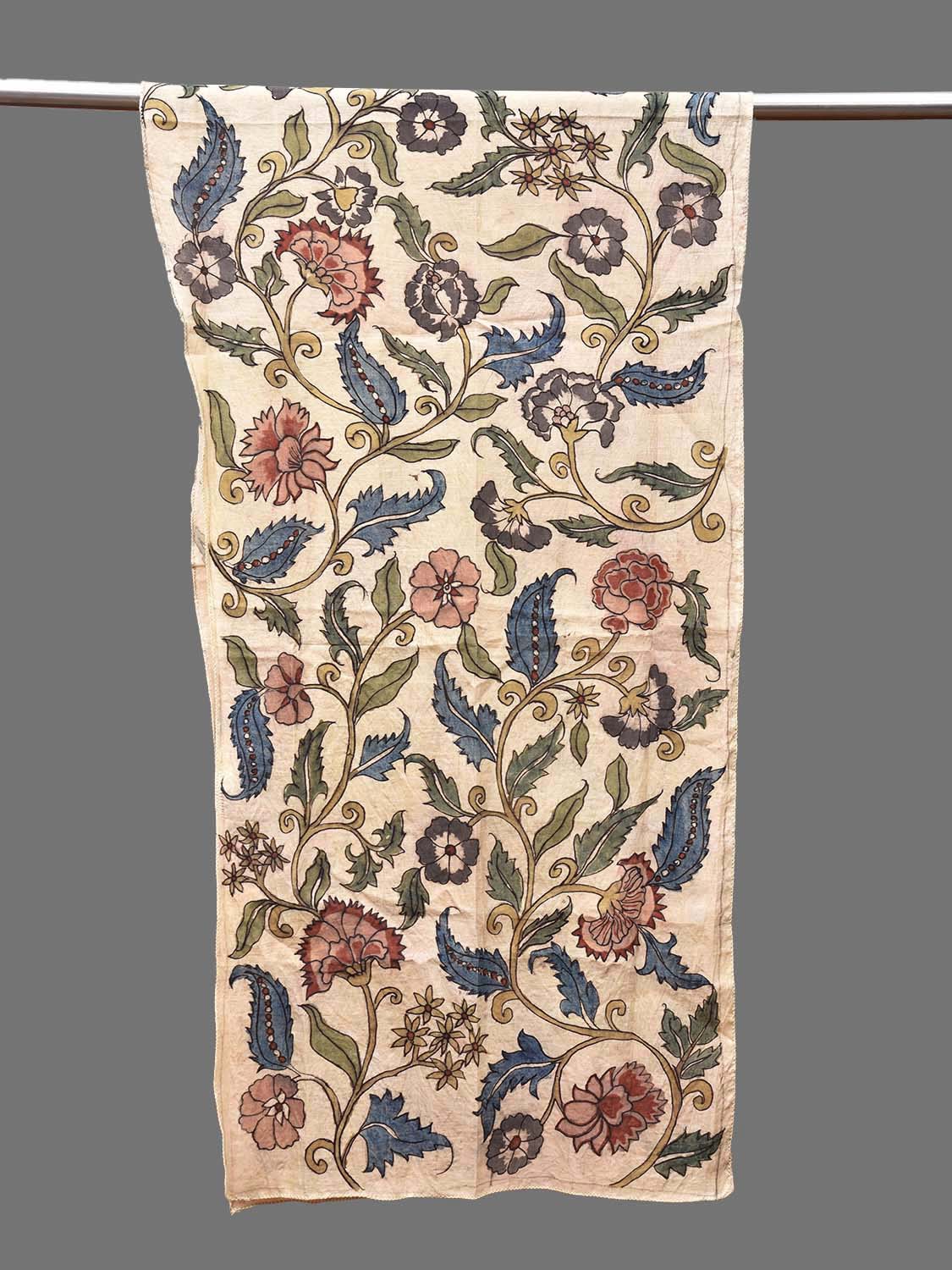 Cream Kalamkari Hand Painted Sico Stole with Floral Design. This hand painted kalamkari is done using natural dyes. As they are natural colors they bleed with initial washes, so we suggest Dry clean.
