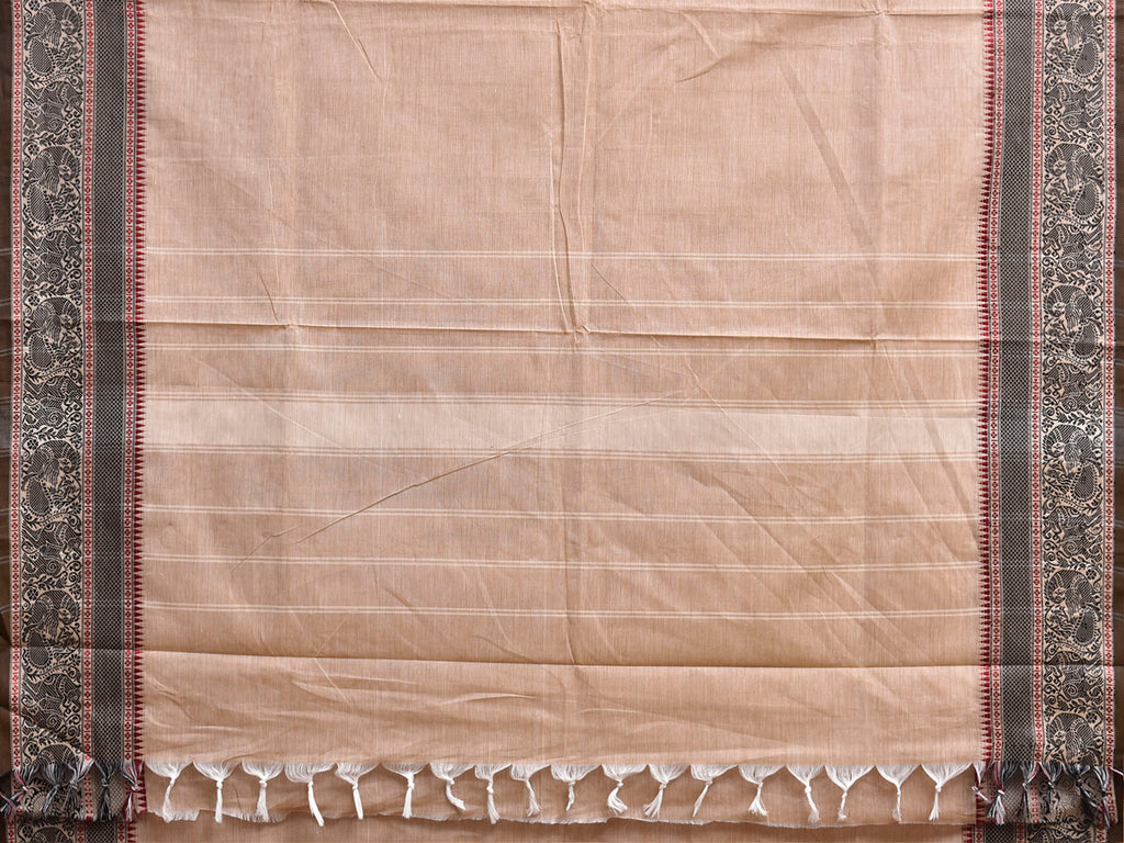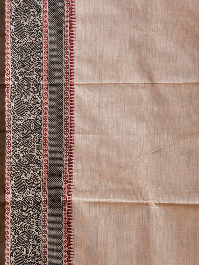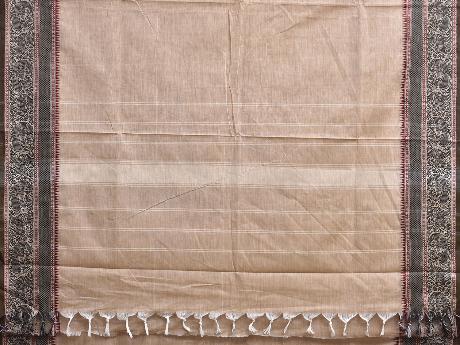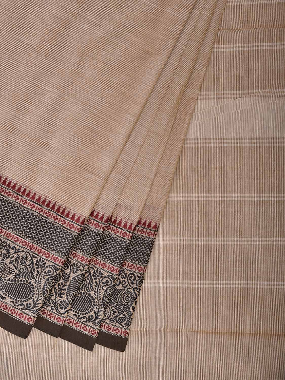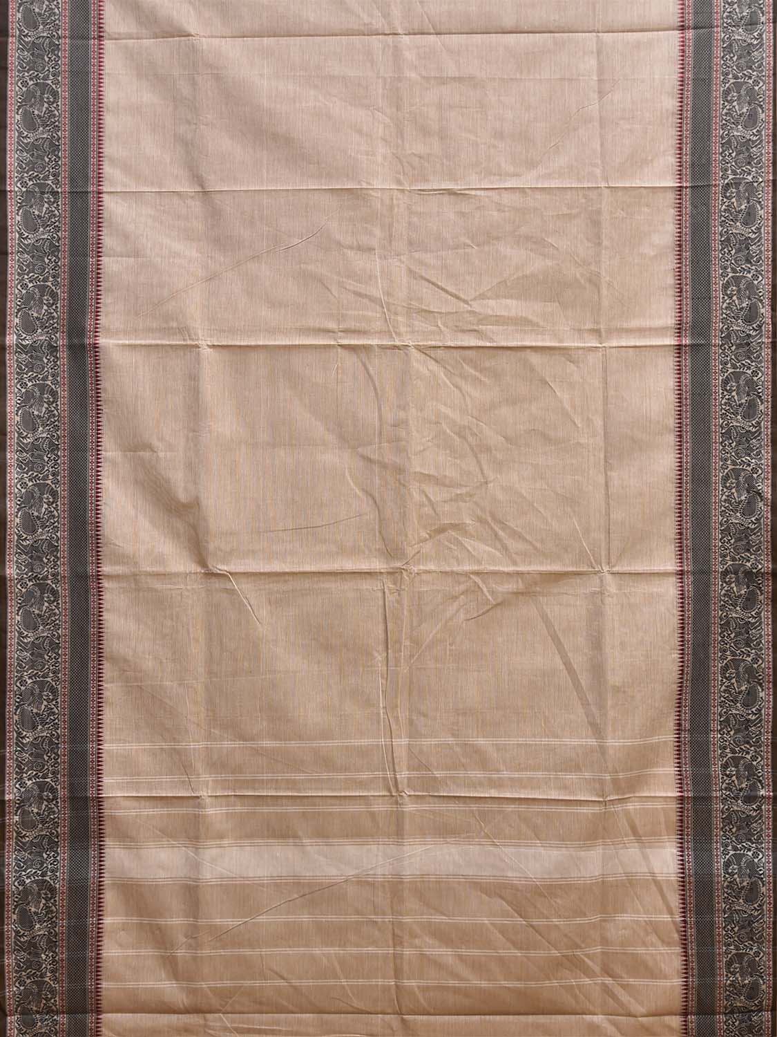 Cream Kanchipuram Cotton Plain Saree with Strips Pallu and Border Design. Traditional Simple South Indian Attire Saree for any Casual Occasions. As it’s a cotton saree we advice gentle handwash separately for fabric care. This saree has no blouse.