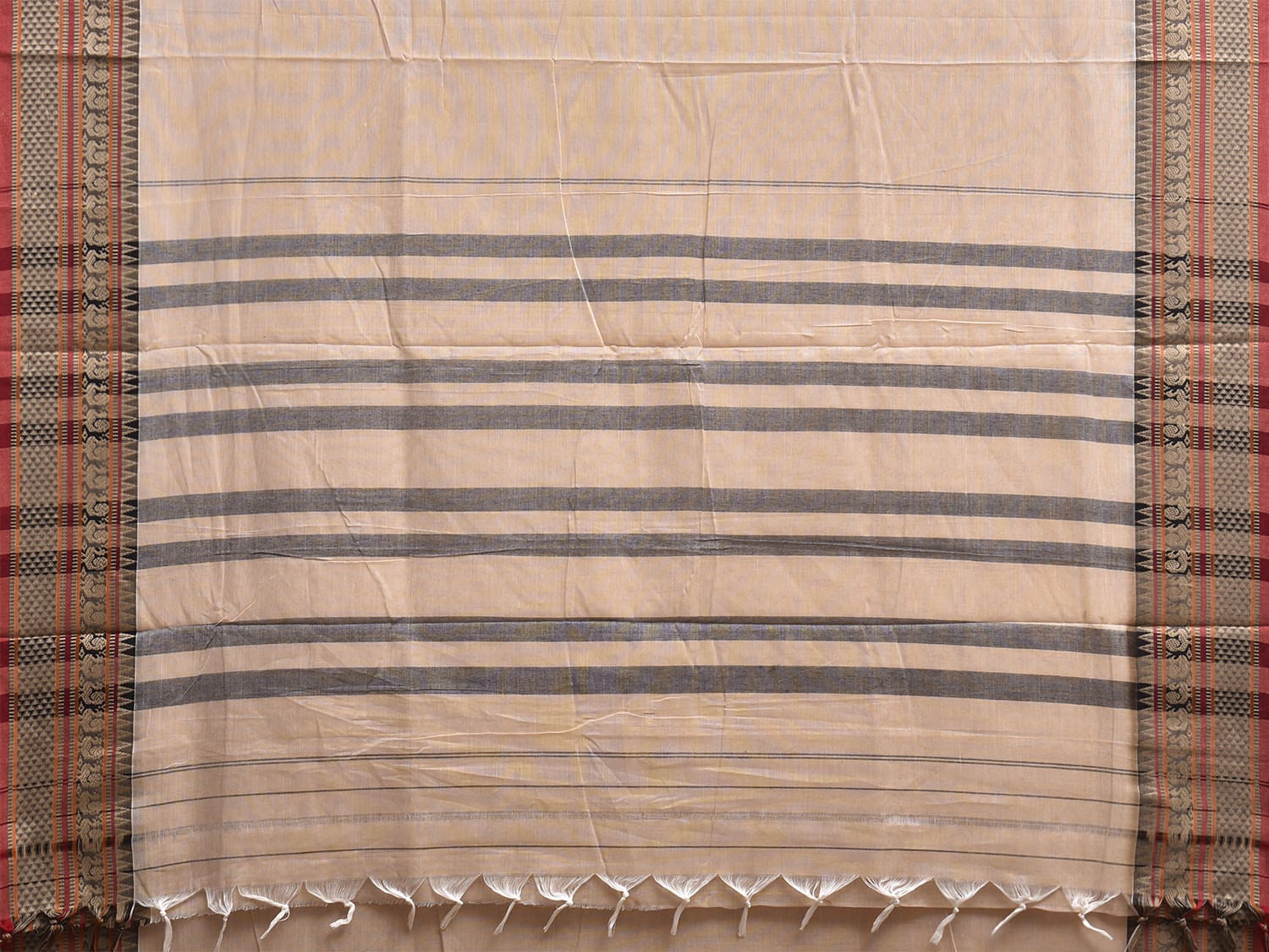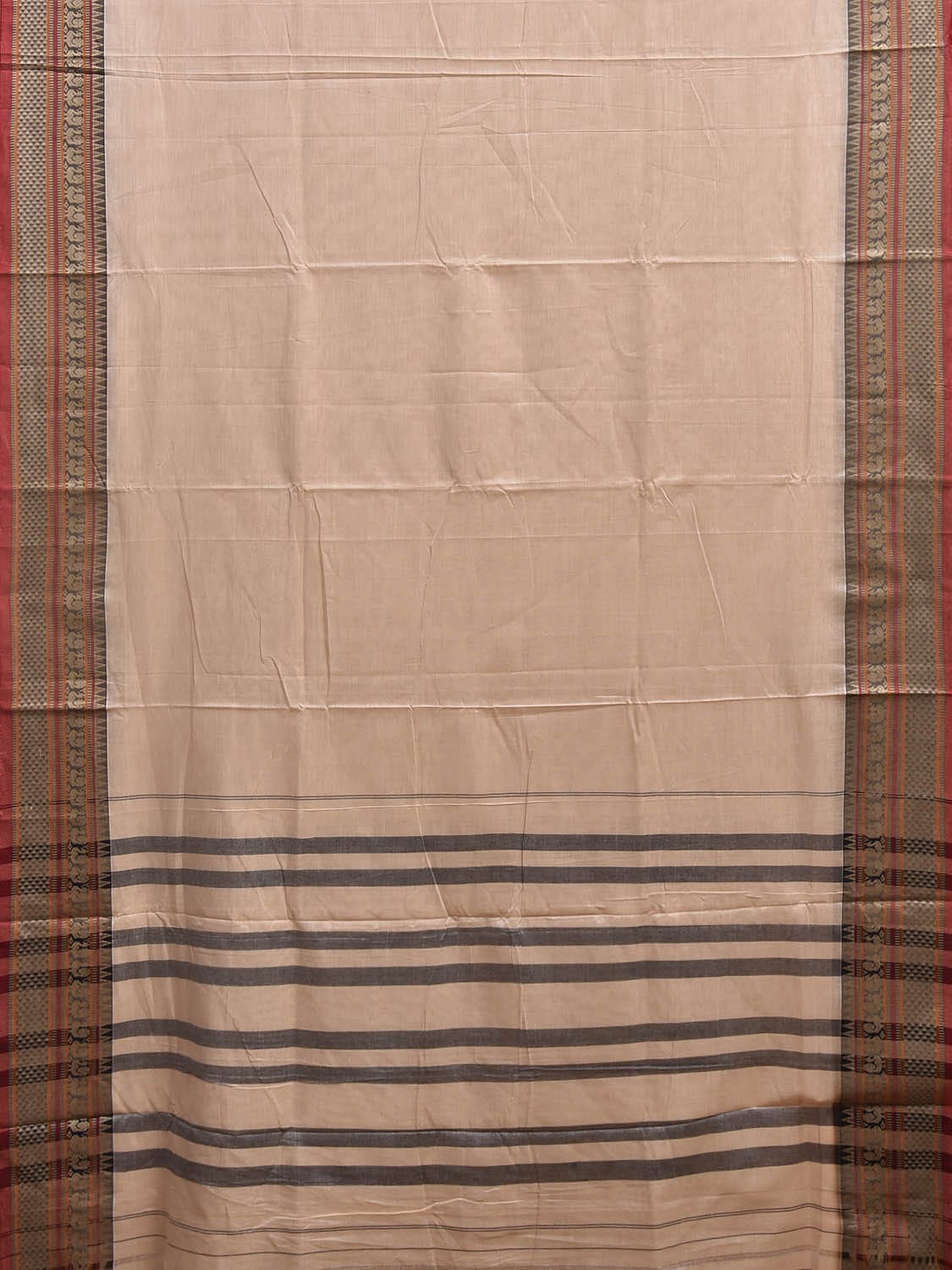 Cream Narayanpet Cotton Plain Saree with Kanchi Border and Strips Pallu Design No Blouse