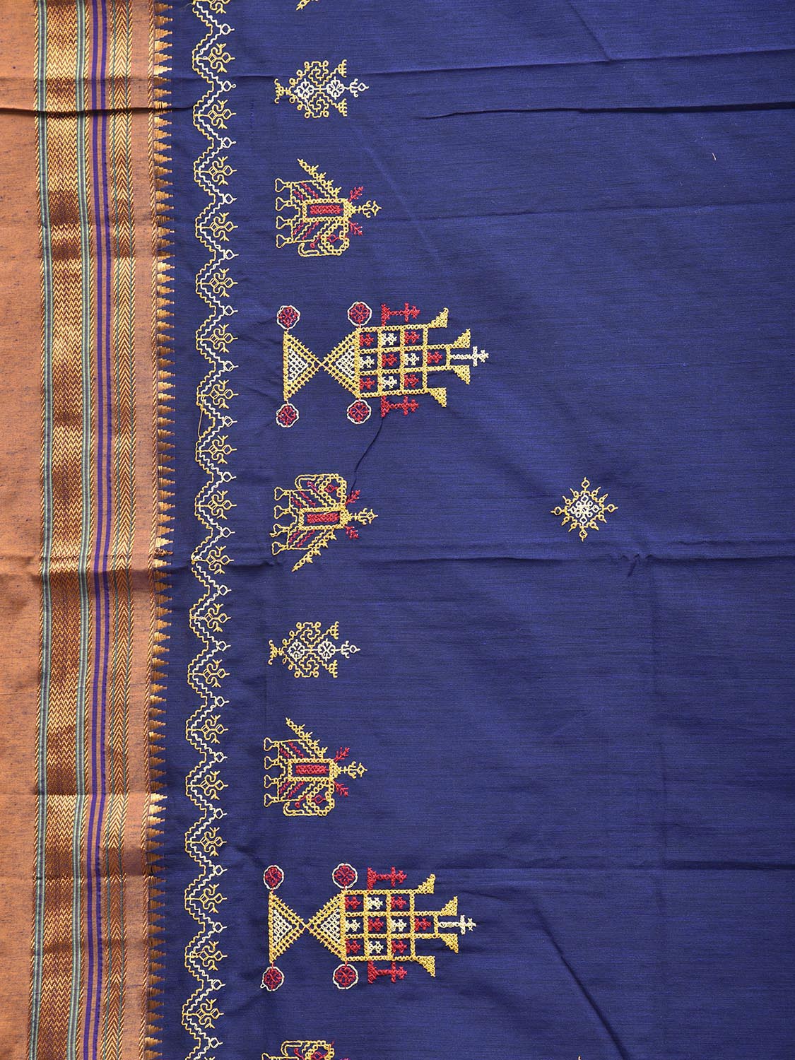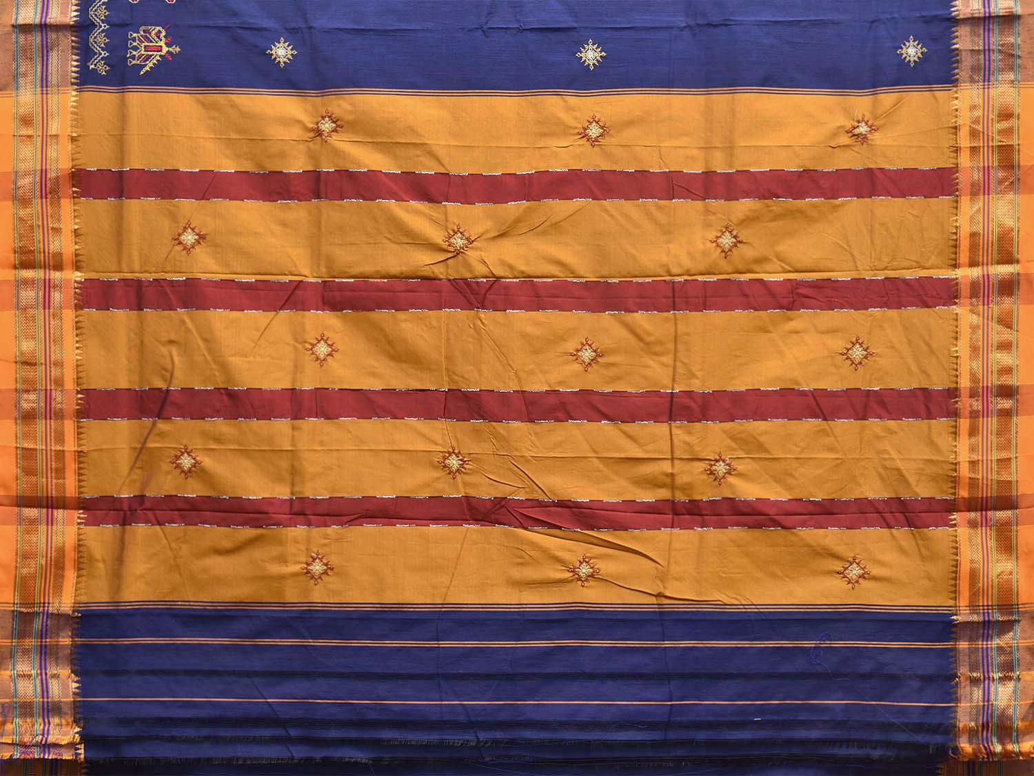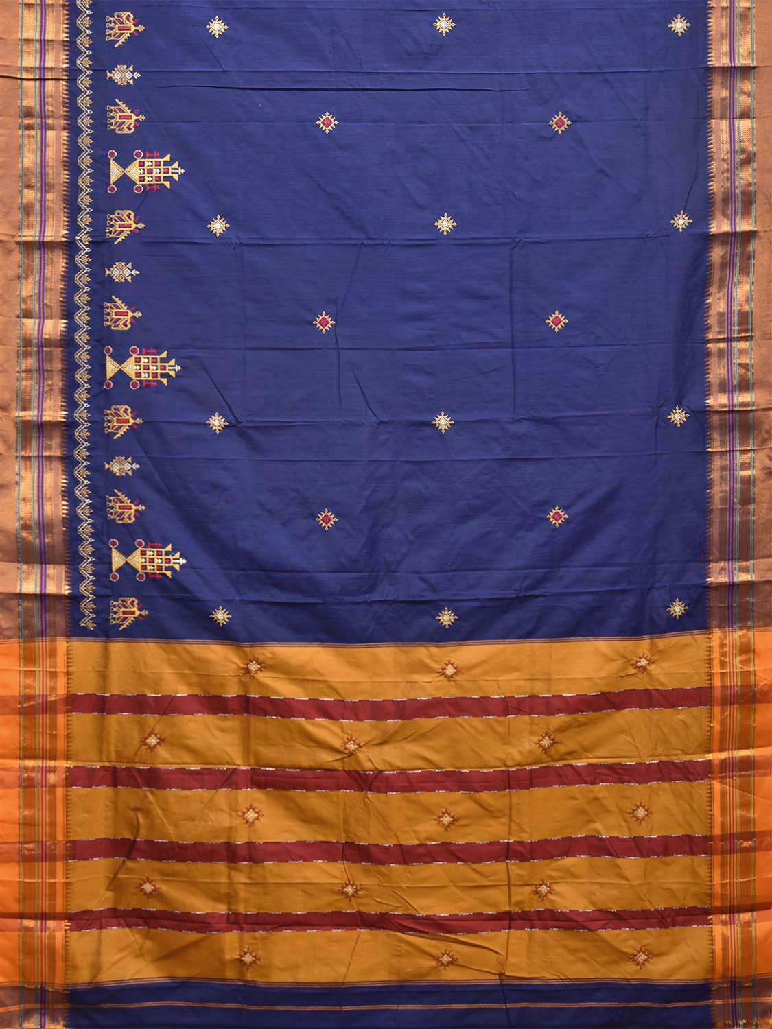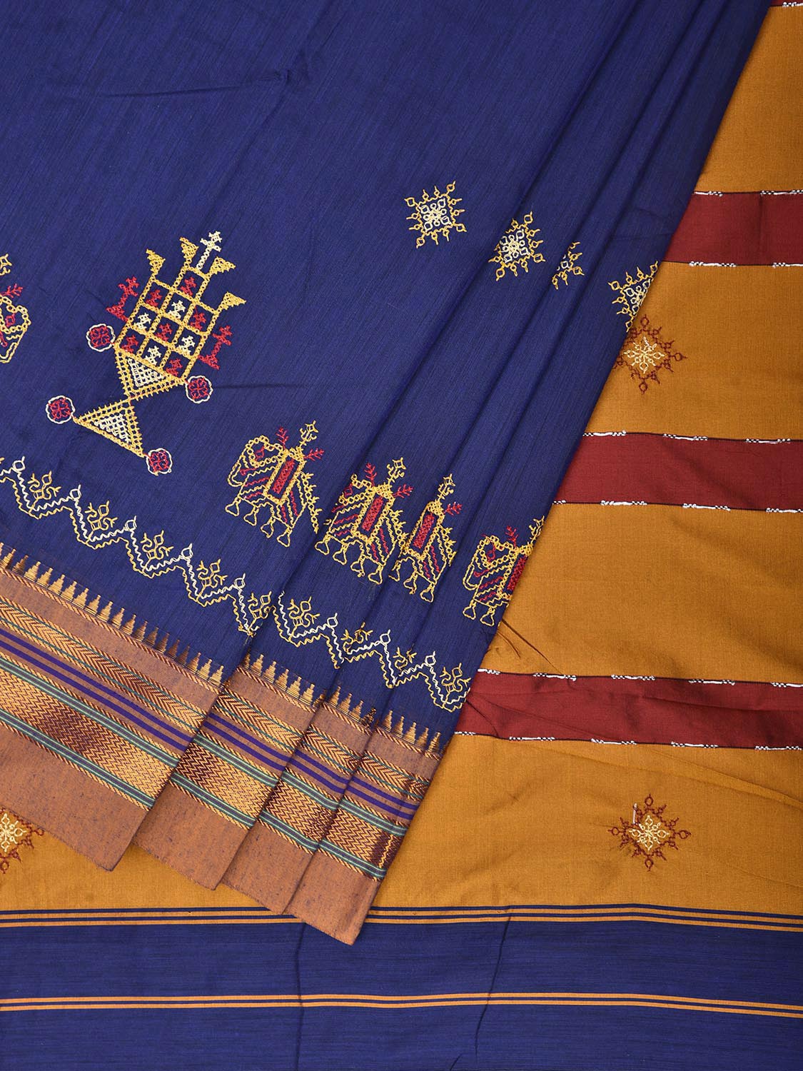 Dark Blue and Yellow Kasuti Viscose Saree with Elephants Border and Strips Pallu Design No Blouse. For fabric care we advise gentle handwash separately. This saree has no blouse.