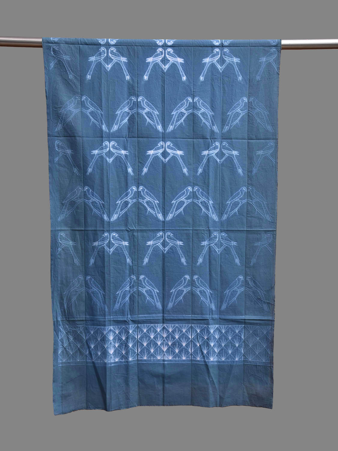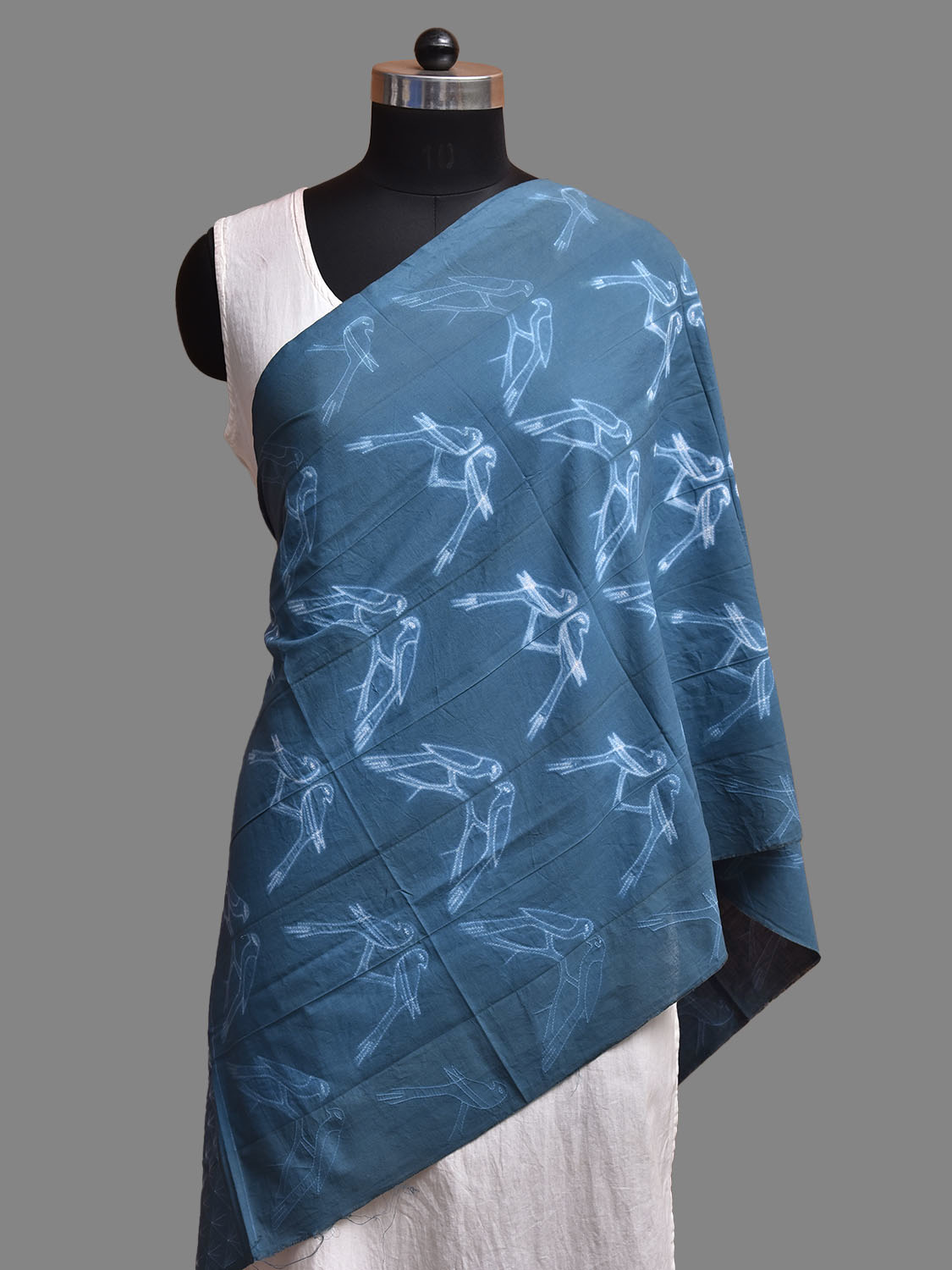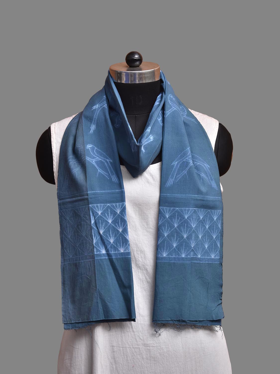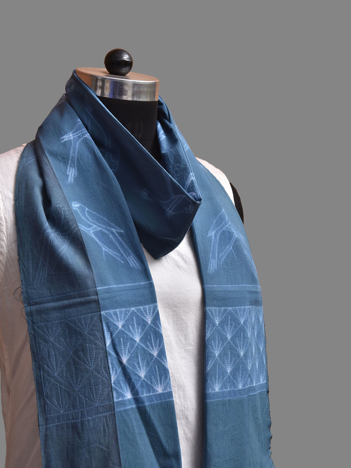 Dark Blue Shibori Sico Stole with Birds Design. Shibori is Japanese a Technique of tie and dye, and resist some parts by clamping or stitching the fabric. The result produced are unique geometric patterns & any other eloborate design. For fabric care we advise gentle handwash separately.