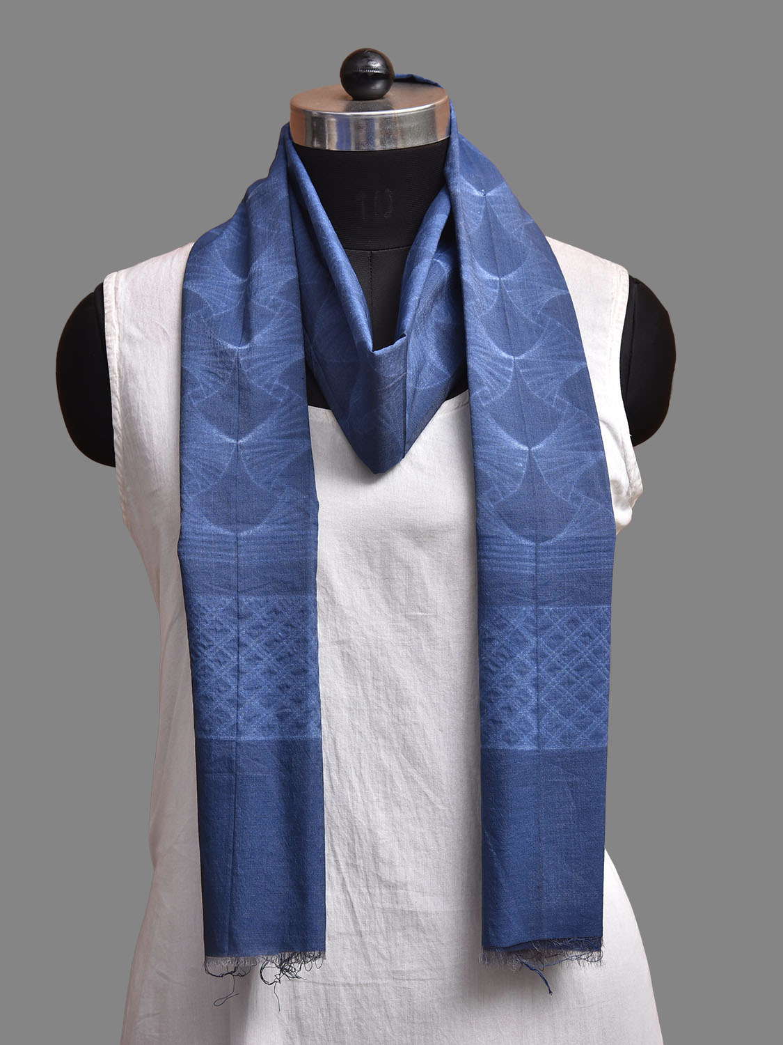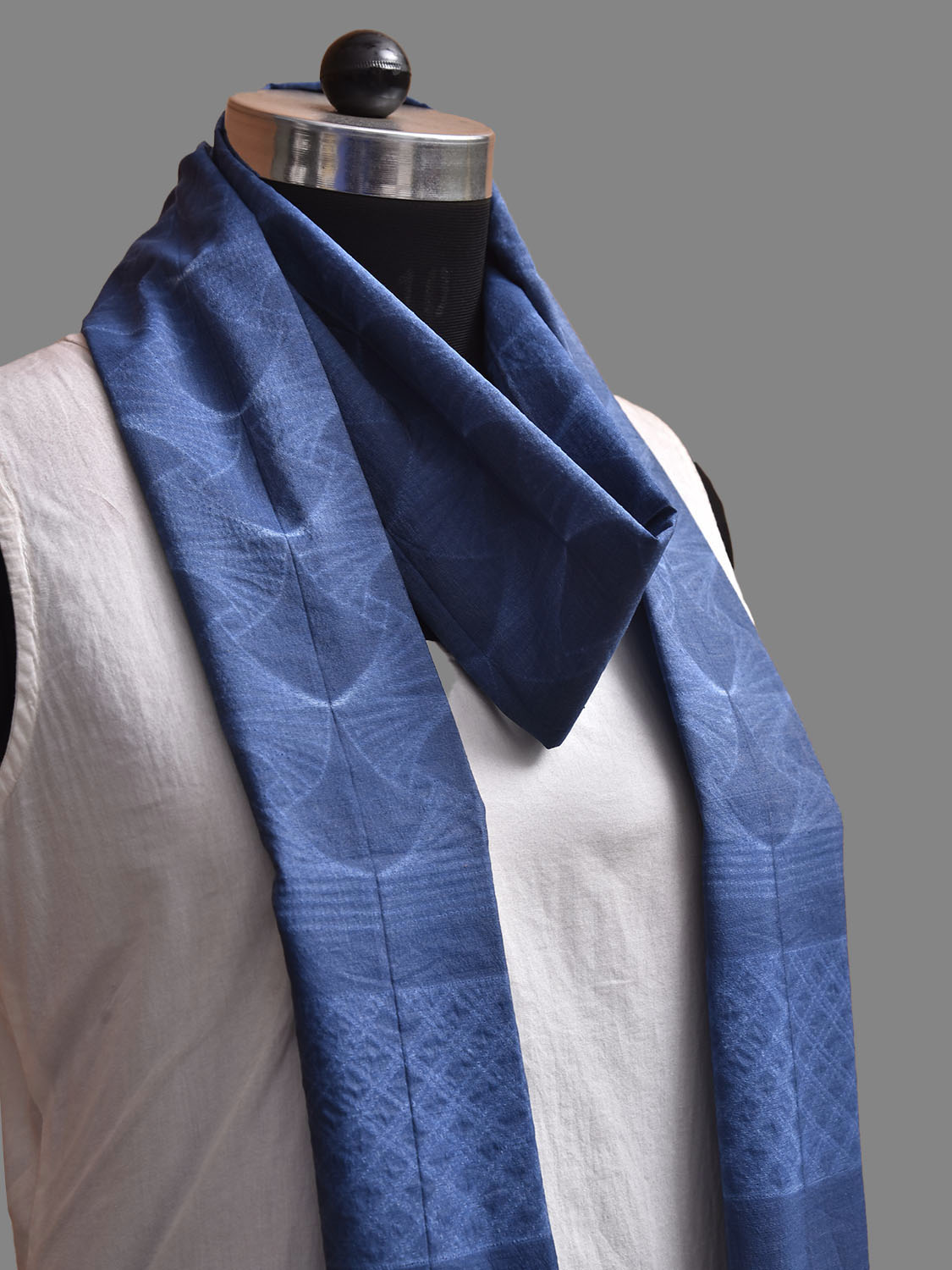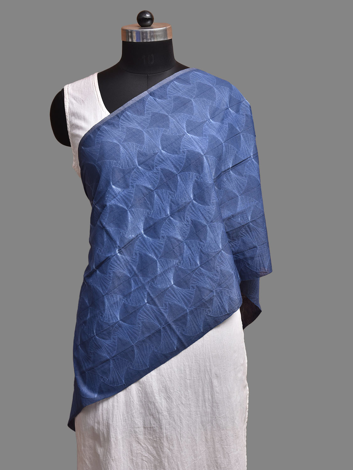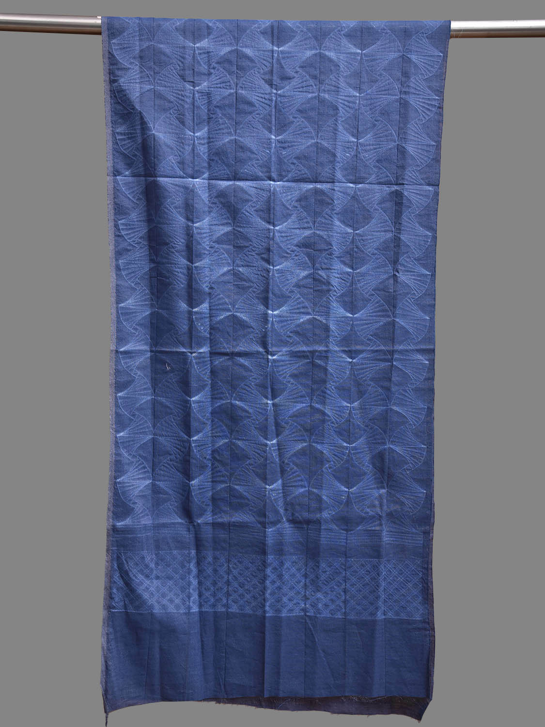 Dark Blue Shibori Tussar Stole with All Over Design. Shibori is Japanese a Technique of tie and dye, and resist some parts by clamping or stitching the fabric. The result produced are unique geometric patterns & any other eloborate design. For fabric care we advise gentle handwash separately.