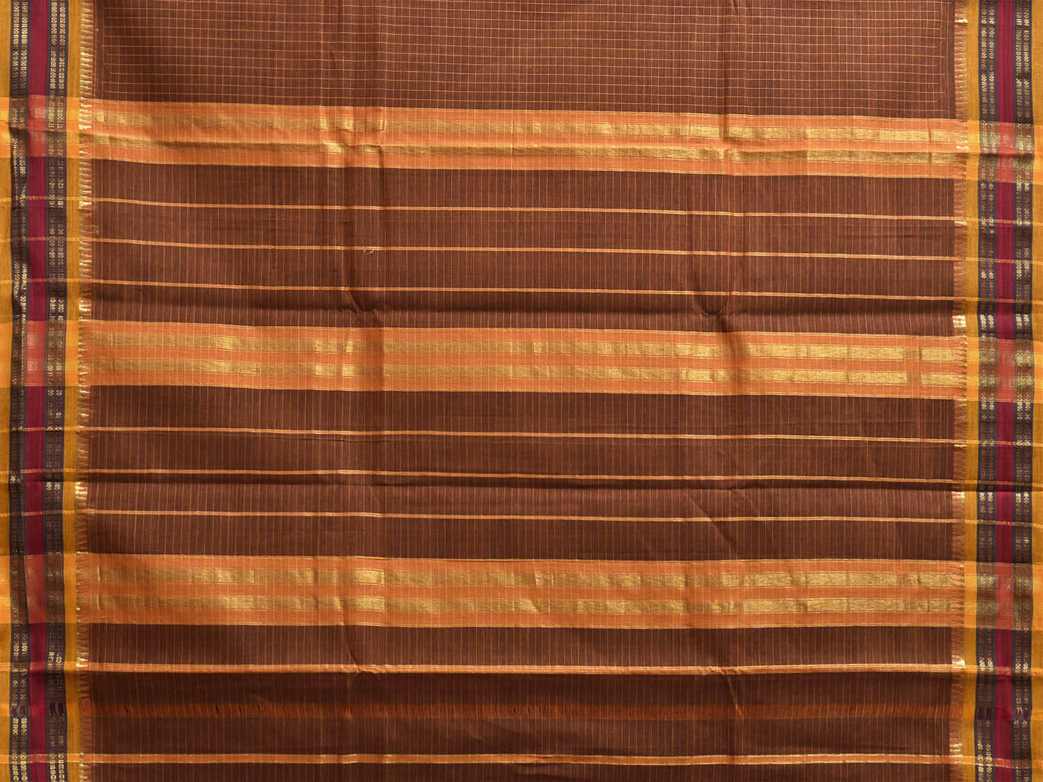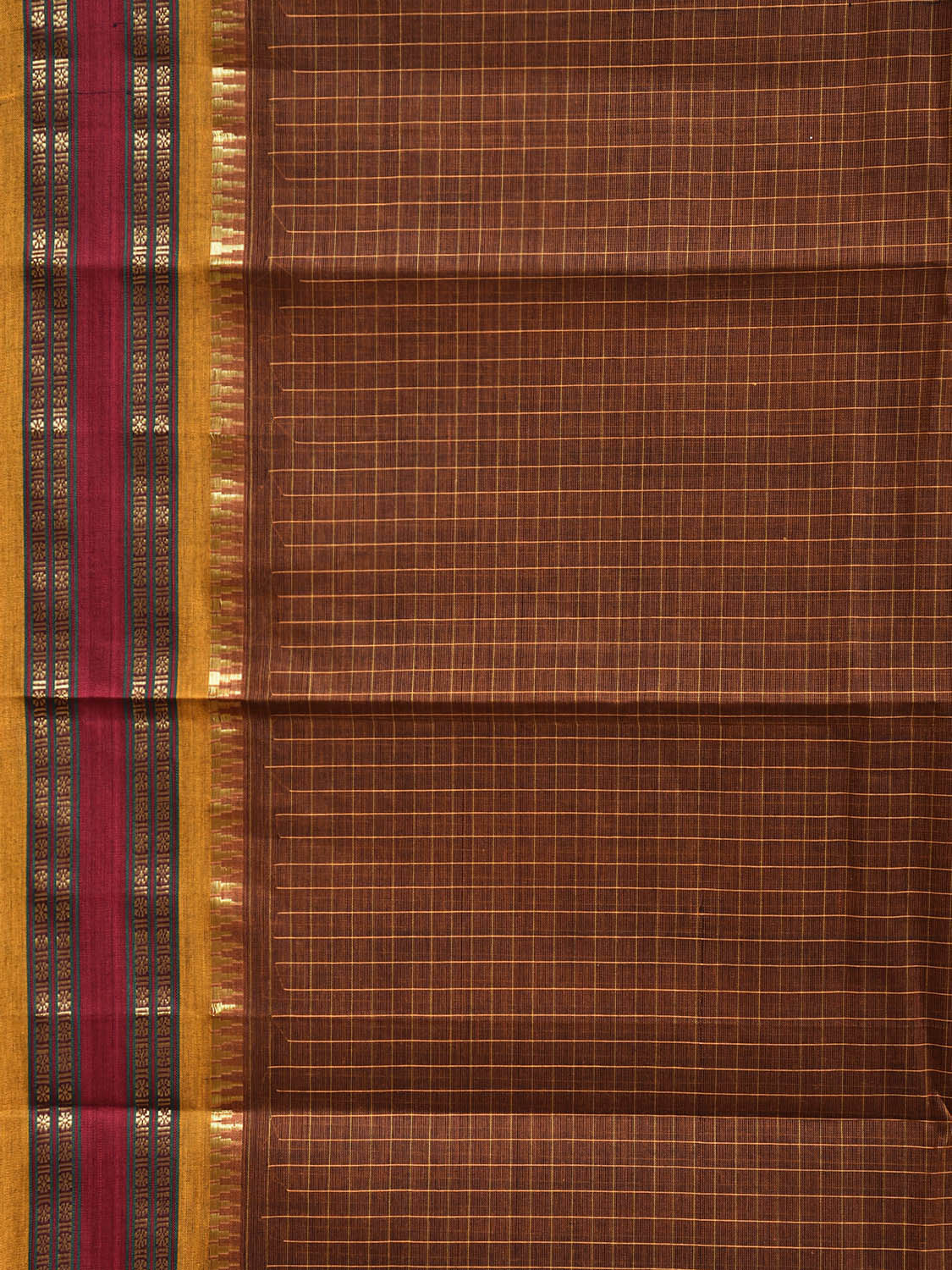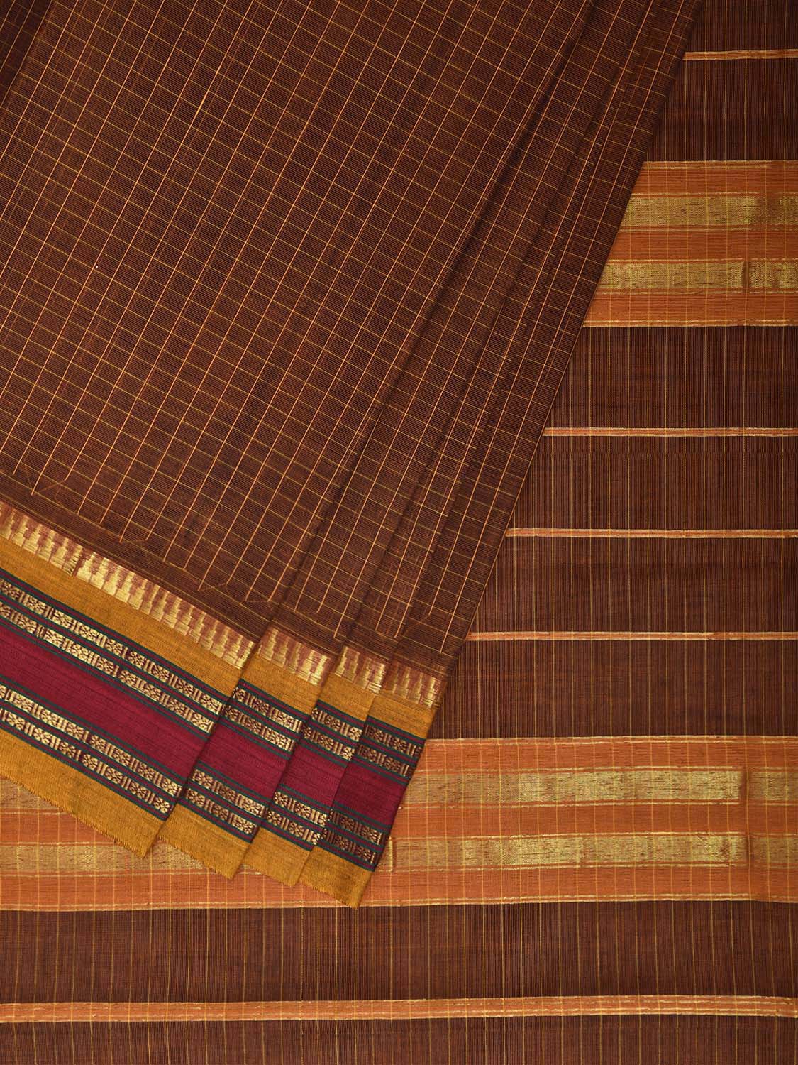 Dark Fawn and Yellow Narayanpet Cotton Handloom Saree with Checks Design No Blouse. This saree has no blouse.