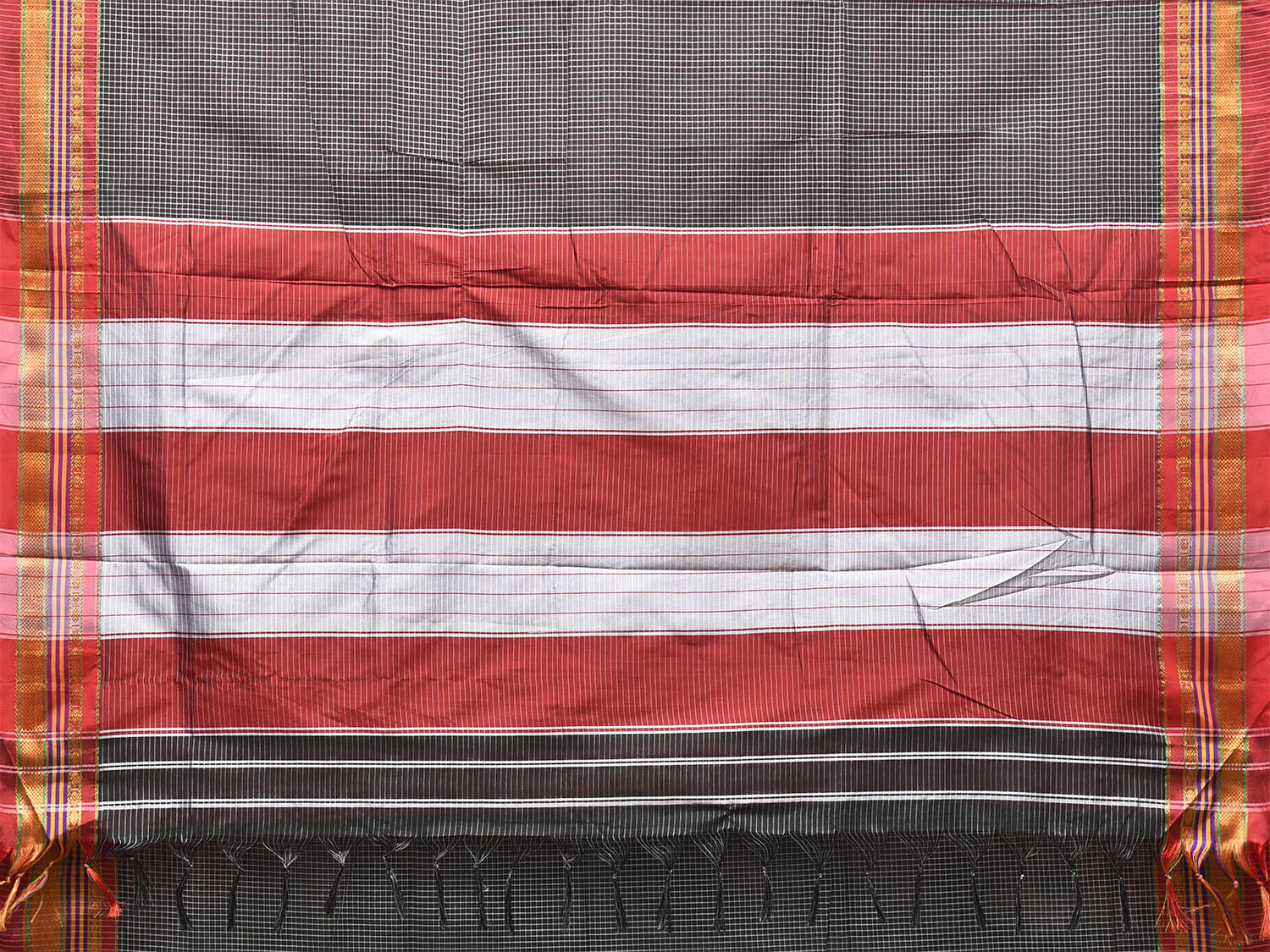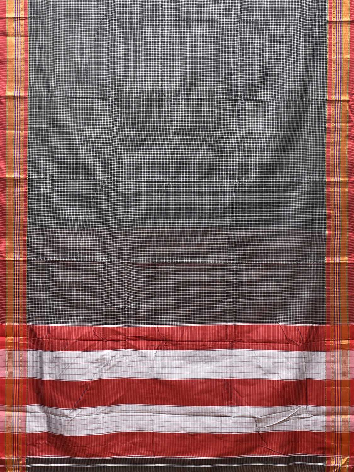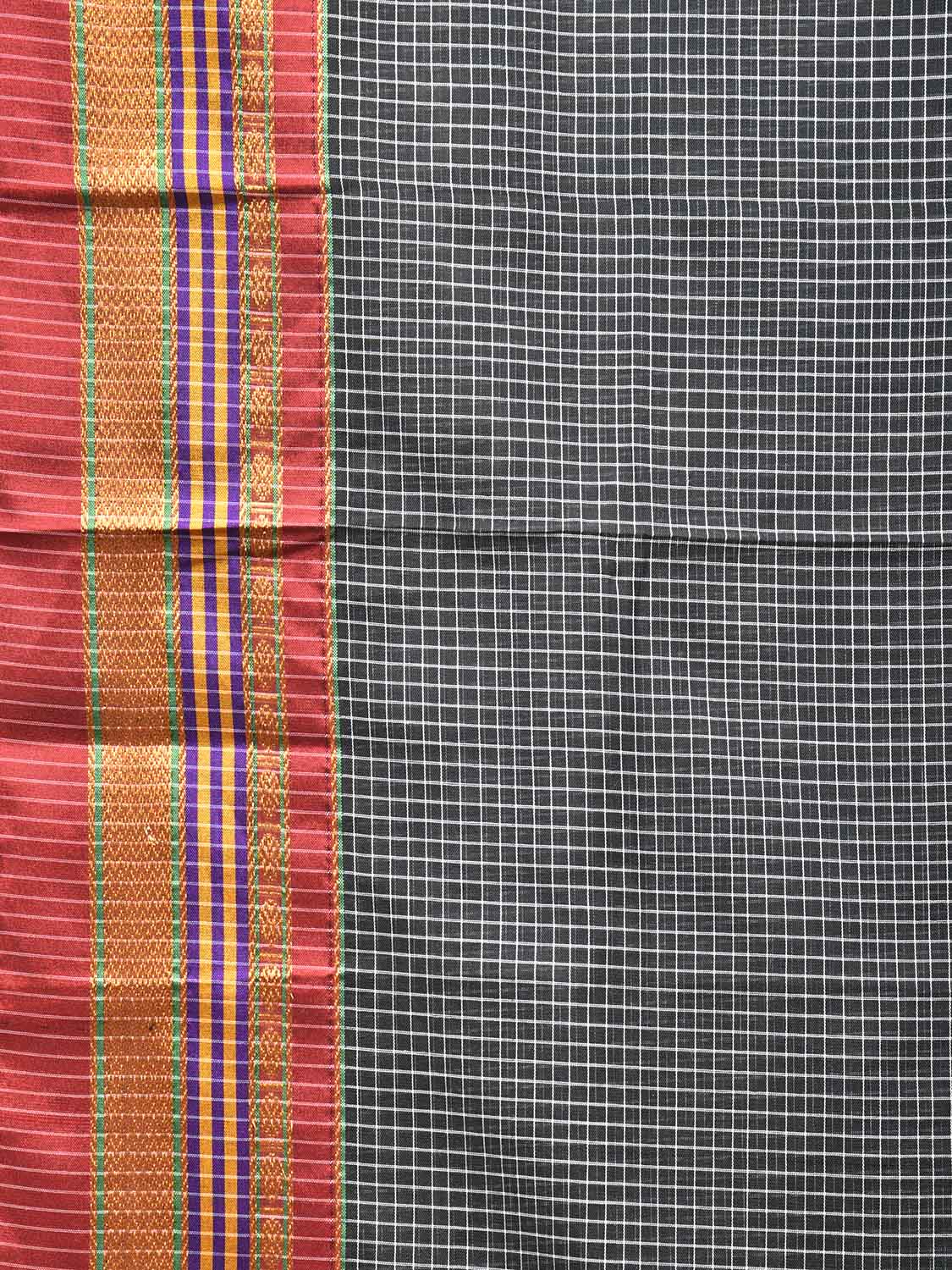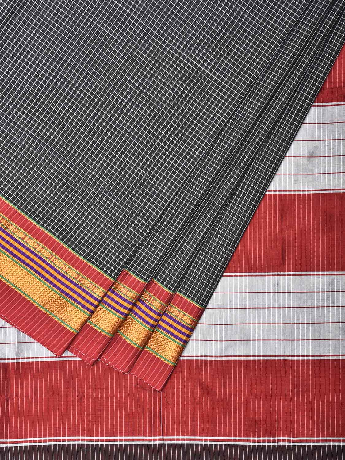 Dark Green and Red ilkal Cotton Viscose Saree with Small Checks and Strips Pallu Design. For fabric care we advise gentle handwash separately.