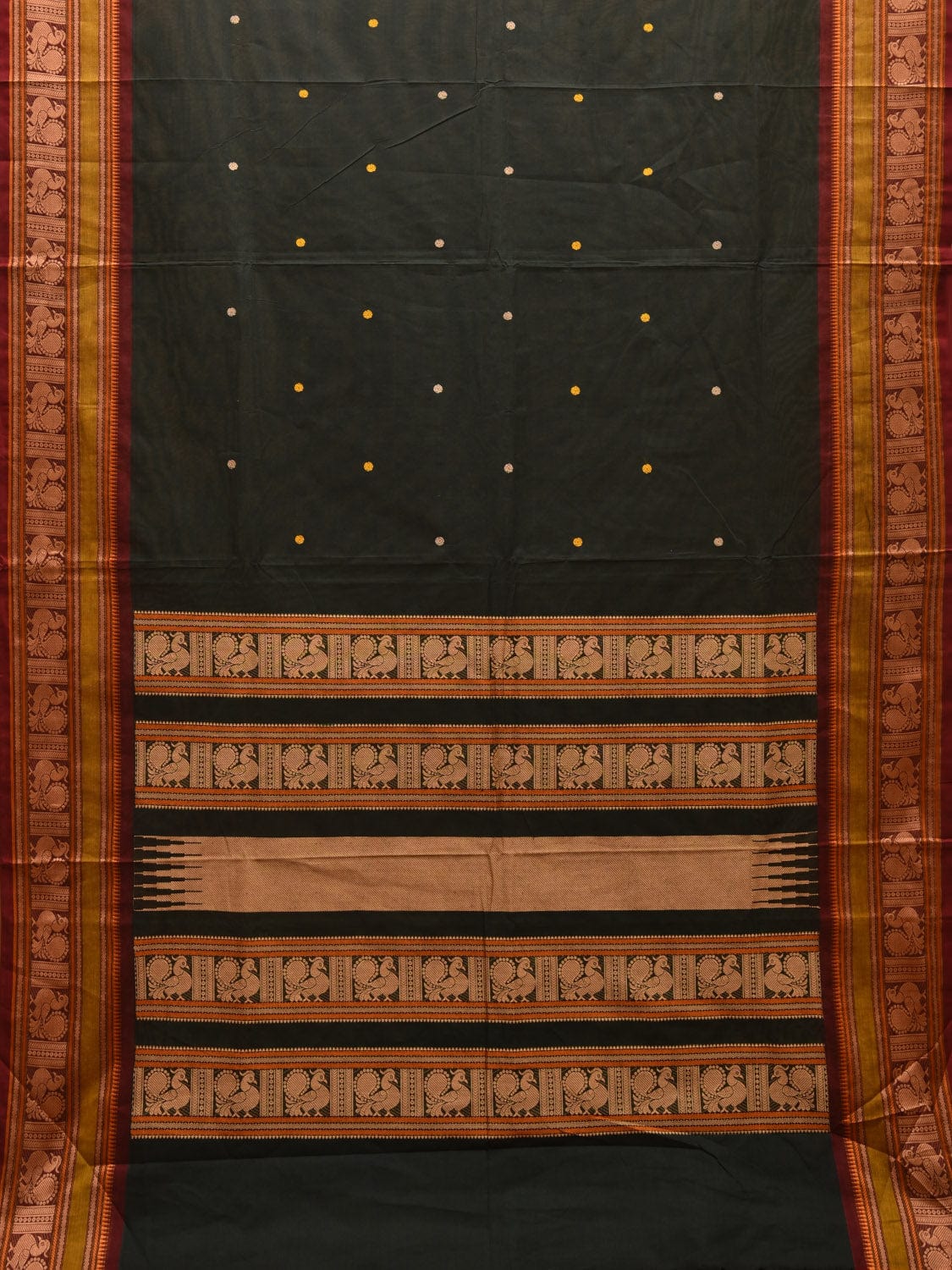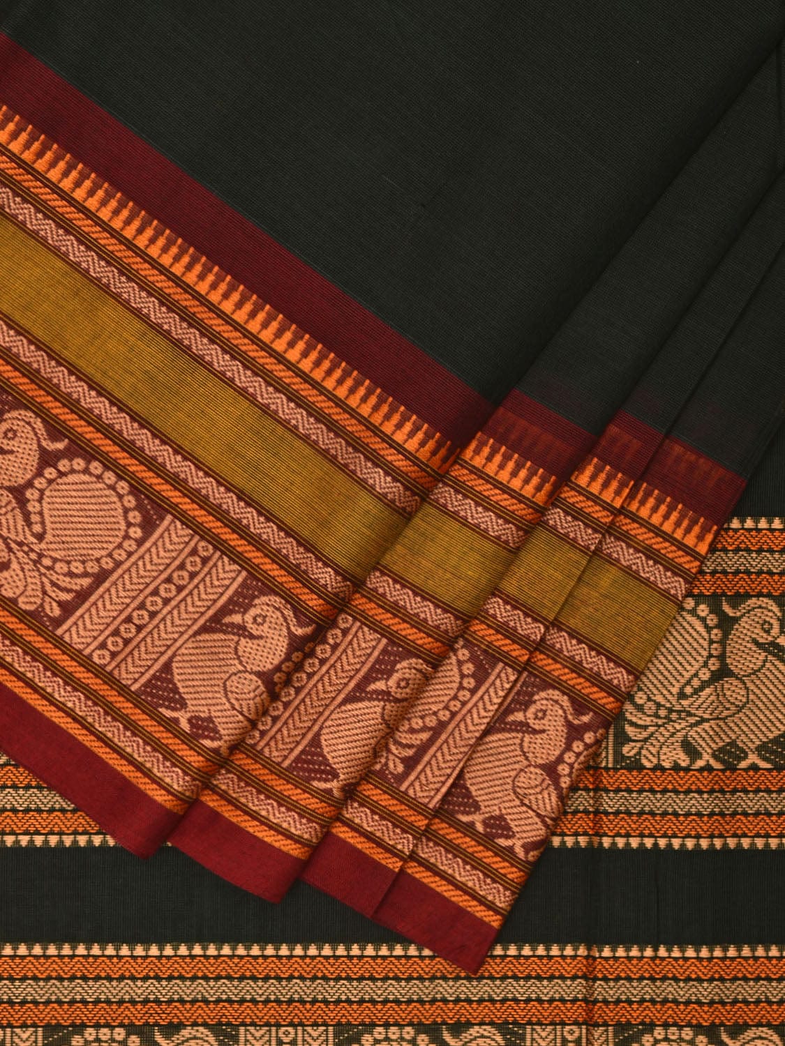Dark Green Kanchipuram Cotton Saree with Peacock Pallu and Border Design. Traditional Simple South Indian Attire Saree for any Casual Occasions. As it’s a cotton saree we advice gentle handwash separately for fabric care.