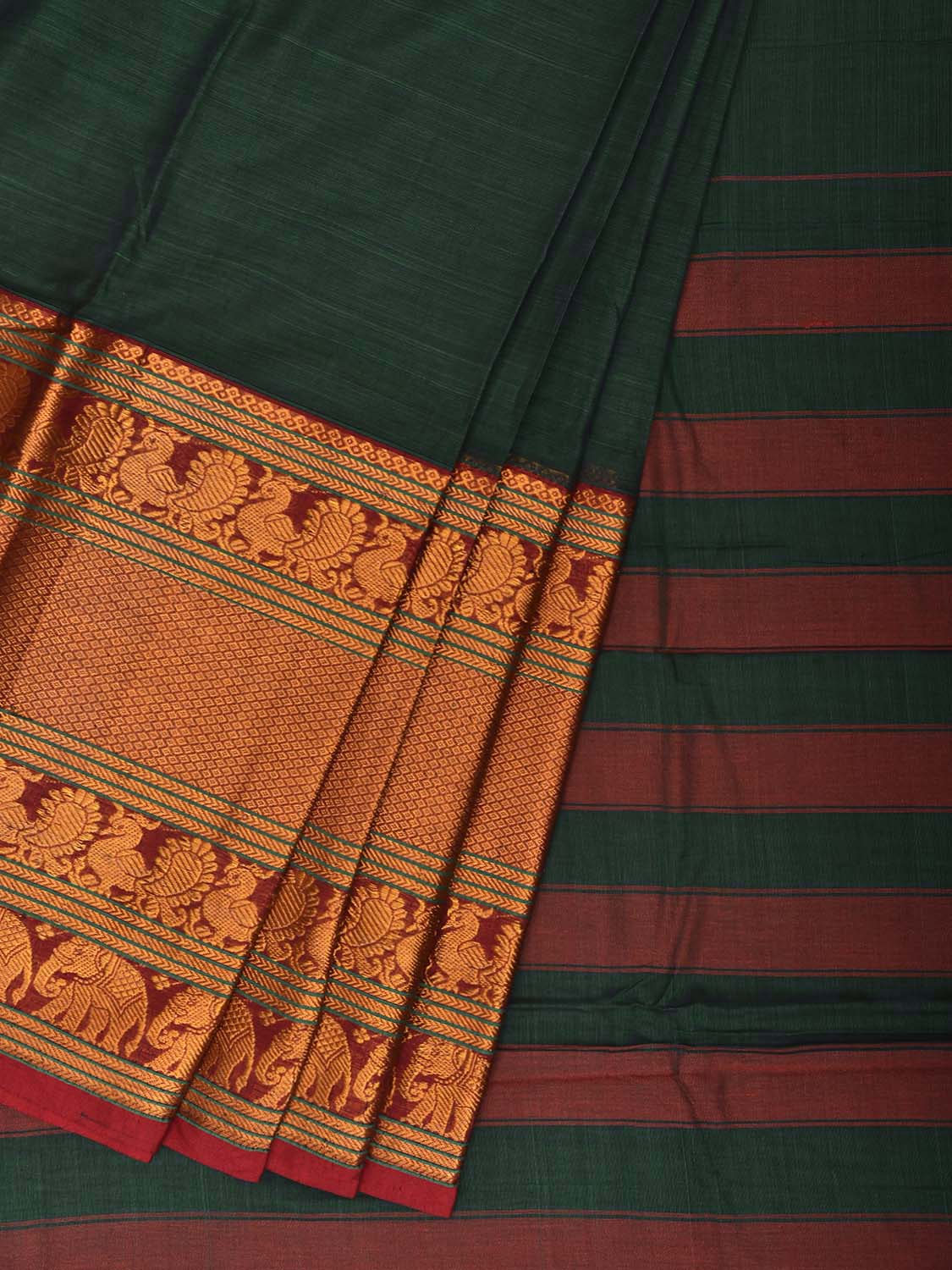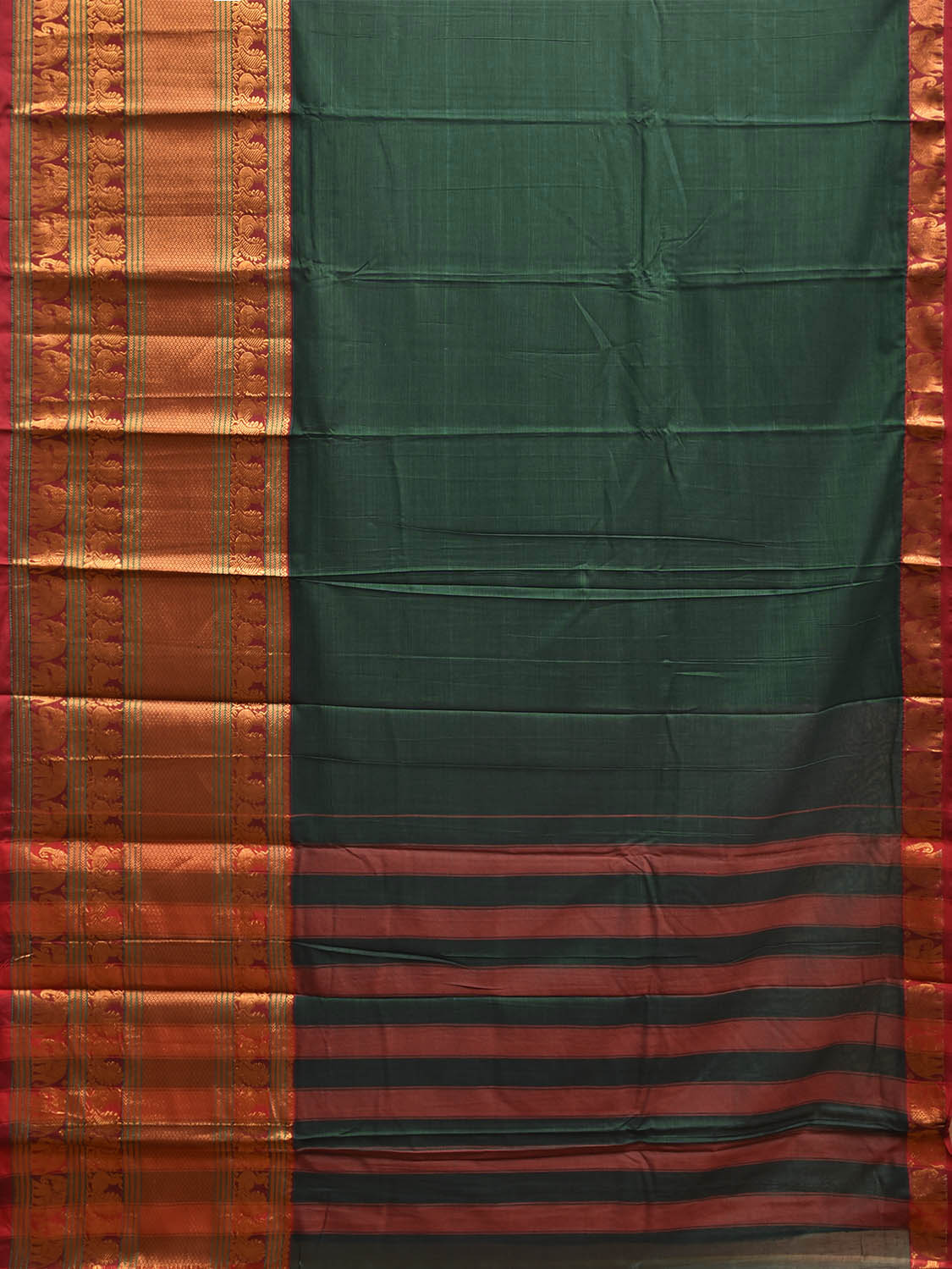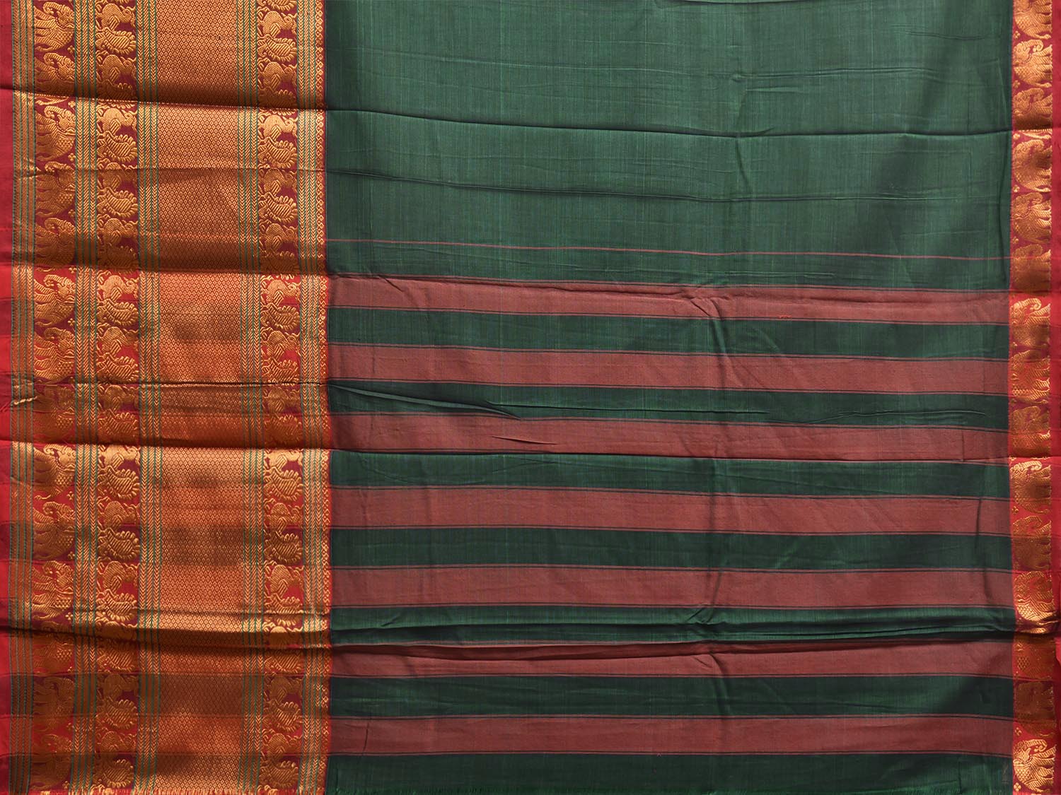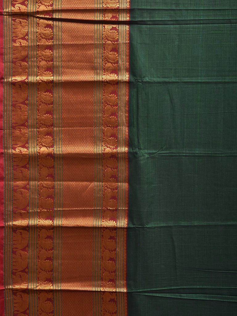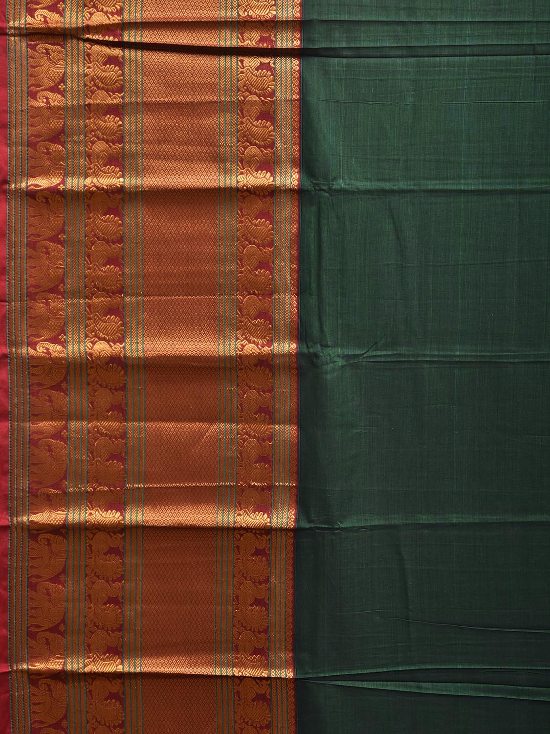 Dark Green Madurai Cotton Plain Saree with Kanchipuram Border Design No Blouse. Traditional Simple South Indian Attire Saree for any Casual Occasions. As it’s a cotton saree we advice gentle handwash separately for fabric care. This saree has no blouse.