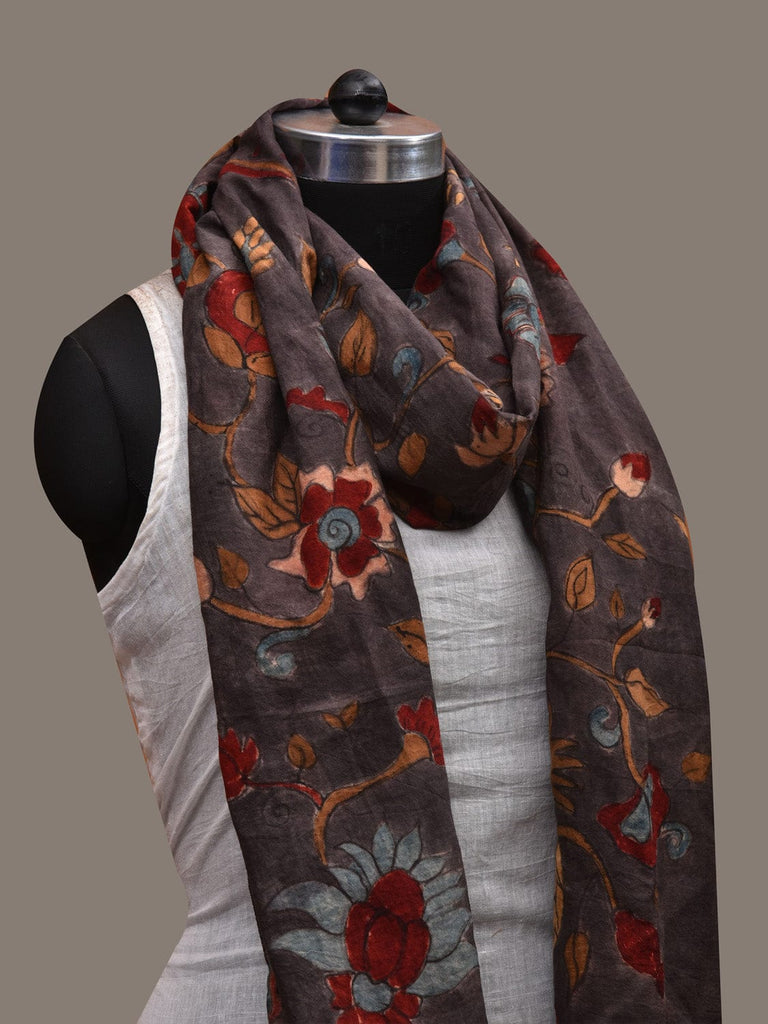 Dark Grey Kalamkari Hand Painted Cotton Handloom Stole with Exotic Flowers Design. This hand painted kalamkari is done using natural dyes. As they are natural colors they bleed with initial washes, so we suggest Dry clean.