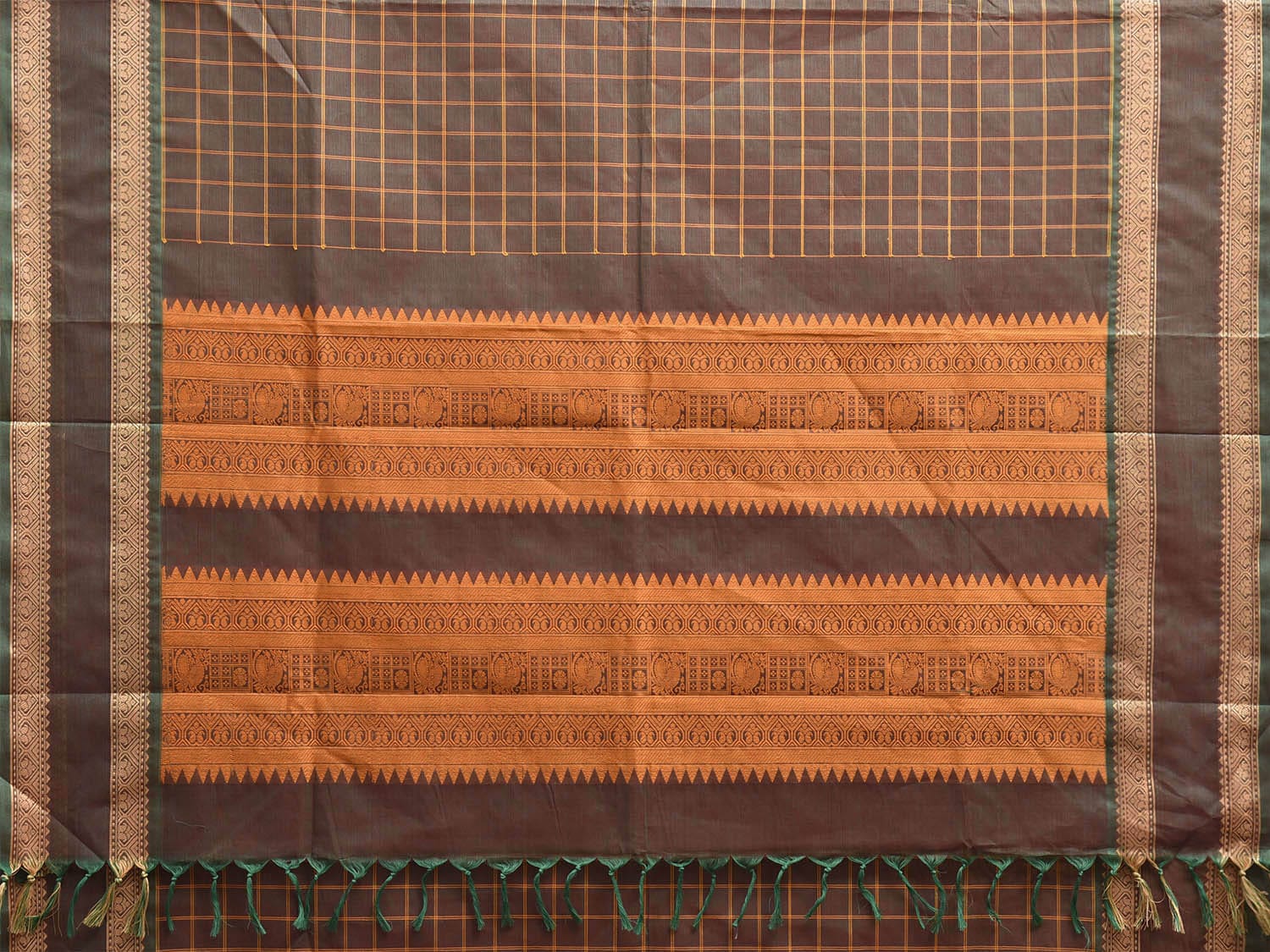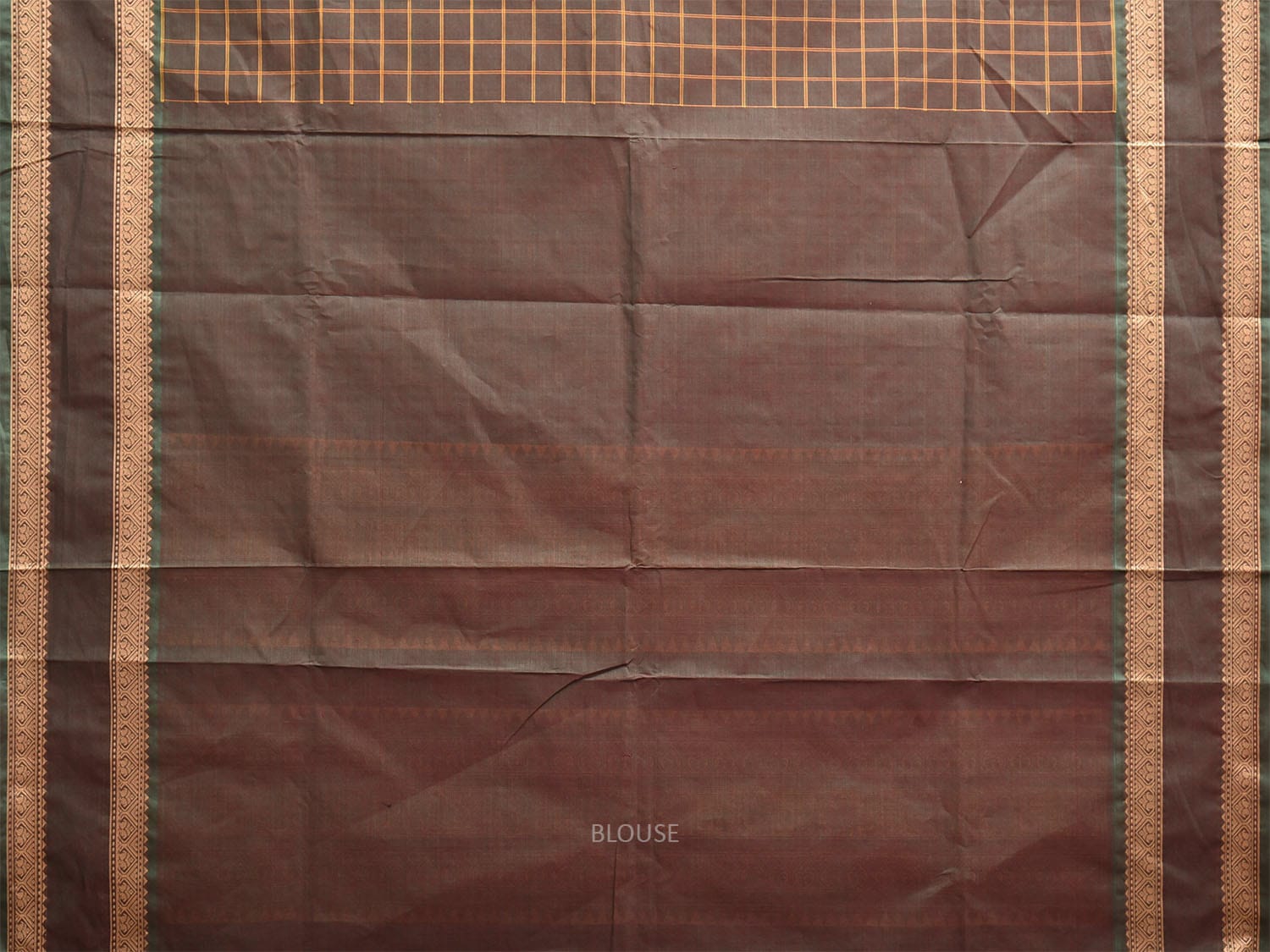 Dark Khaki Kanchipuram Cotton Saree with Checks and Pallu Design. Traditional Simple South Indian Attire Saree for any Casual Occasions. As it’s a cotton saree we advice gentle handwash separately for fabric care.