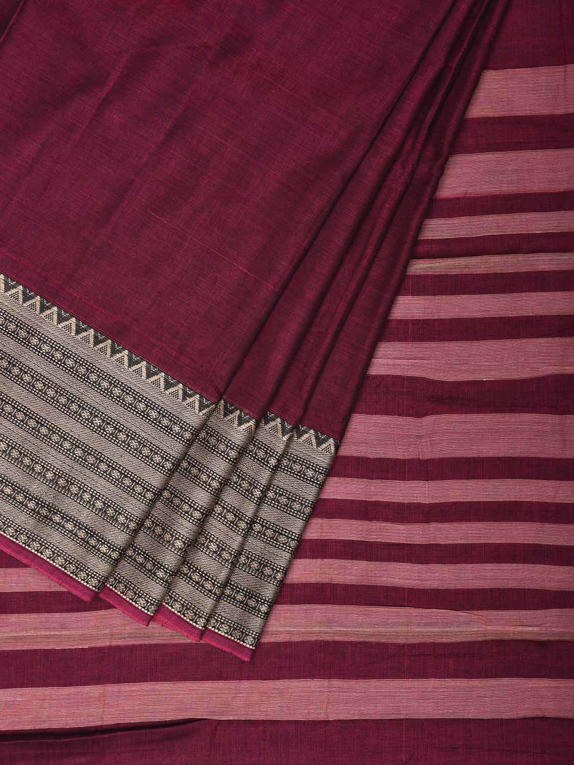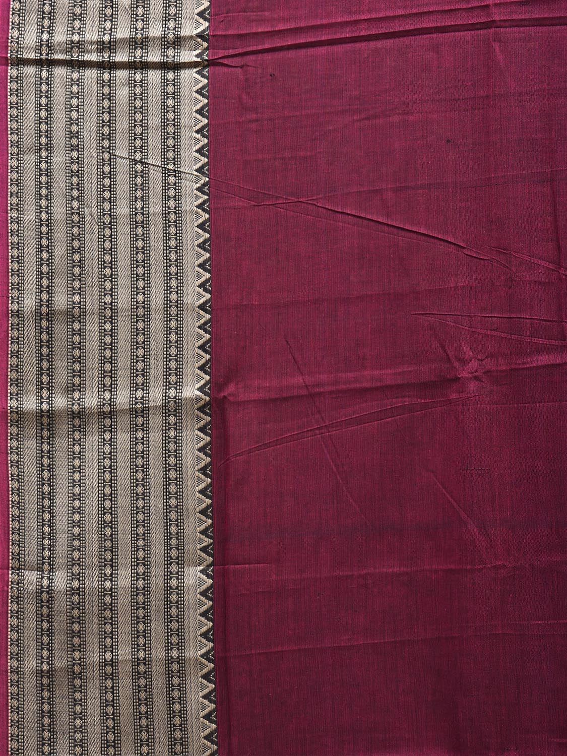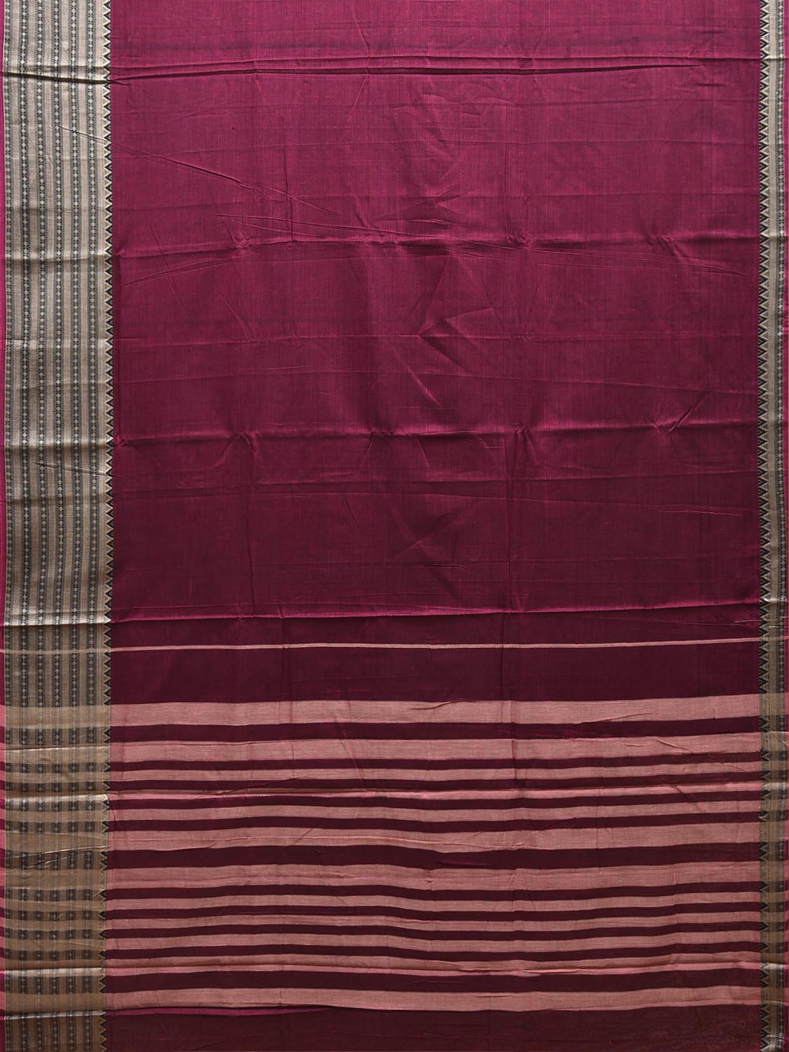 Dark Magenta Kanchipuram Cotton Plain Saree with Strips Pallu and Border Design No Blouse. Traditional South Indian Attire Saree for any Special Occasions. For fabric care we advice dry clean. This saree has no blouse.