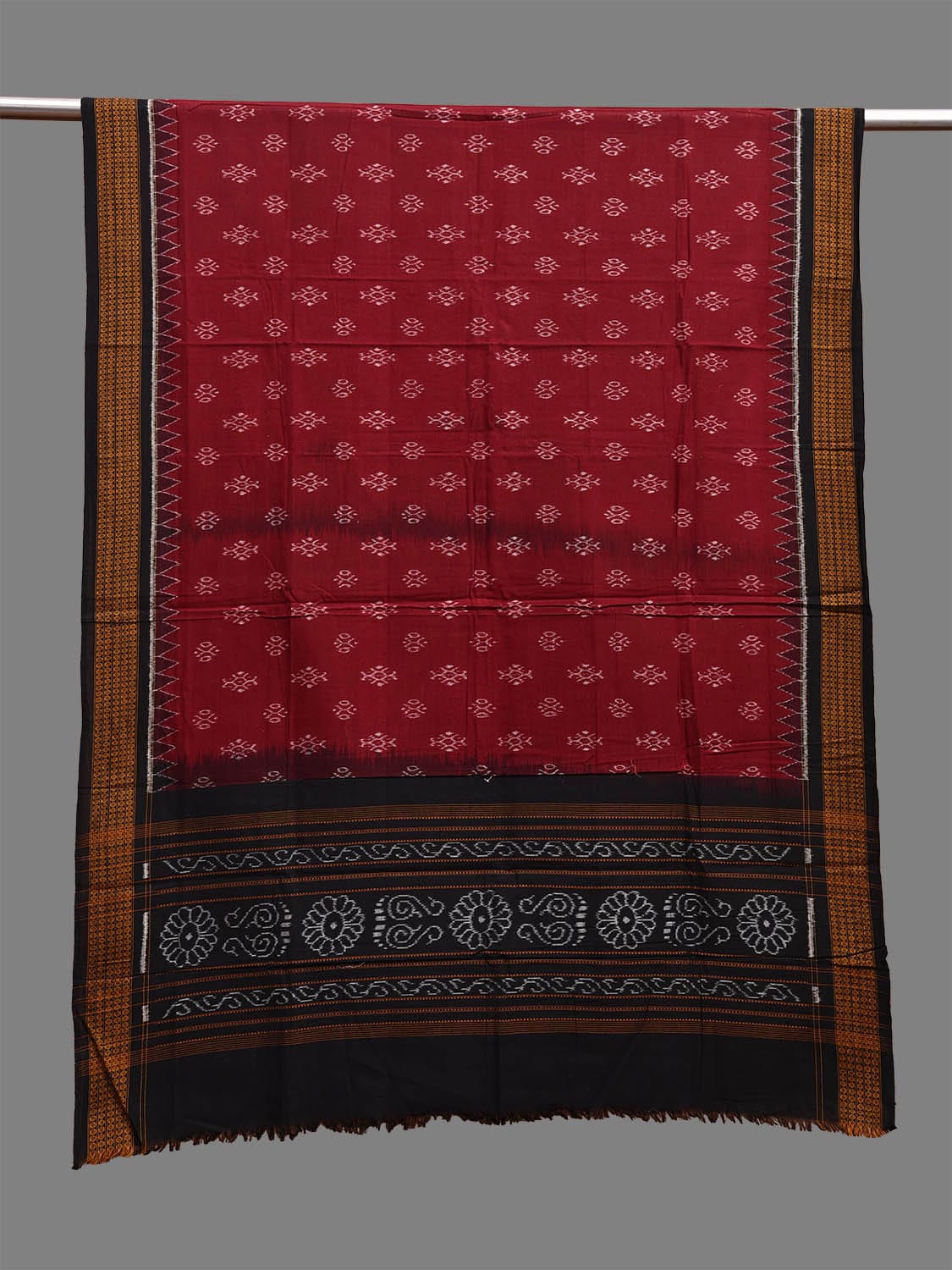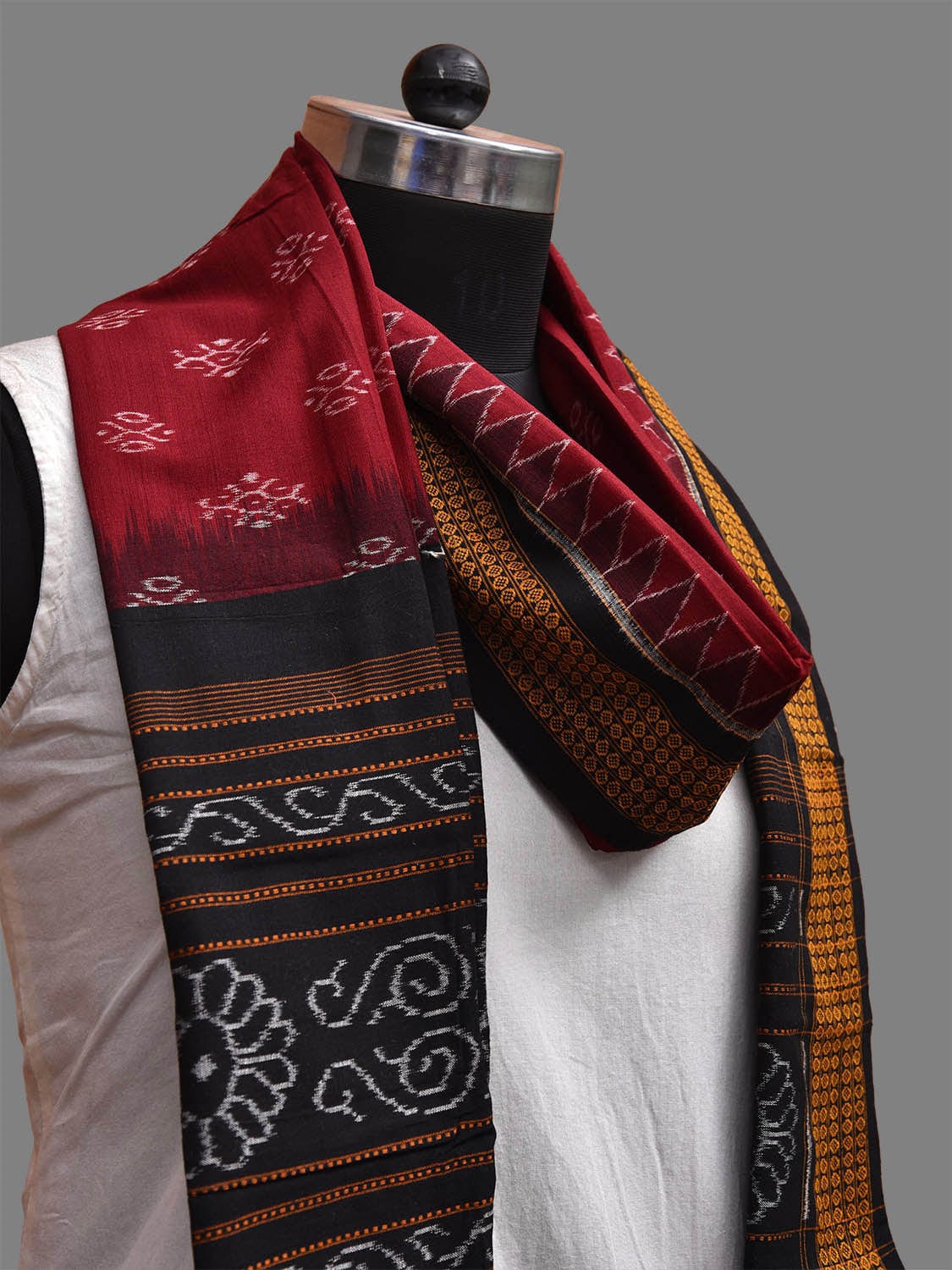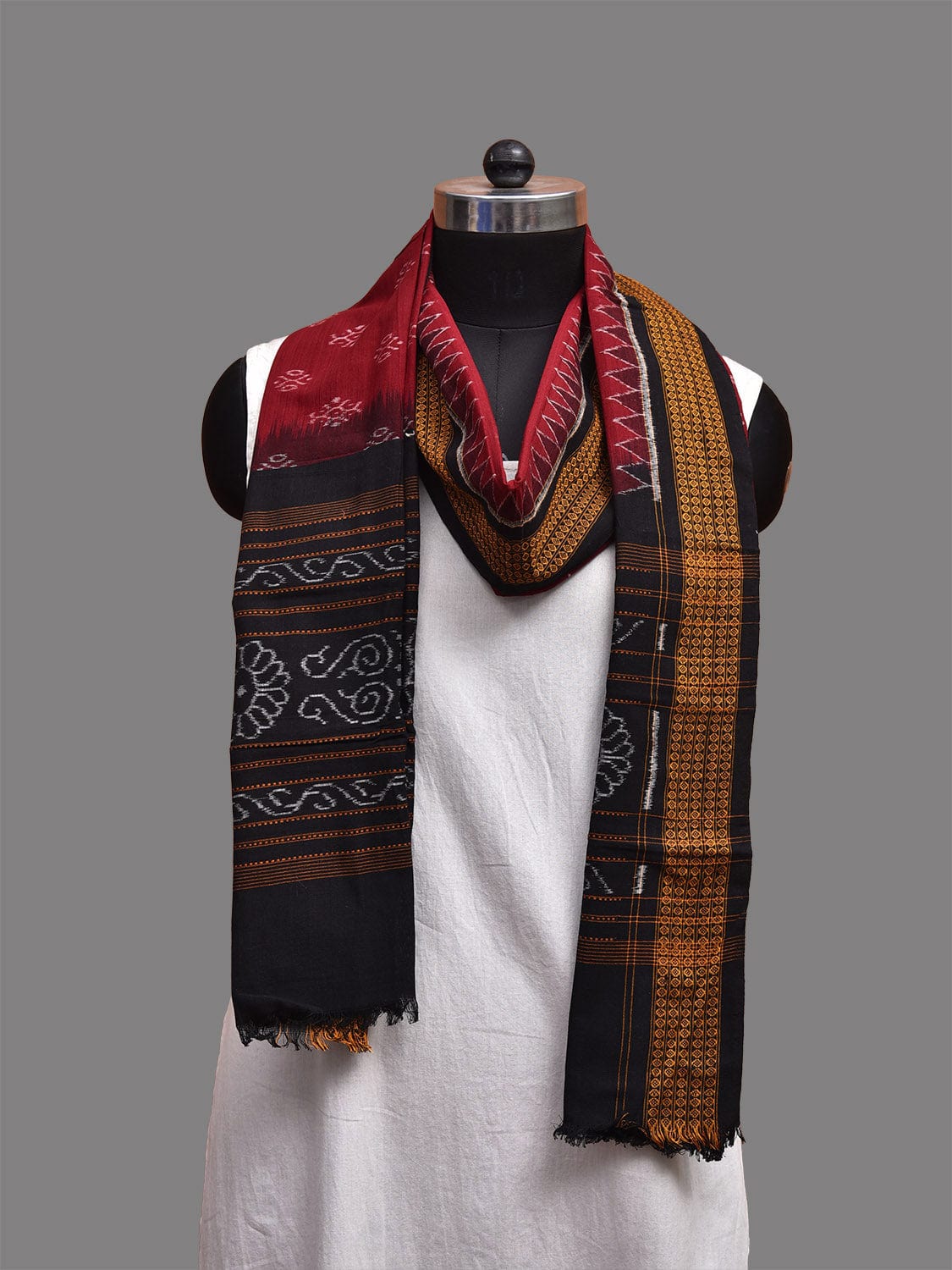 Dark Red and Black Orissa Double Ikat Cotton Handloom Dupatta with Body Buta Design. This Handloom Saree from Orissa has been woven using the resist-dyeing, which produces the unique patterns adorning the fabric. We advise Gentle Handwash Separately for fabric care.